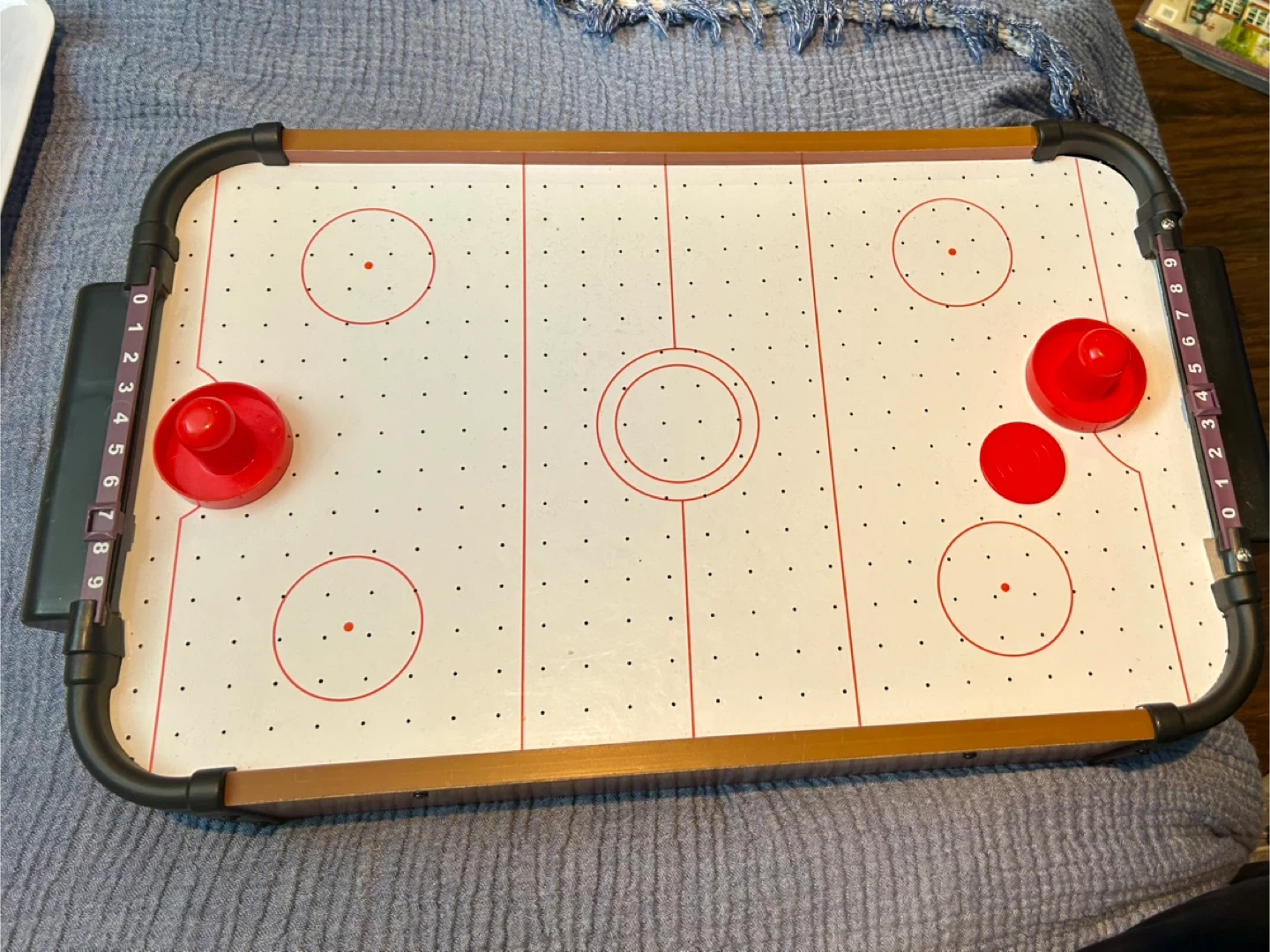 Enjoy some friendly competition with this tabletop air hockey game! It comes with two red paddles and two red pucks for fast-paced fun. The integrated score trackers make keeping score a breeze. Uses batteries. No box.