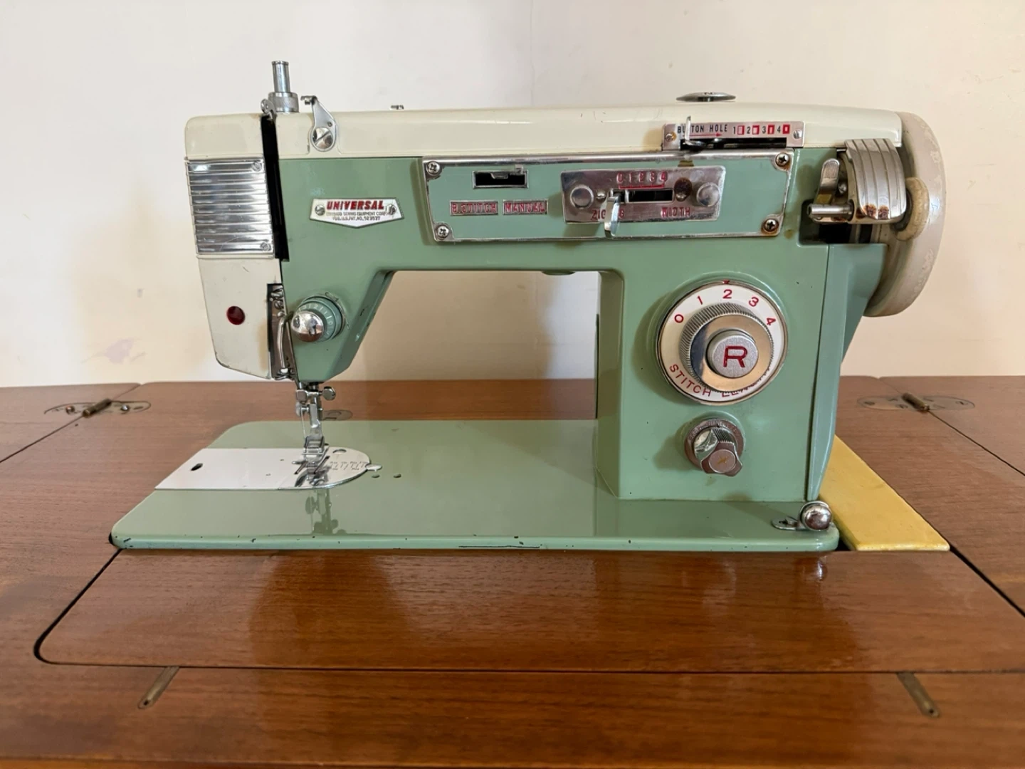 Vintage Universal sewing machine and matching wooden table with drop-leaf sides. Includes a padded stool. This set's perfect for any sewing enthusiast looking for a classic piece!