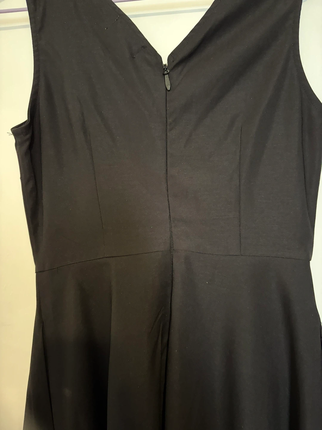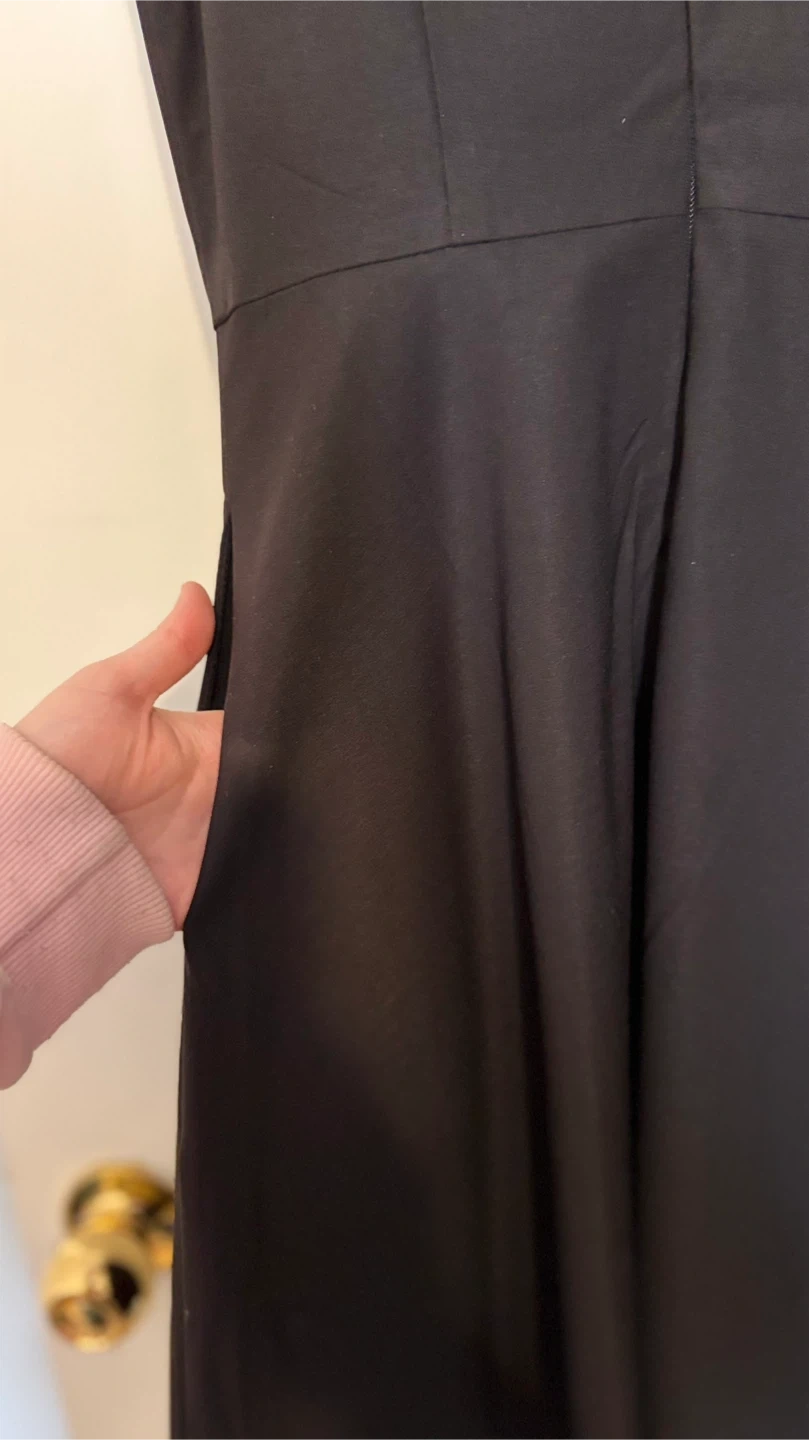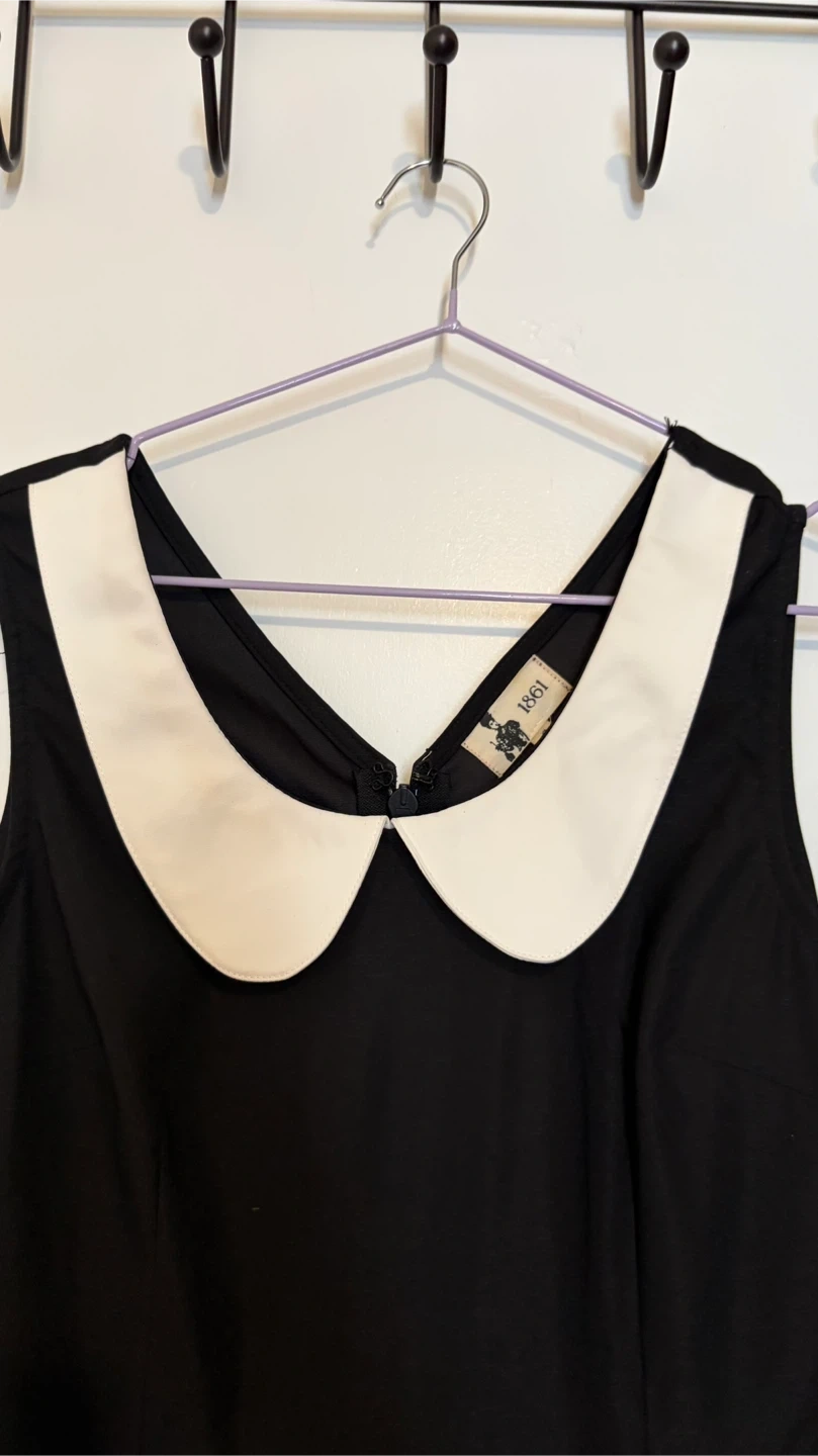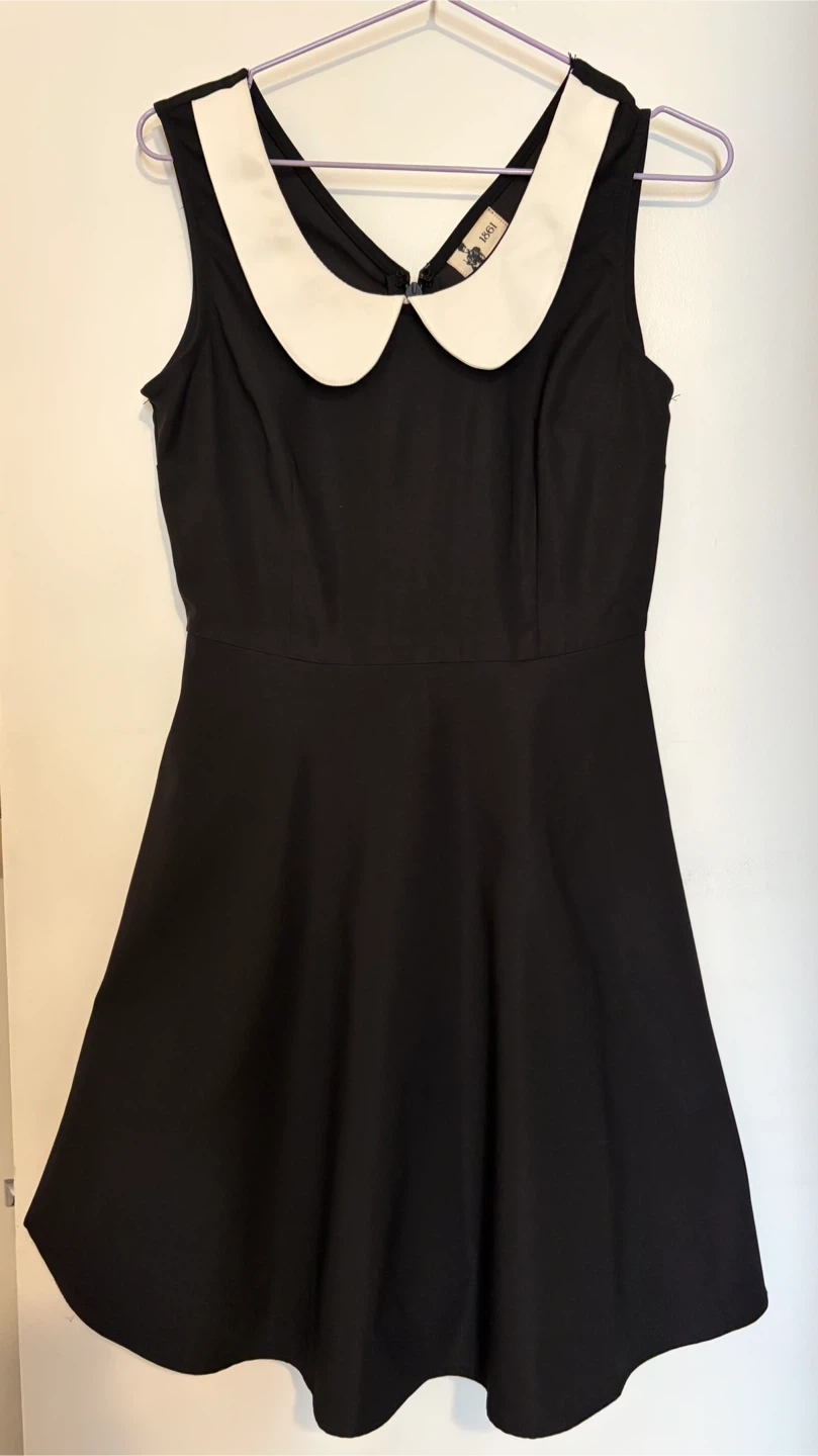 This is a black sleeveless dress from Montreal brand: Boutique 1861. It features a white Peter Pan collar and two side pockets. The dress is a size small. Probably fits size 4.