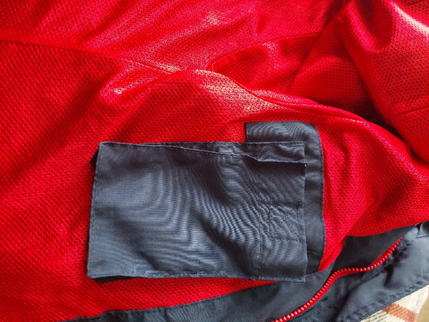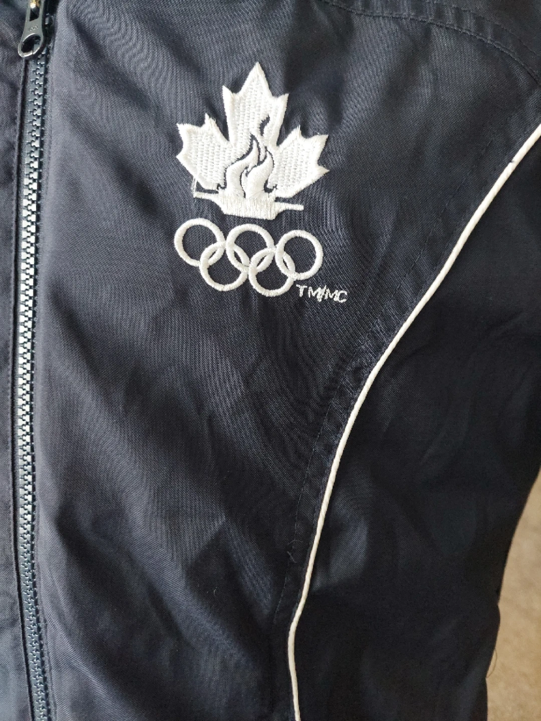 Here's a Canada Olympics jacket in good condition! It's a navy blue colour with a maple leaf and the Olympic rings on the front. The back has 'CANADA' printed in red. The inside is lined with red mesh.