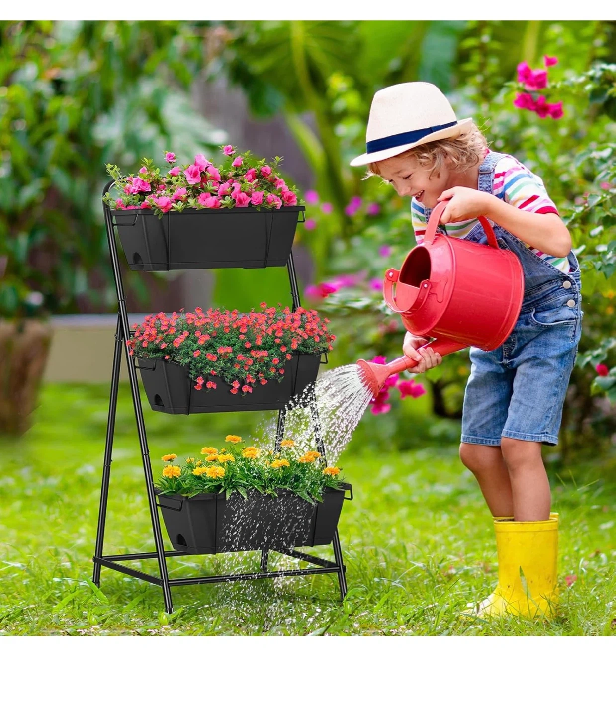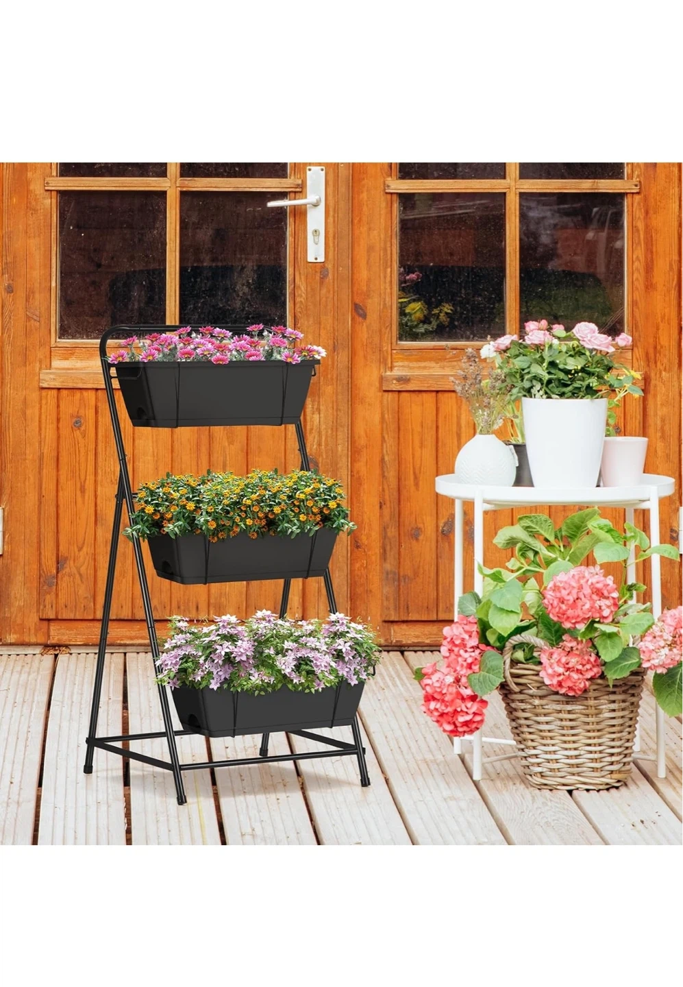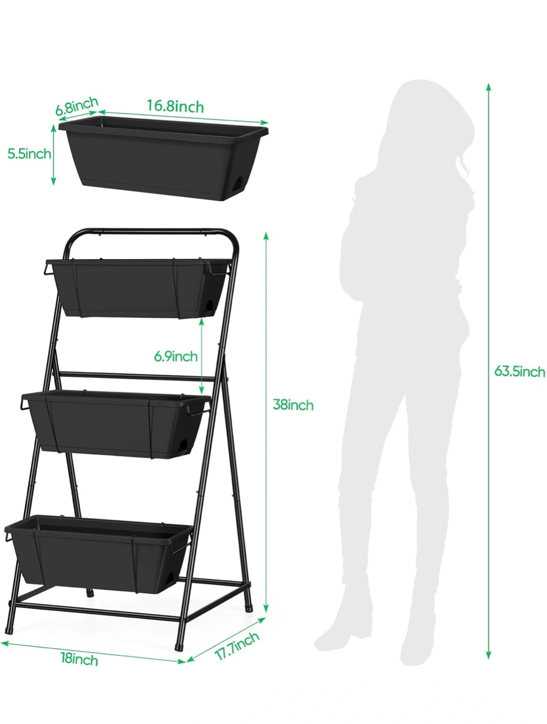 This black 3-tier vertical garden planter features three removable trays with drainage holes. Its durable metal shelf has a stable triangle structure for added support. Overall dimensions are 38 inches tall and 17.7 inches wide.