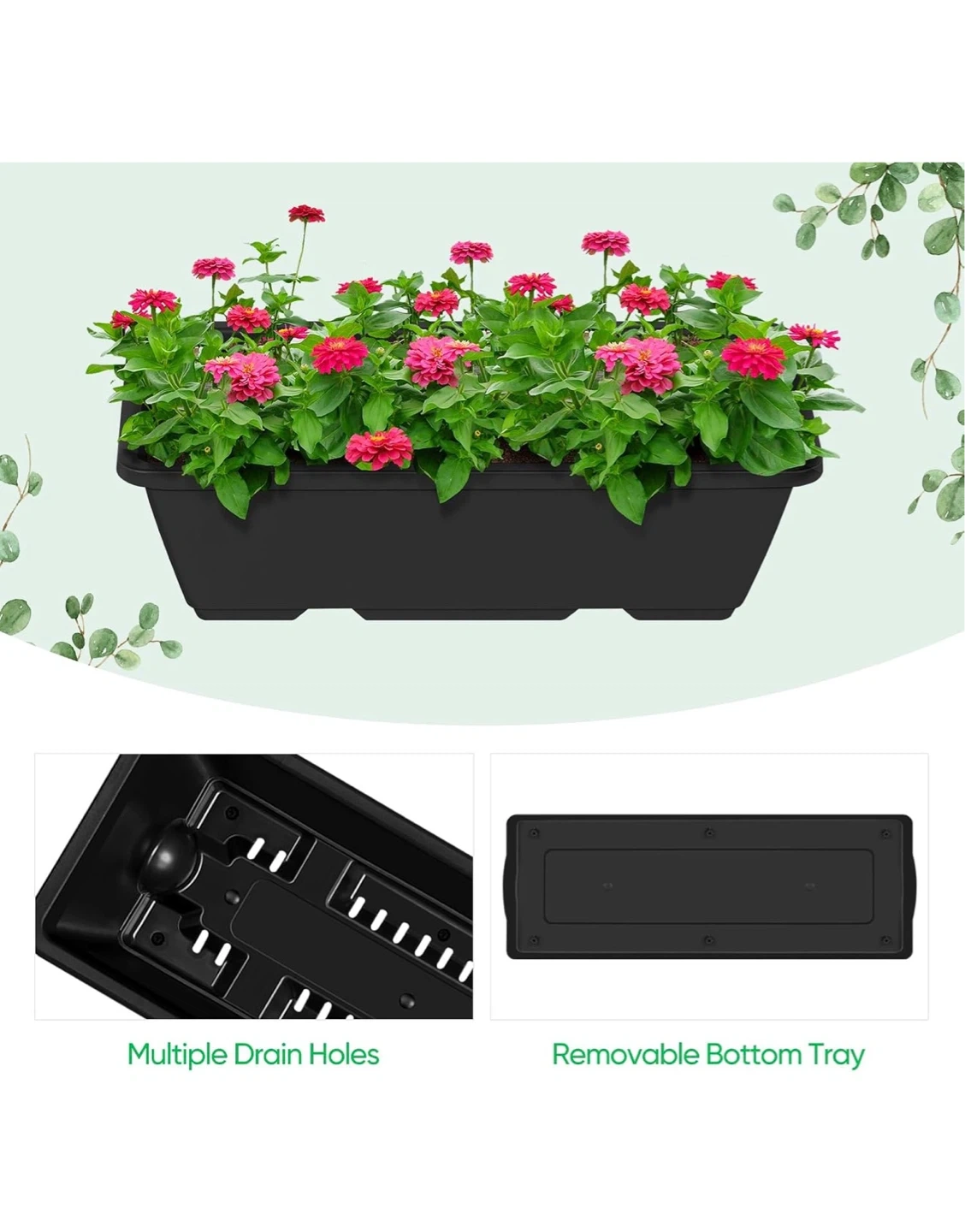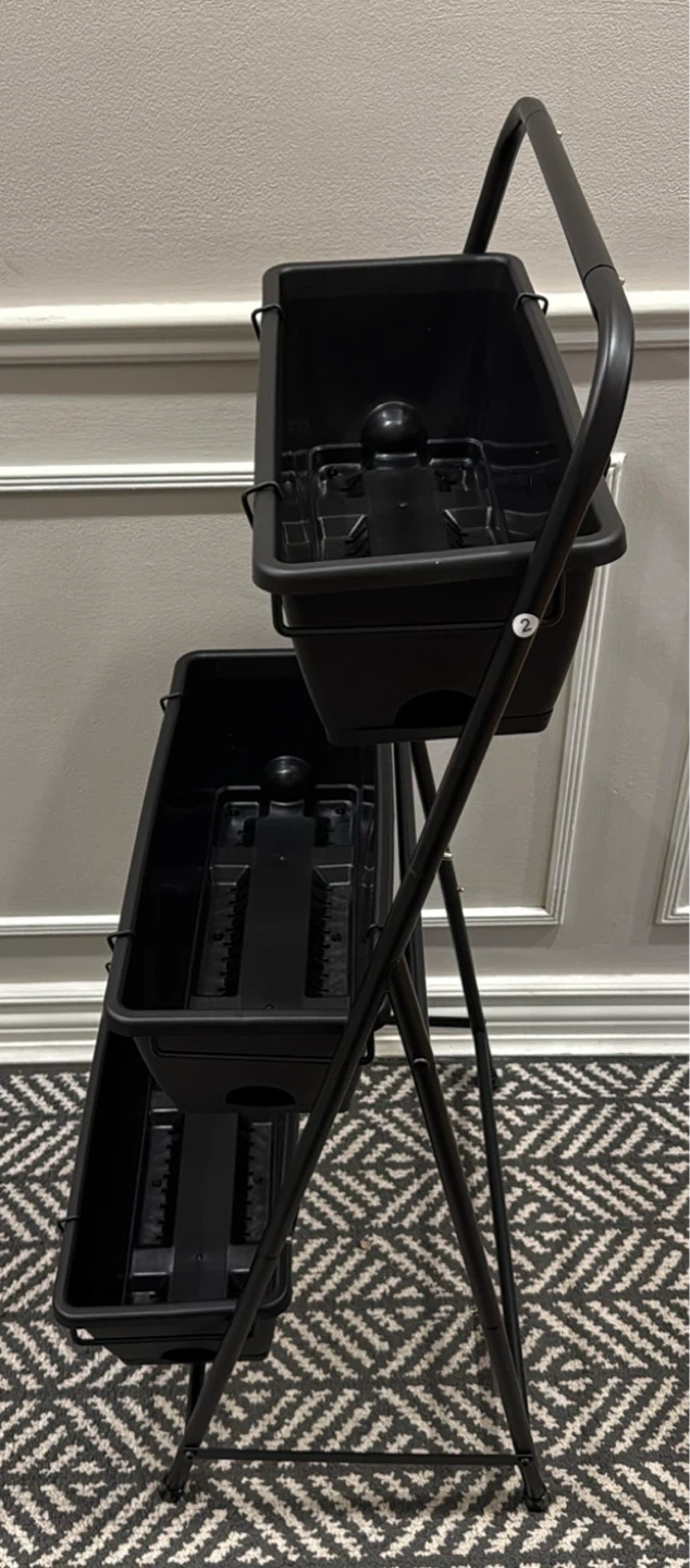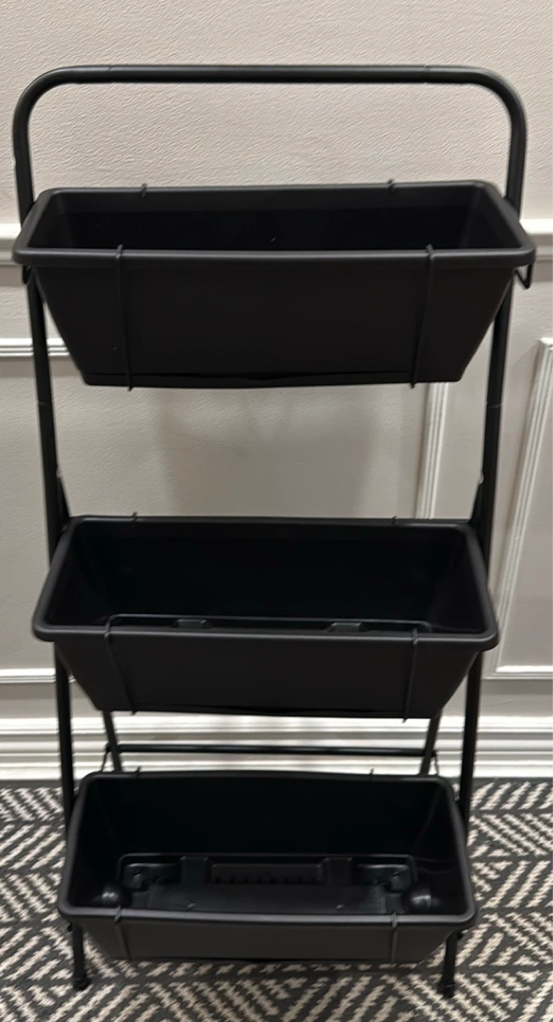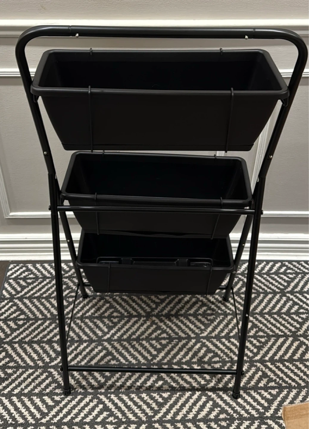This black 3-tier vertical garden planter features three removable trays with drainage holes. Its durable metal shelf has a stable triangle structure for added support. Overall dimensions are 38 inches tall and 17.7 inches wide.