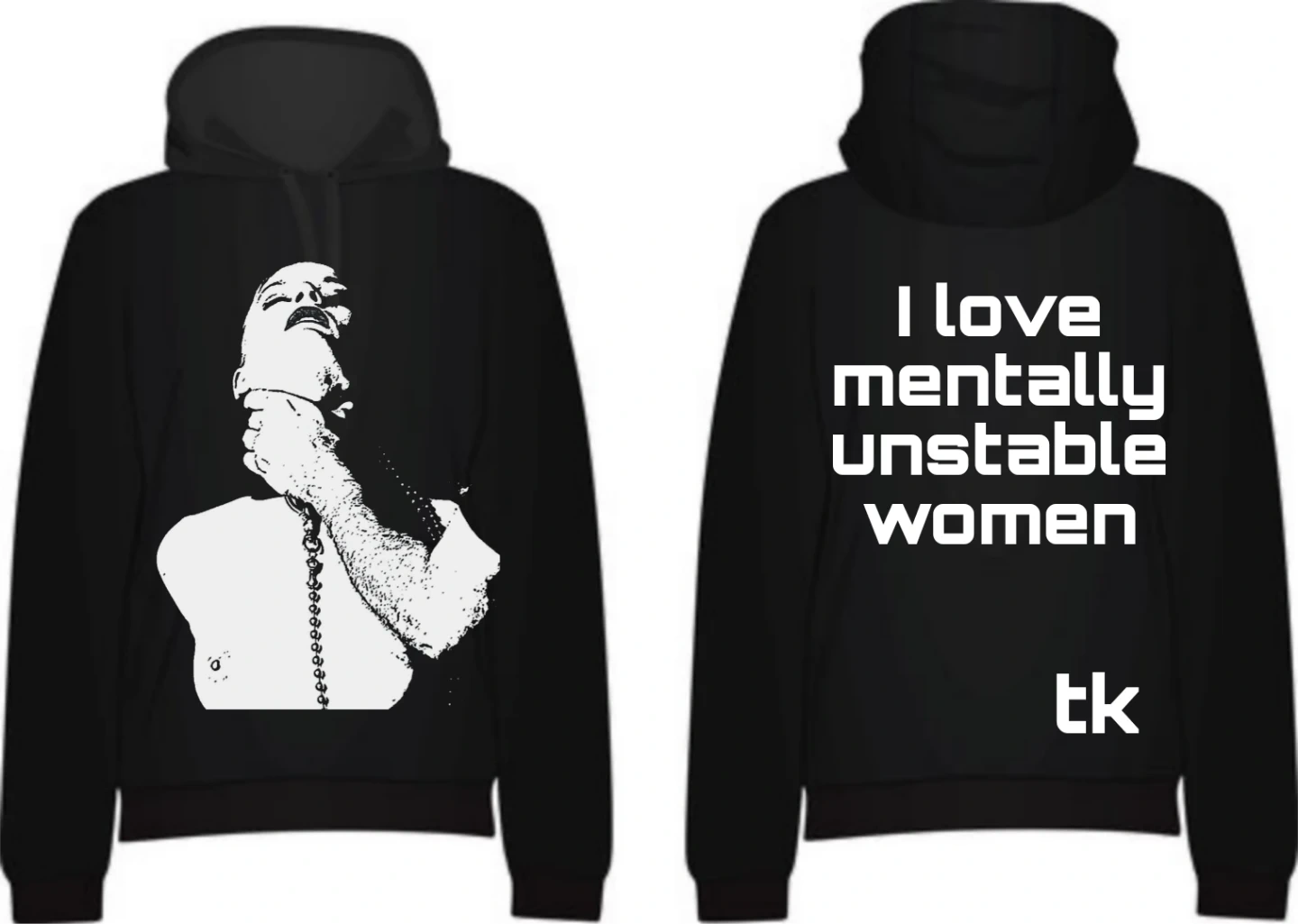 This black hoodie from local clothing brand ToxicKind features a unique graphic on the front and text on the back that says 'I love mentally unstable women'. It's made of a soft, comfortable material. A cool piece for anyone who likes bold designs!