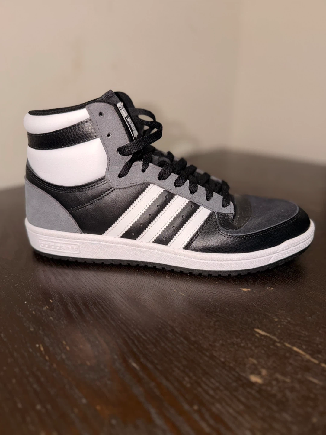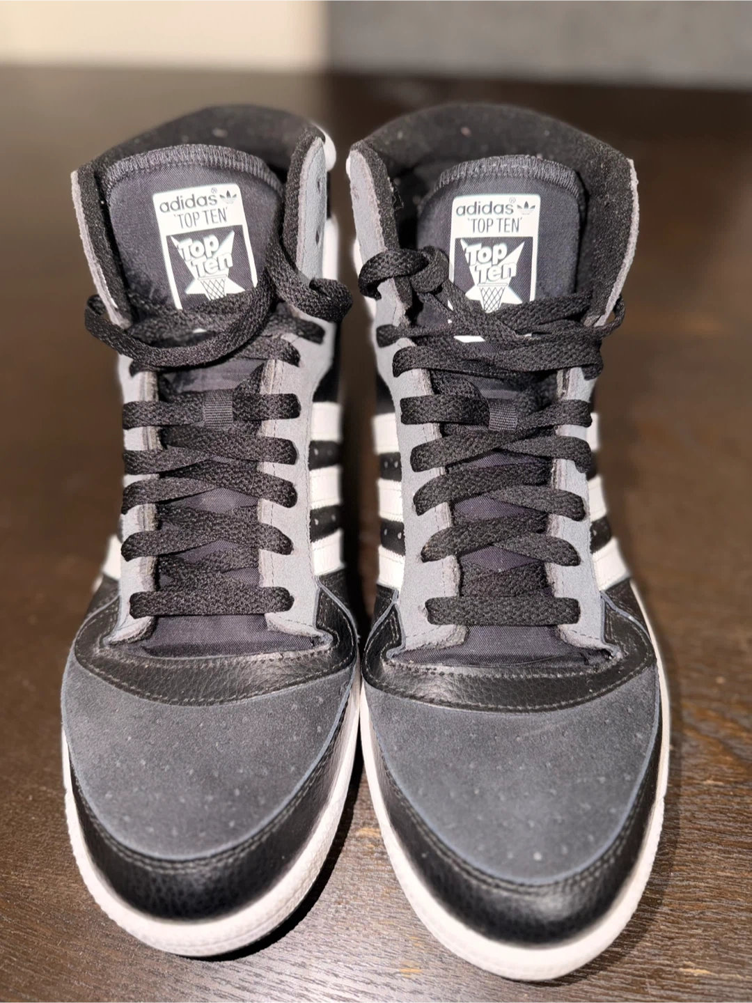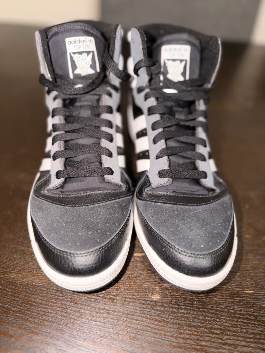 Selling a pair of Adidas Top Ten Hi sneakers in black and grey! These high-tops have the classic Adidas stripes and a cool retro vibe. They show some signs of wear but still have plenty of life left in them