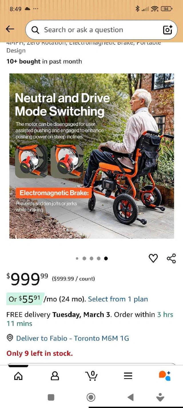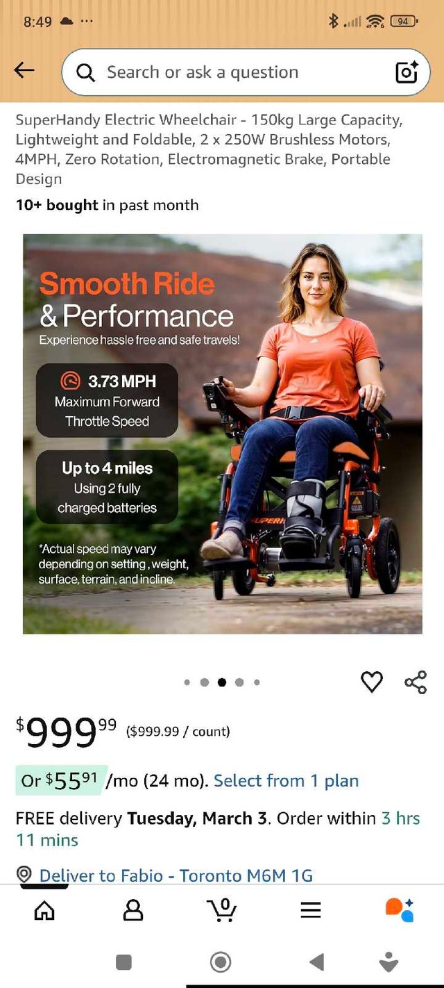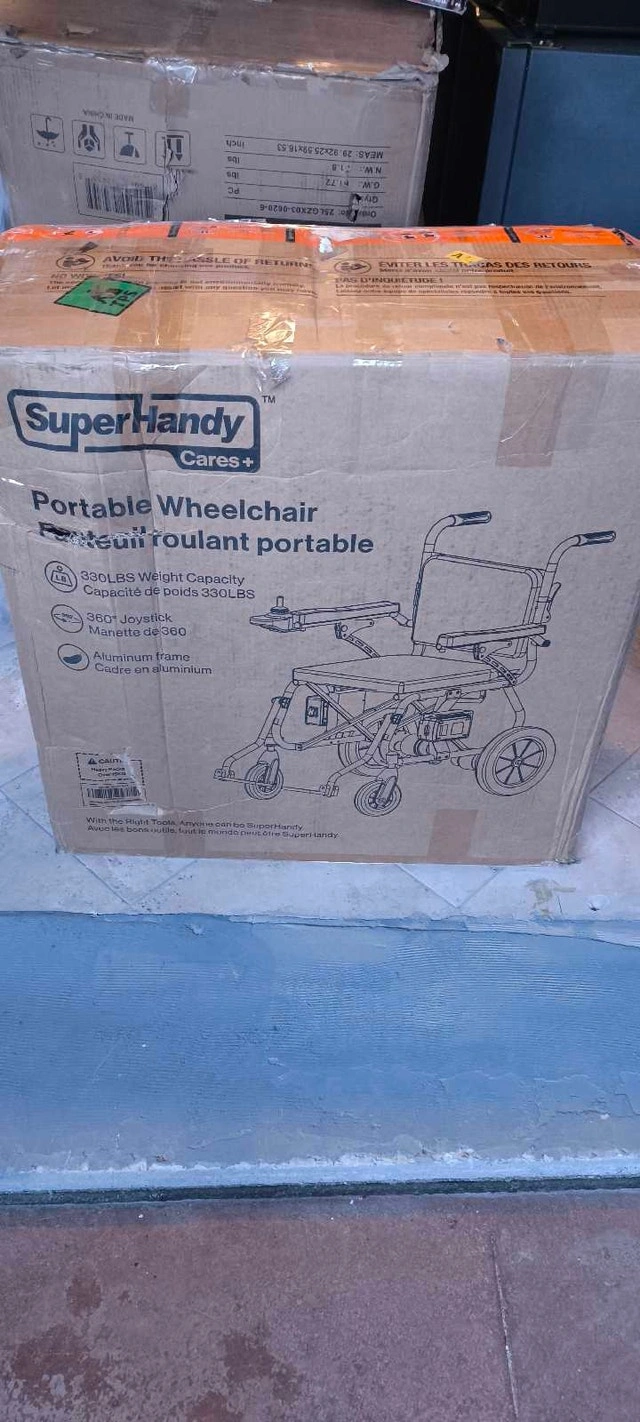 Selling a SuperHandy GoRide Electric Power Chair in excellent condition. This is one of the lightest motorized chairs available, making it perfect for seniors or anyone who loves to travel. Only 39 lbs—easy to lift into a trunk or SUV. Folds and unfolds in seconds without any tools. Features dual 250W brushless motors and a 360° joystick for easy navigation in tight spaces. Safety features an electromagnetic braking system that stops instantly when you let go of the controller. Includes an airline-approved lithium-ion battery.