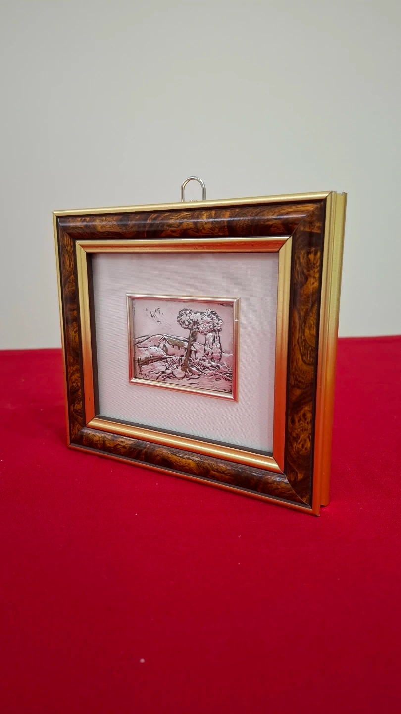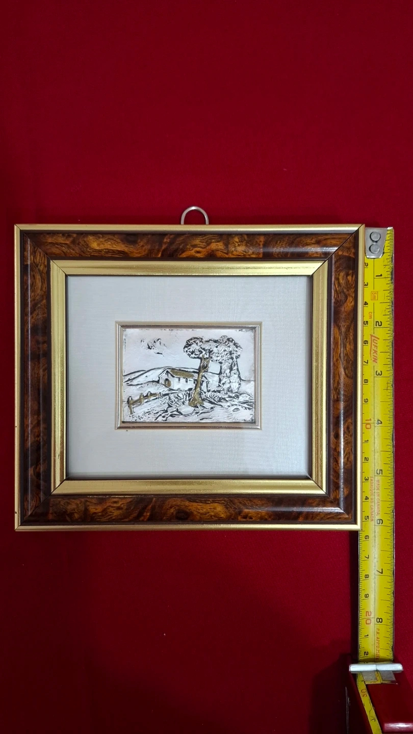 This is a framed art piece featuring a landscape scene. It has a '925' stamp indicating sterling silver content. The frame is made of wood with a burl wood finish. Measures 6x7 inches.