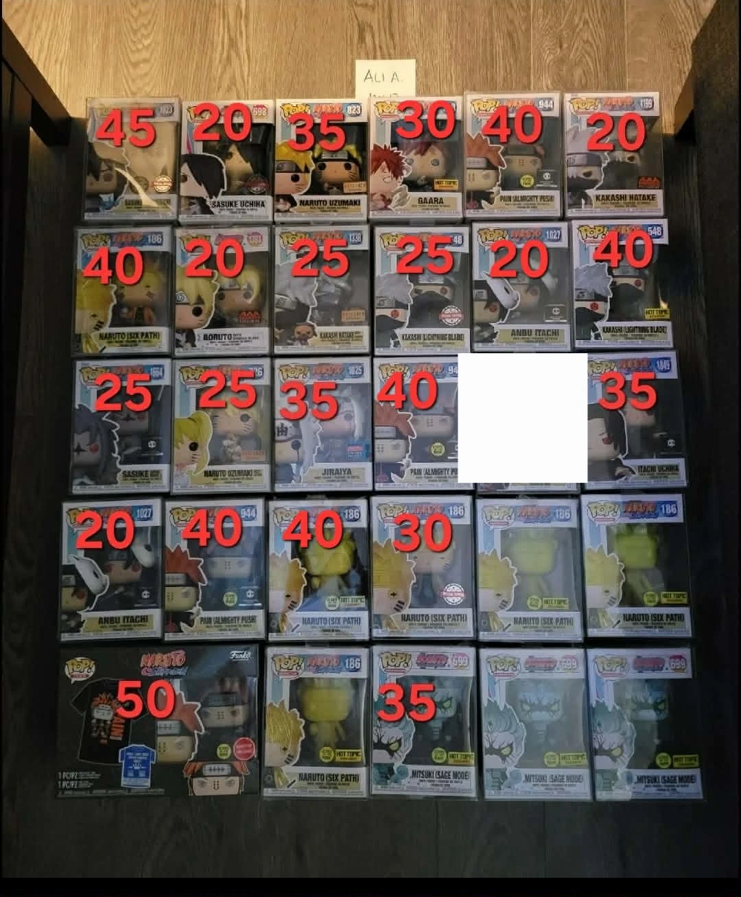 Collection of Funko Pop! figures featuring characters from Naruto and Boruto. Includes popular characters like Sasuke, Naruto, Kakashi, and Gaara. Figures come in their original packaging.