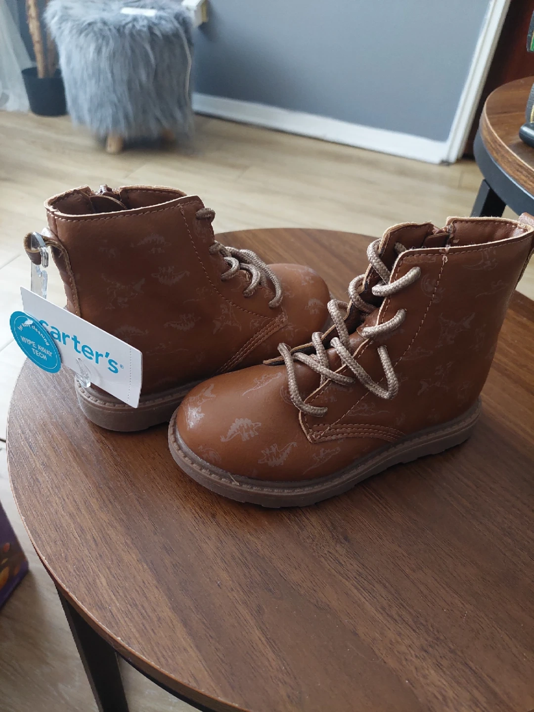 These Carter's brown boots feature a fun dinosaur print all over. They have laces and a side zipper for easy on and off. Made with a durable sole for active little ones! Size 9 toddler and size 6 toddler