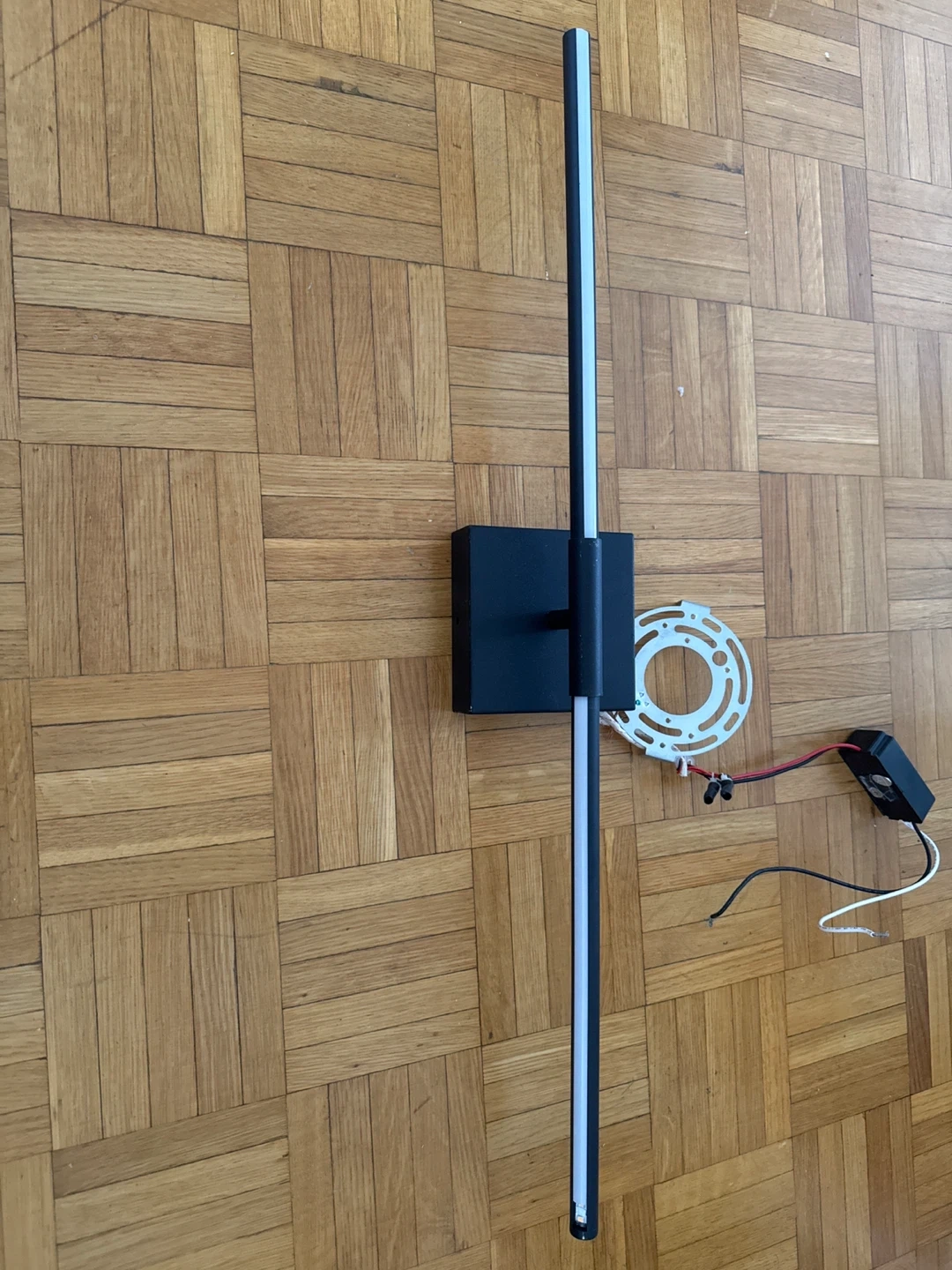 This is a sleek, modern LED wall sconce light fixture. It features a minimalist black design with a frosted white light bar. The fixture includes a mounting bracket and necessary wiring components for installation. It's a stylish addition for any contemporary home.