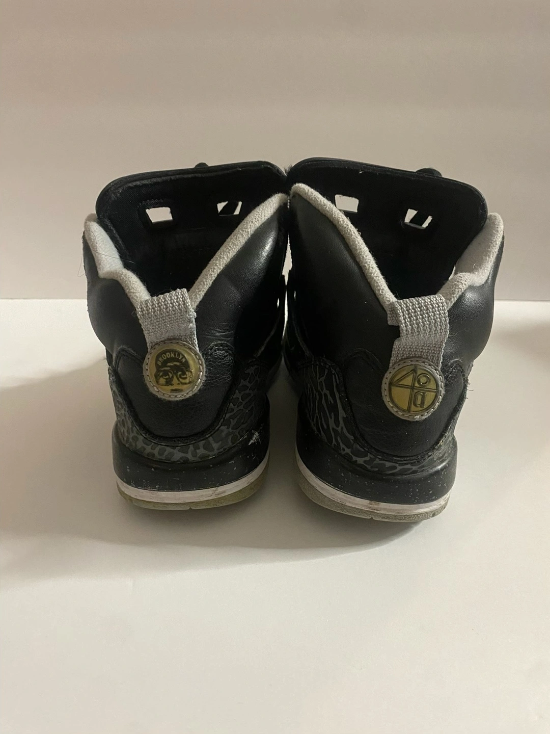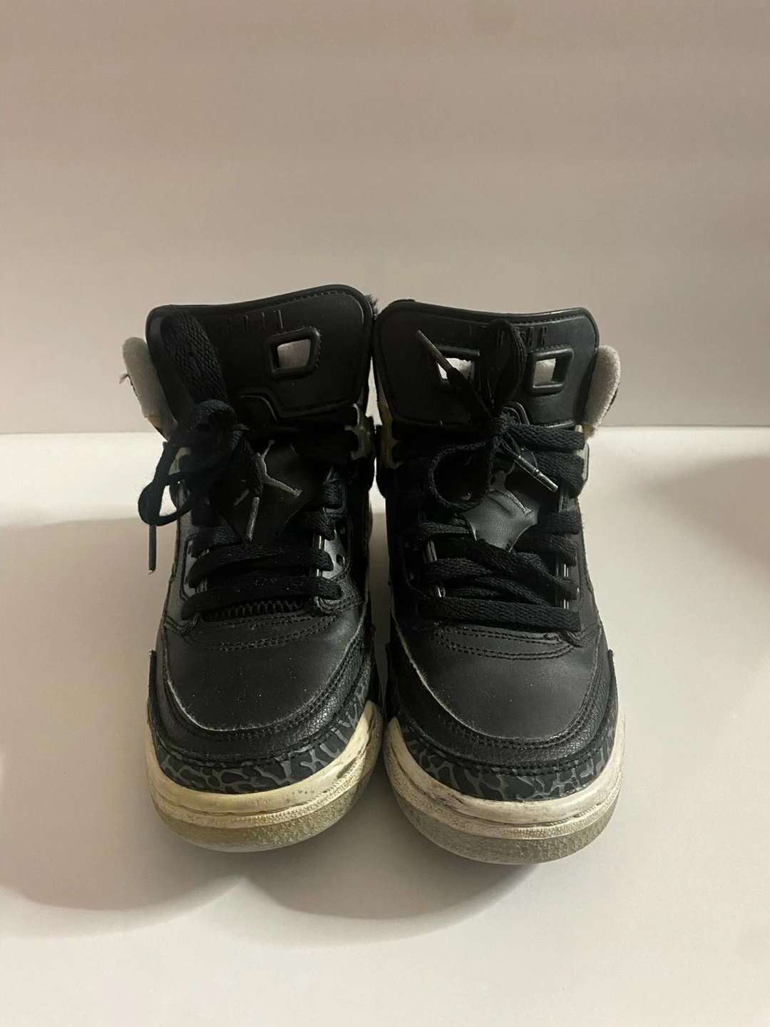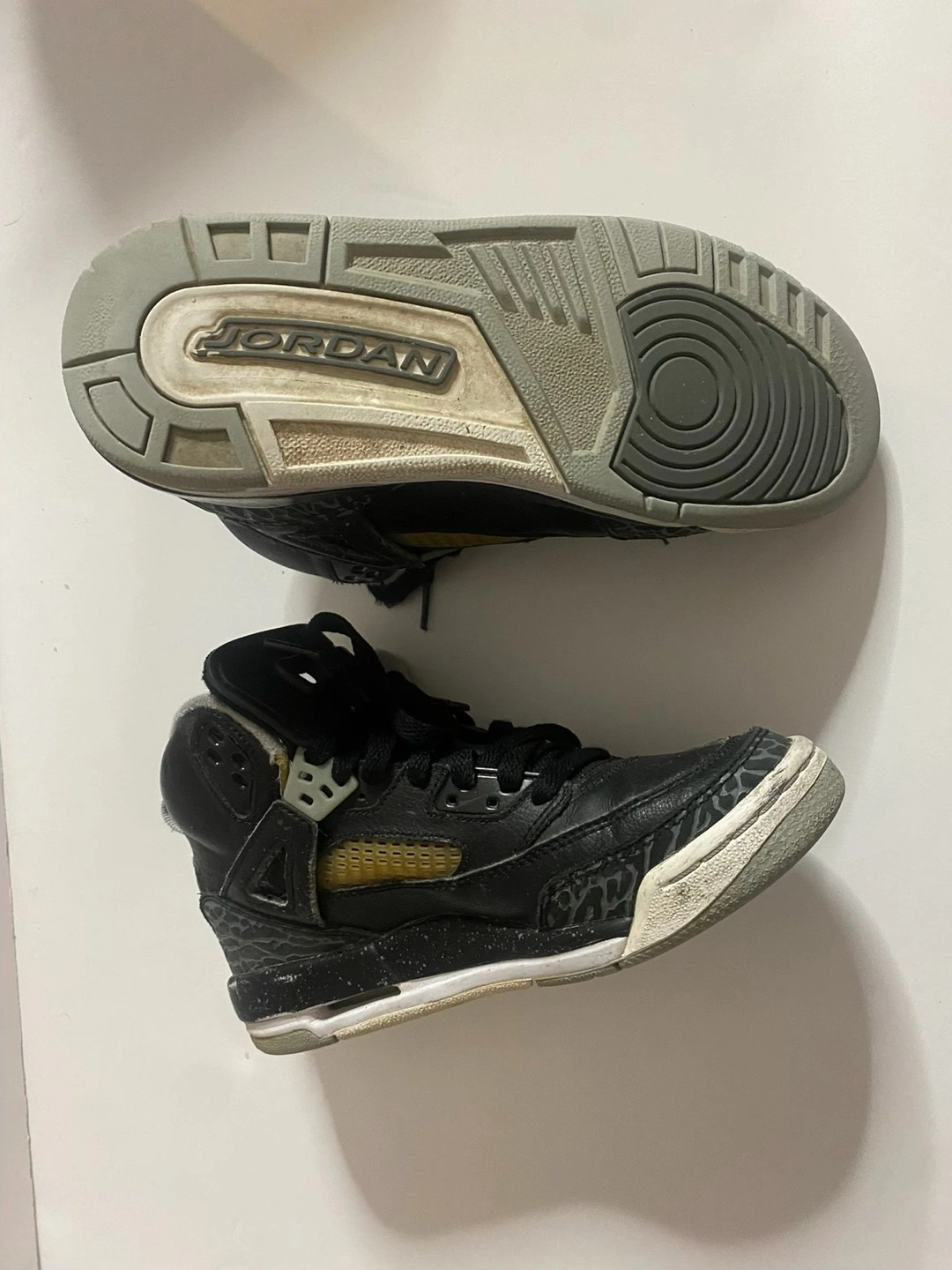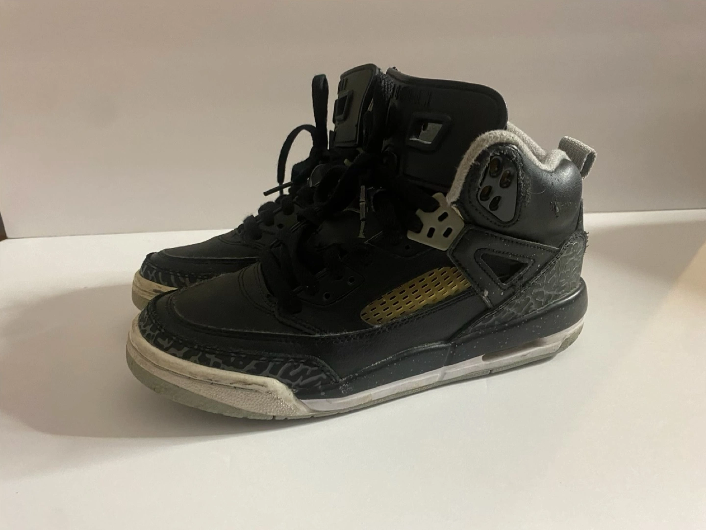 Pre-owned Jordan 5 Retro GS basketball shoes. Black leather upper, grey elephant print accents, gold detailing. Youth size 4.5Y.
