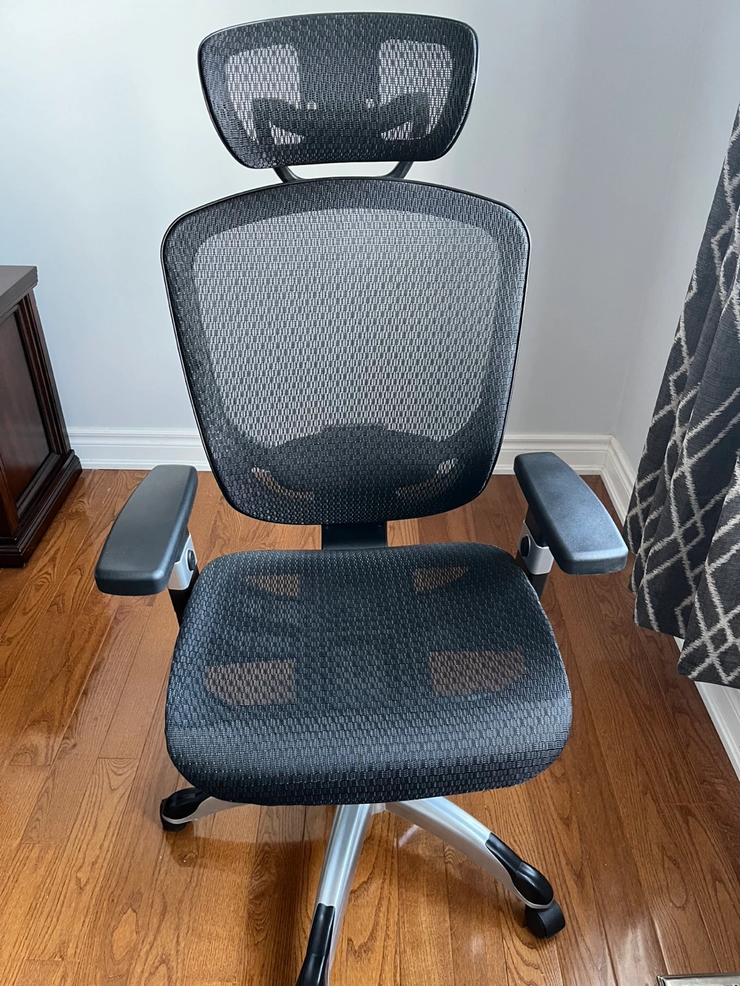Comfortable and supportive office chair. Features adjustable headrest and armrests. Mesh back for breathability. Silver coloured base. Great for home or office use. Barely used, as good as new one! Currently on sale at Staples for 275 + Tax.