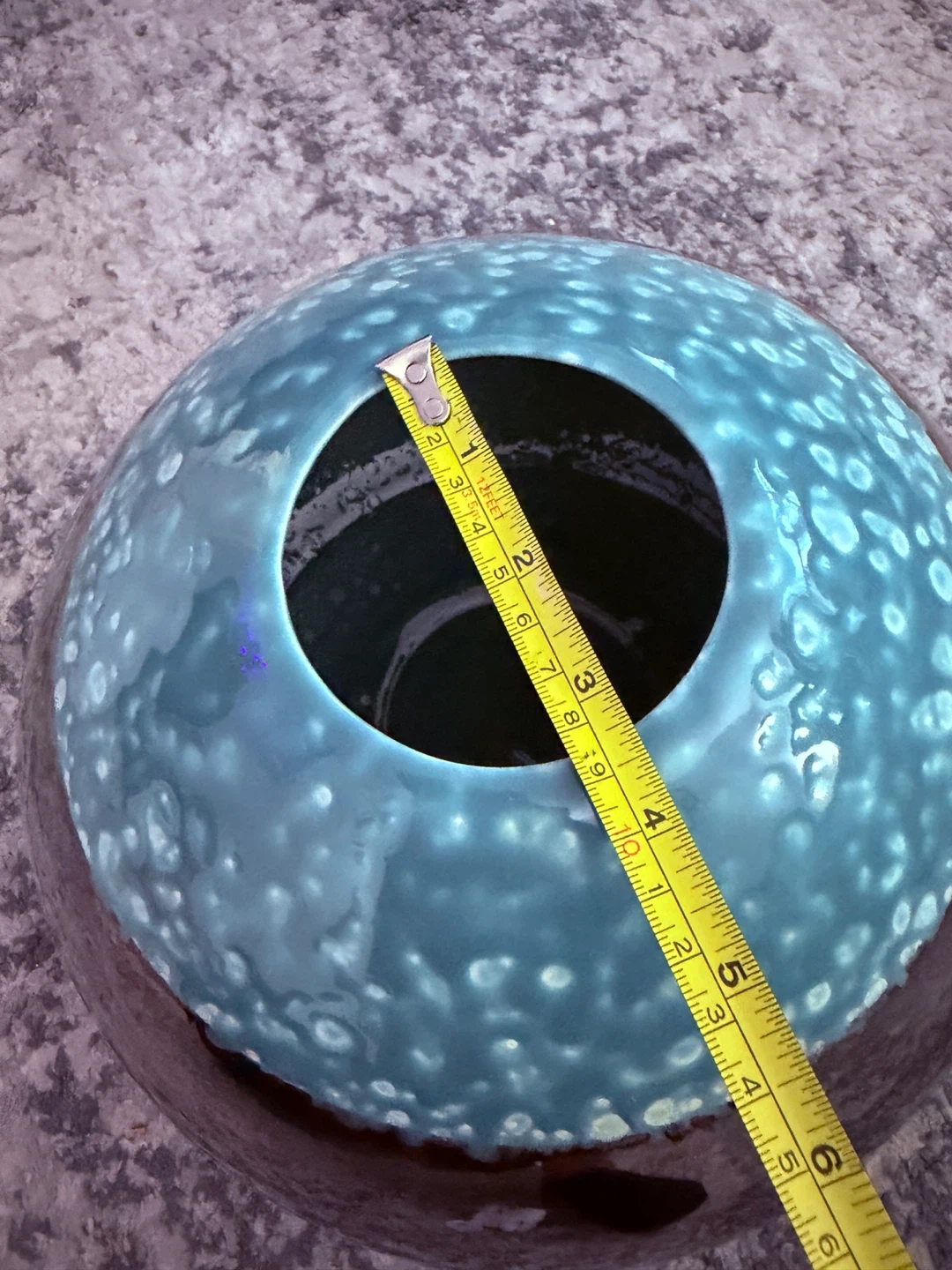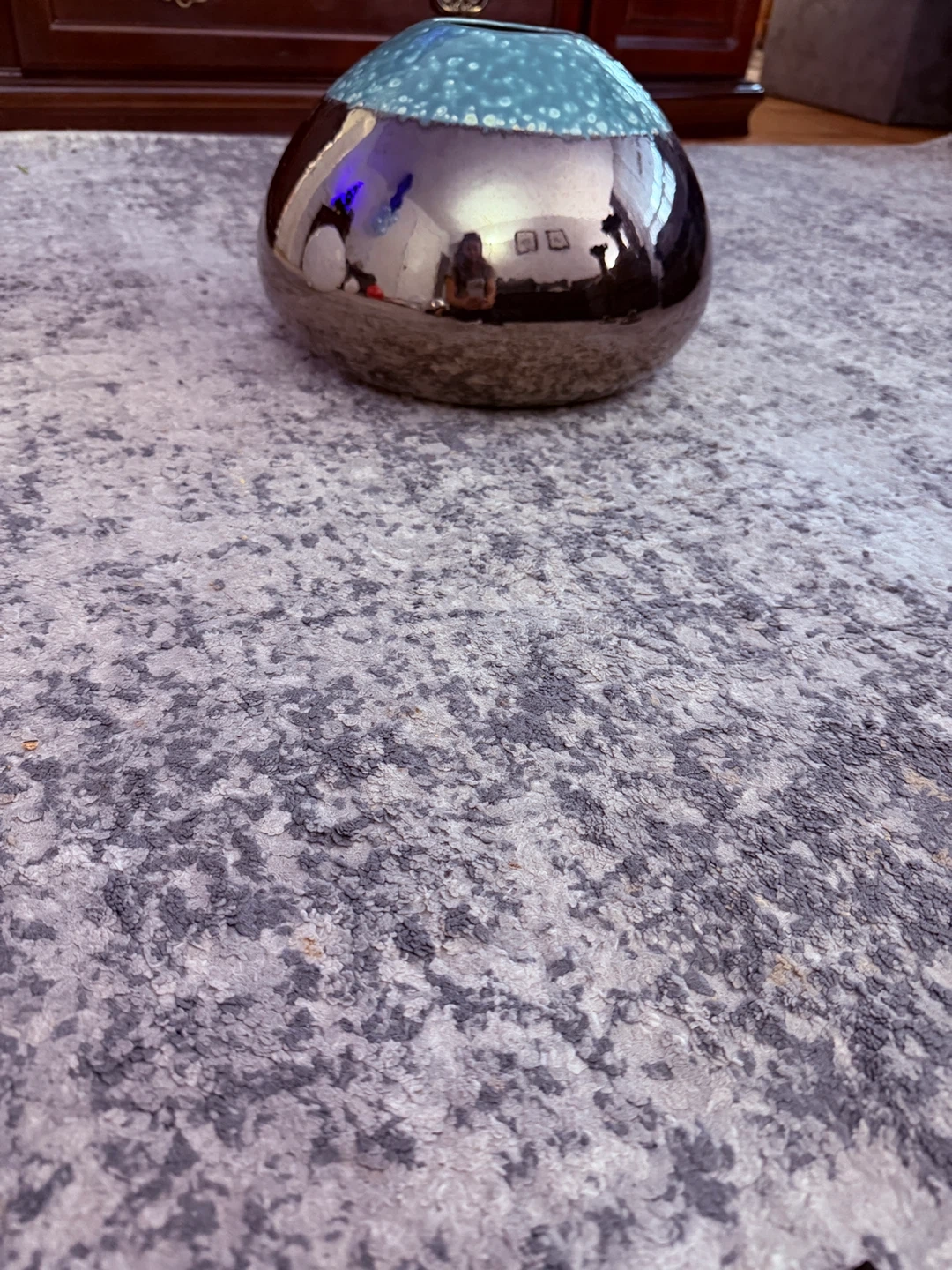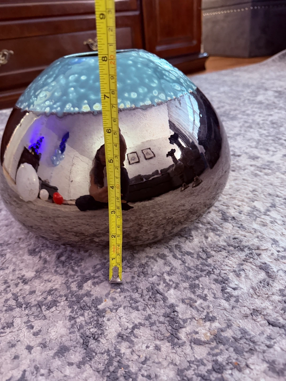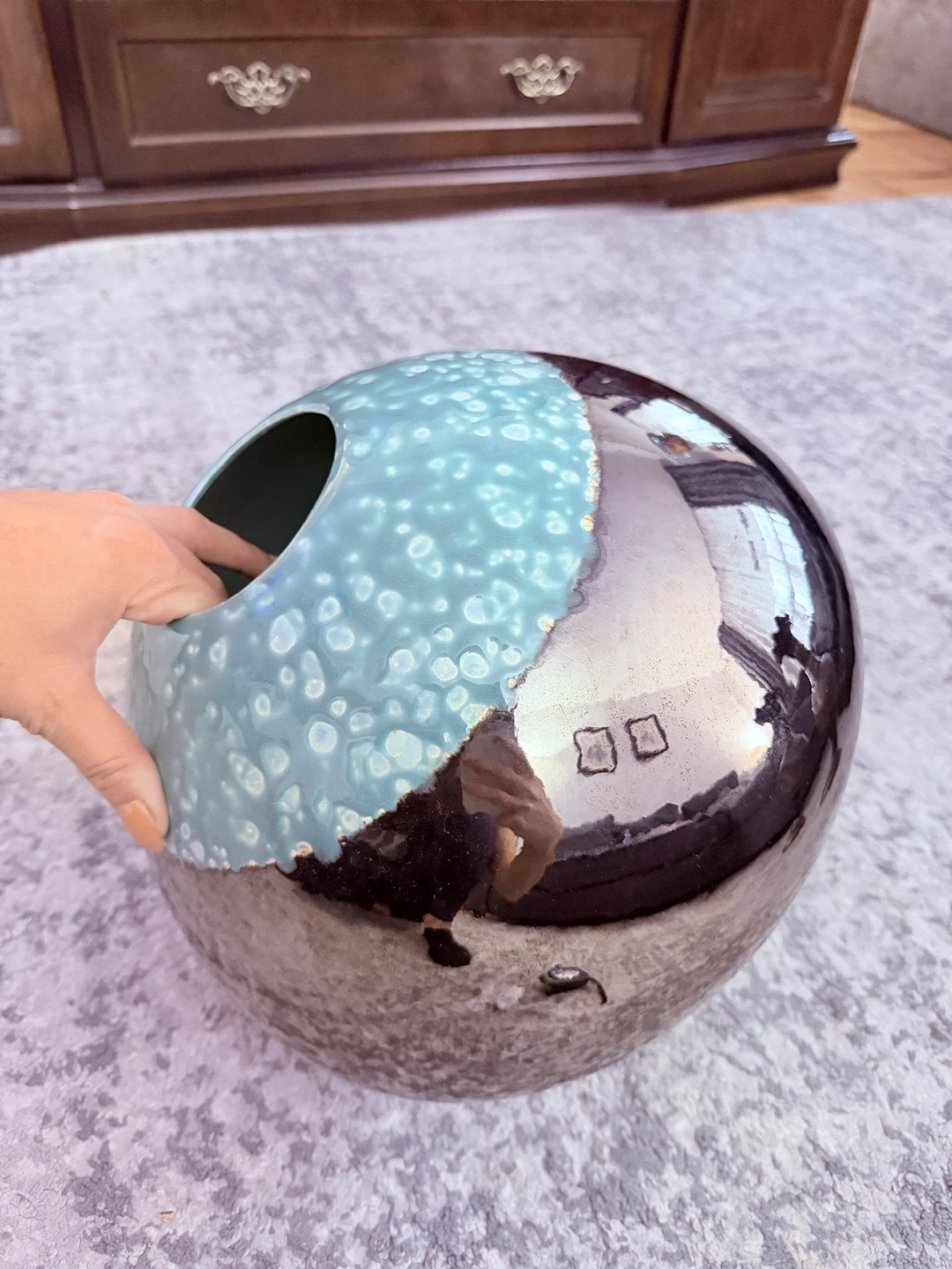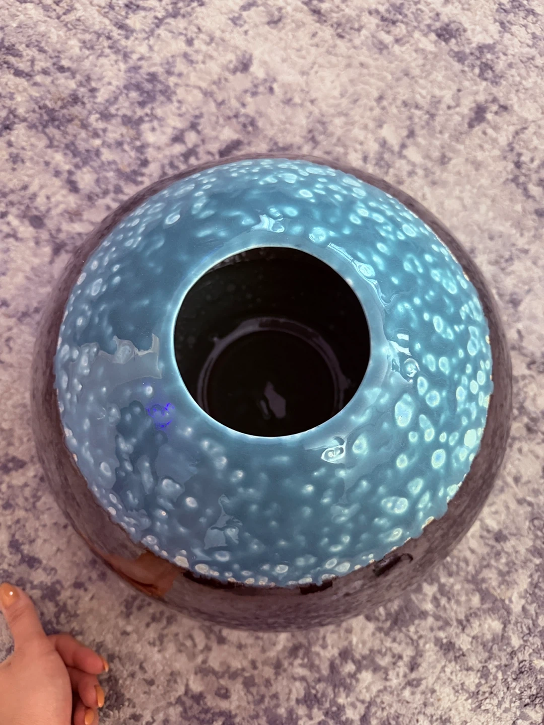Selling a beautiful handmade vase from Euroline, crafted in Sri Lanka! It has a unique design with a glossy, reflective bottom and a textured, light blue top. The vase is about 9 inches tall