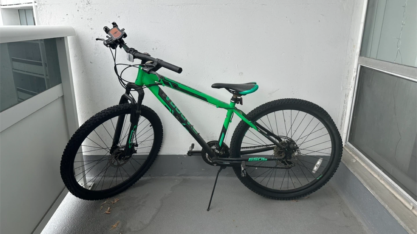 This is a green and black Diadora mountain bike. It has front suspension and disc brakes. The bike also comes with a phone mount attached to the handlebars. Perfect for trail riding!