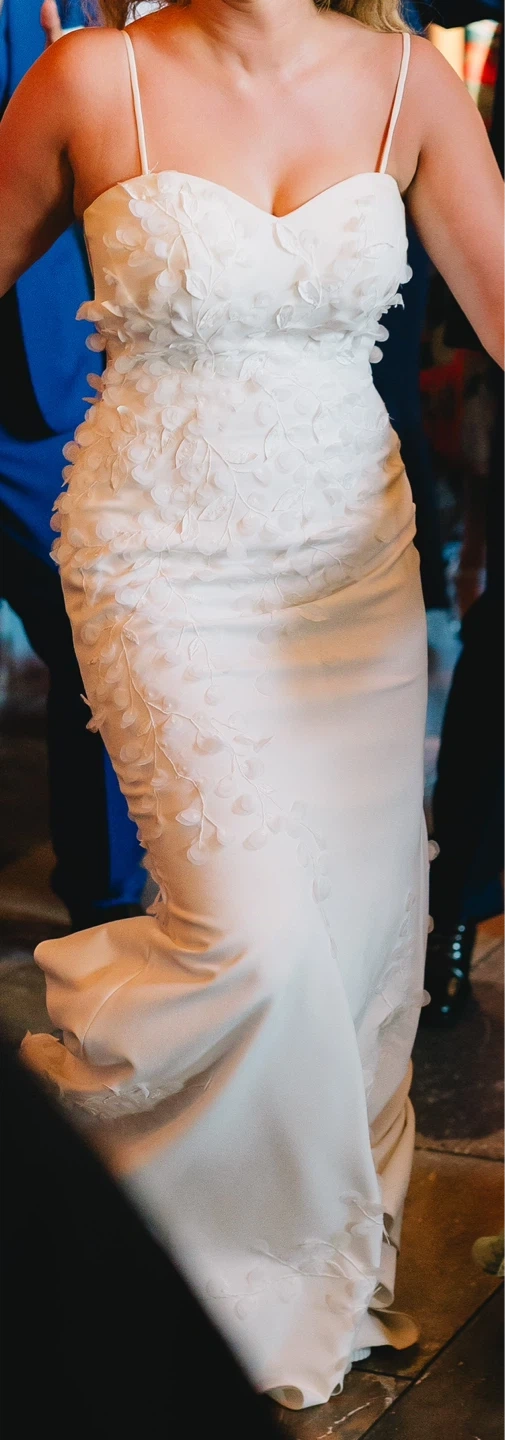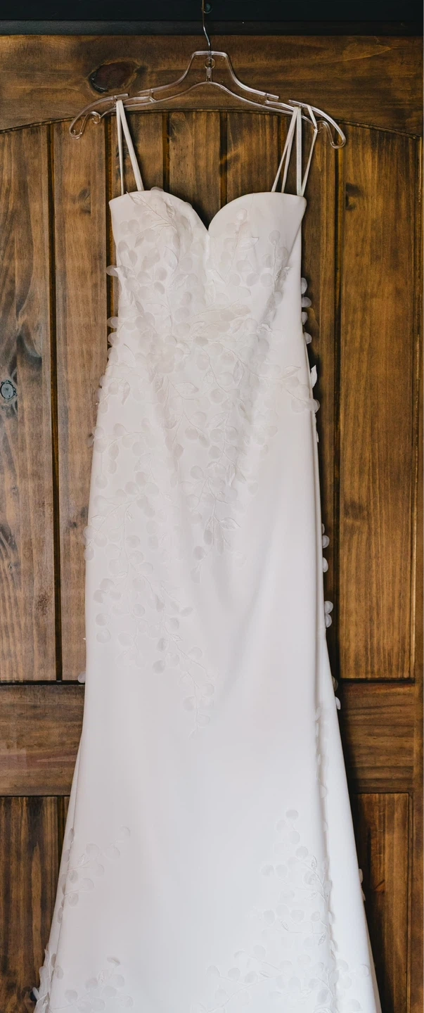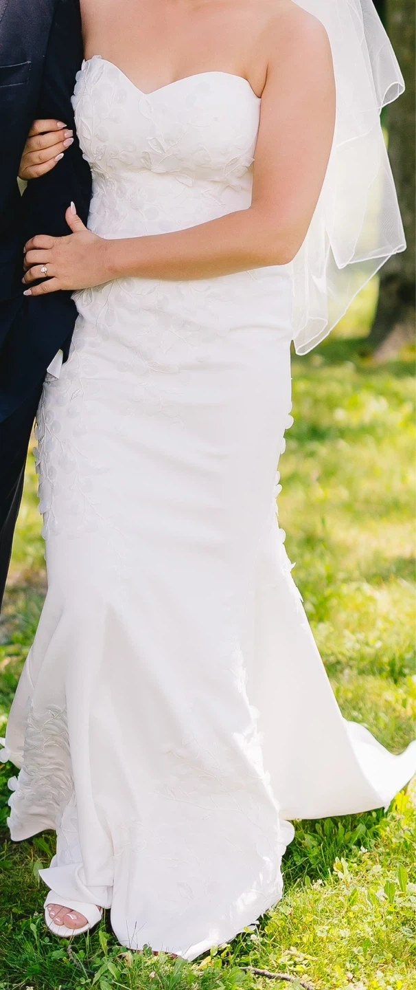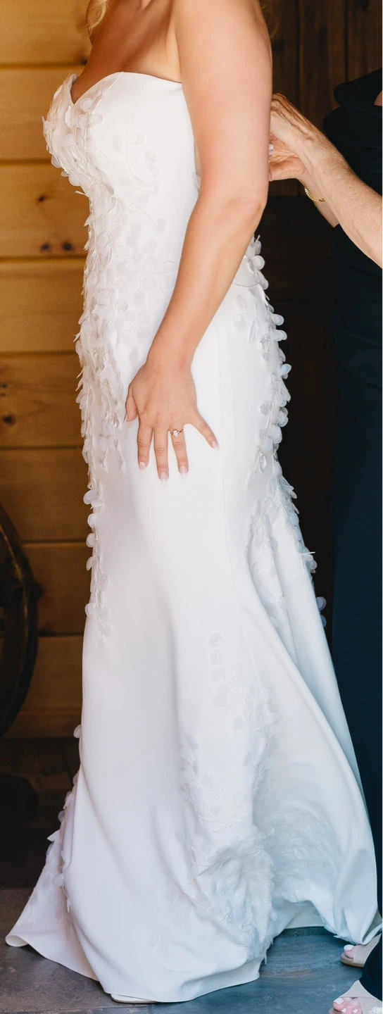 Ivory strapless wedding dress featuring intricate floral appliqués cascading down the bodice and skirt. It has a built-in corset for a sculpted fit. Worn once; professionally cleaned. Original price $2250 at Elizabeth and Beau Uptown Bridal