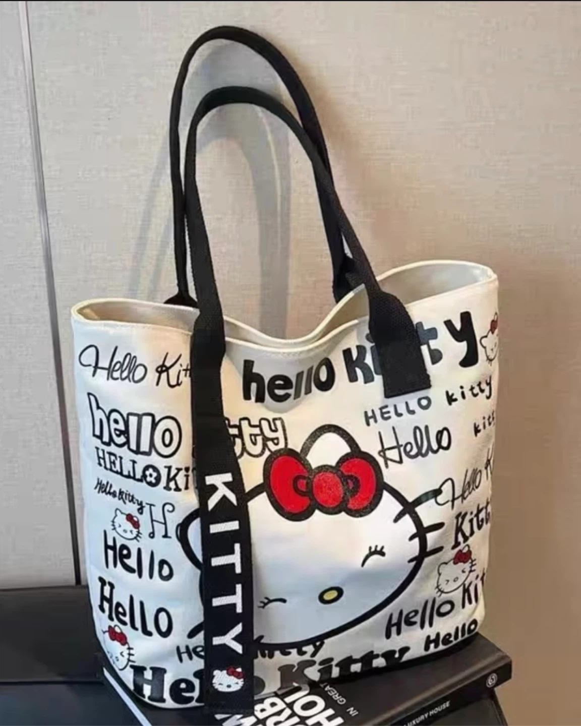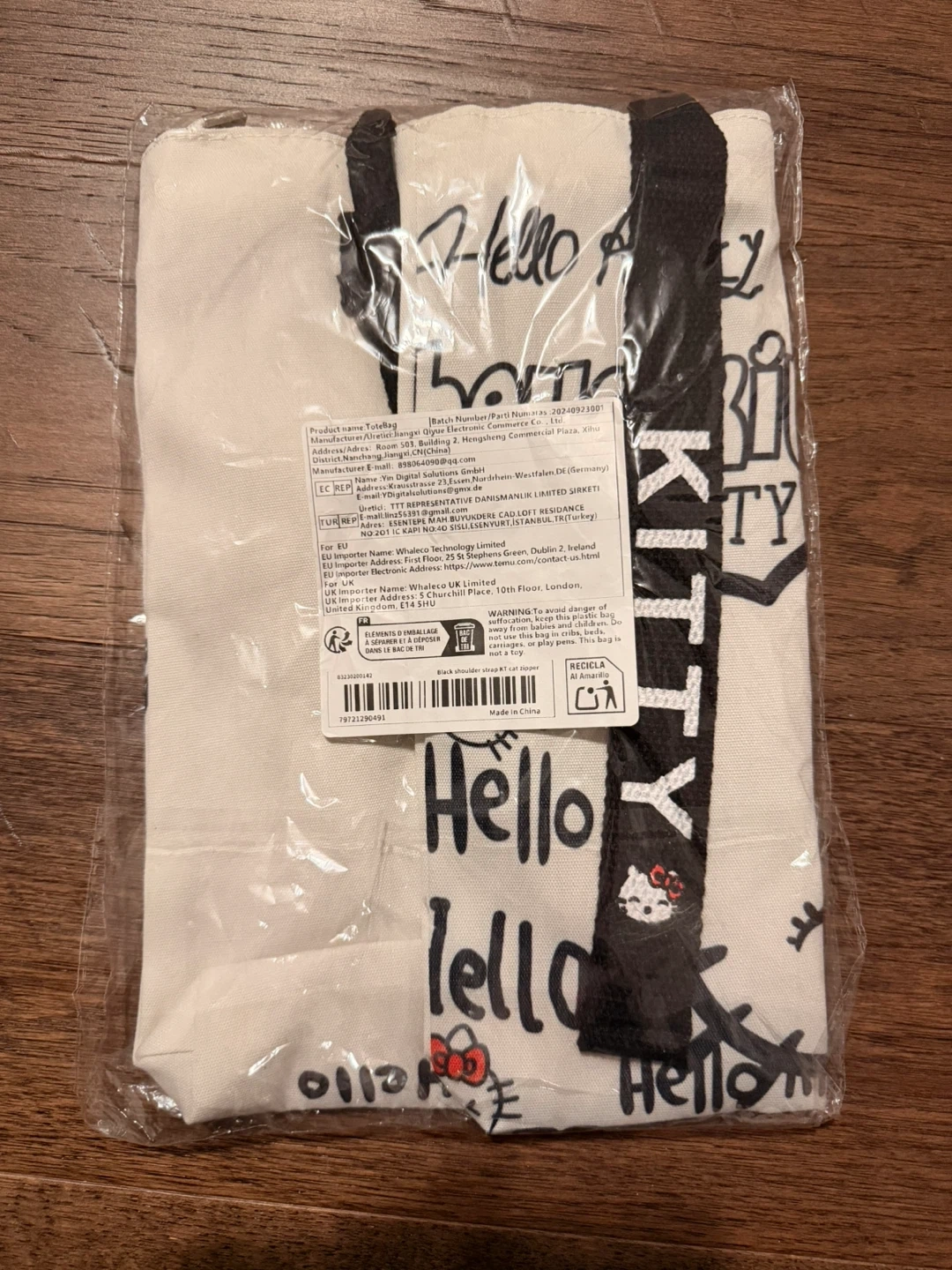 I have a brand new Hello Kitty tote bag for sale! It's still in its original packaging. The bag features a cute Hello Kitty design with black accents. Super cute! Perfect for carrying your everyday essentials.