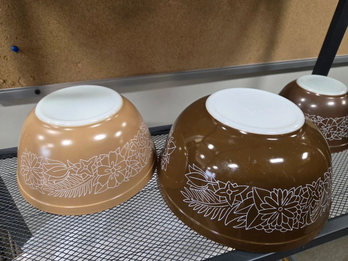 Vintage Pyrex mixing bowls in a lovely brown colour with a white floral pattern. Includes three bowls of varying sizes, perfect for all your kitchen prep needs. Made of durable glass material. Oven safe.