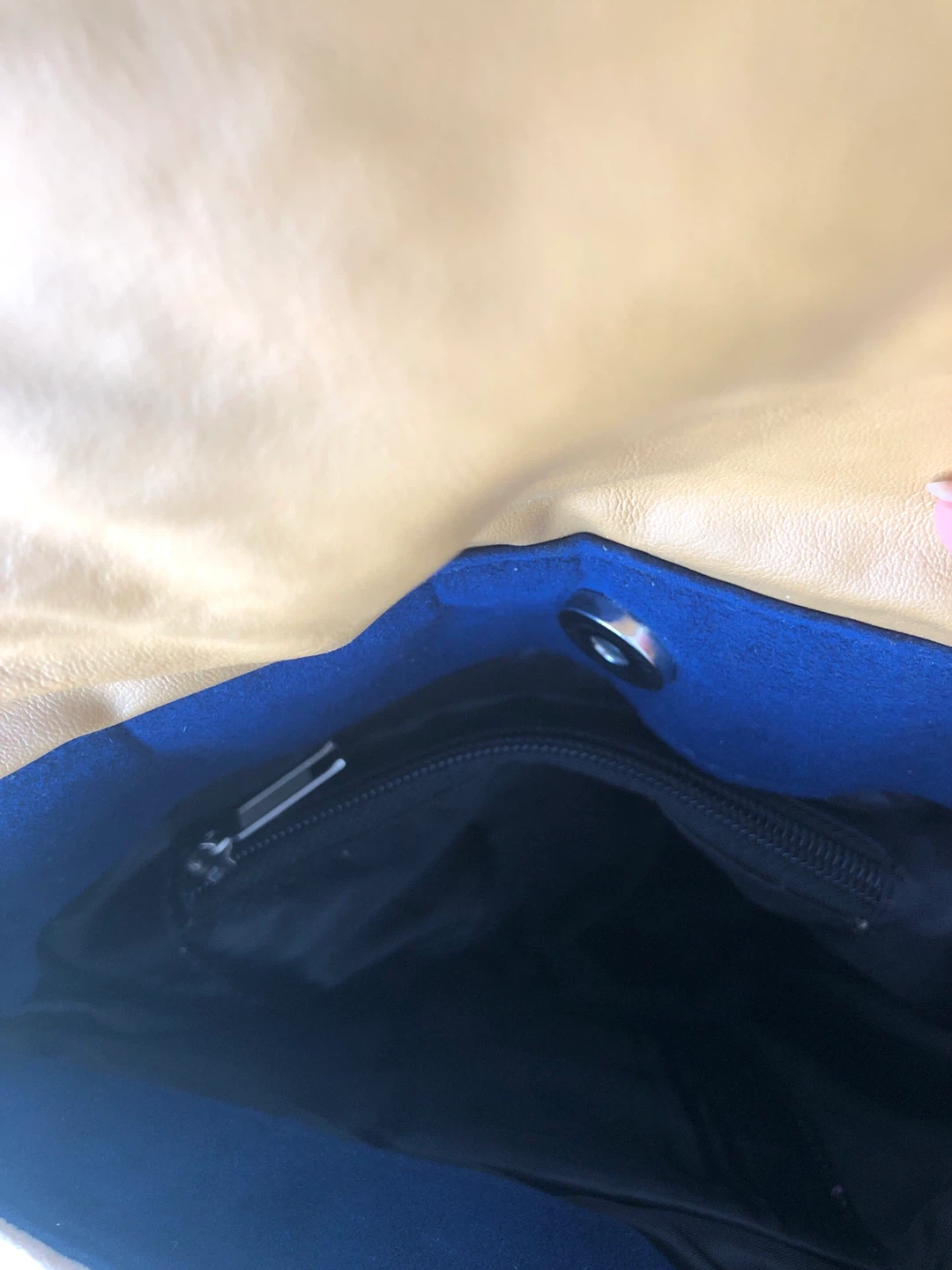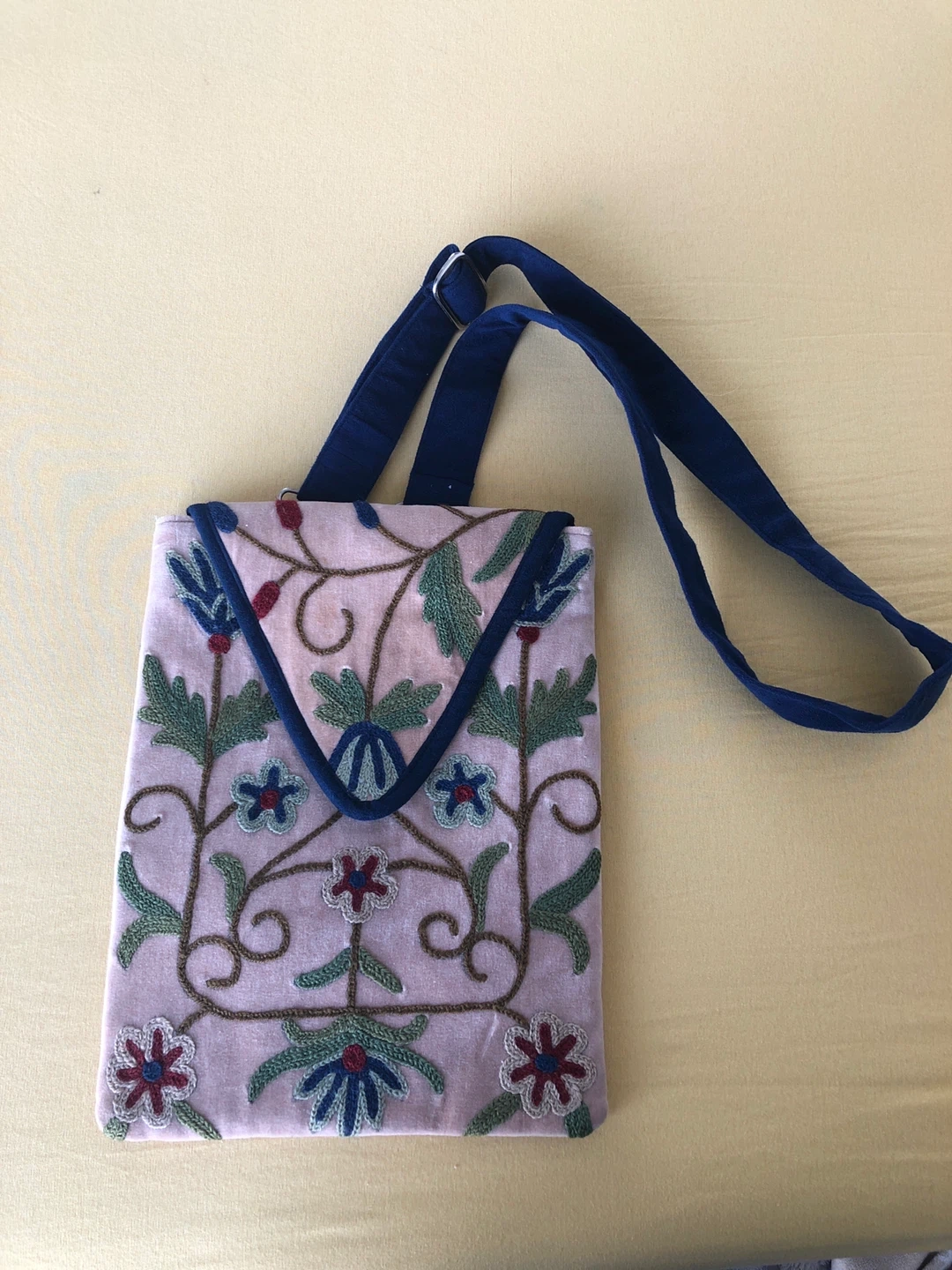 This light pink shoulder bag features intricate floral embroidery in blue, green, and red (Kashmiri) It has a navy blue trim and strap. The interior has one zippered pocket and a magnetic snap closure. Check out my other postings, Combo deals and great discounts when purchasing 2 or more items.