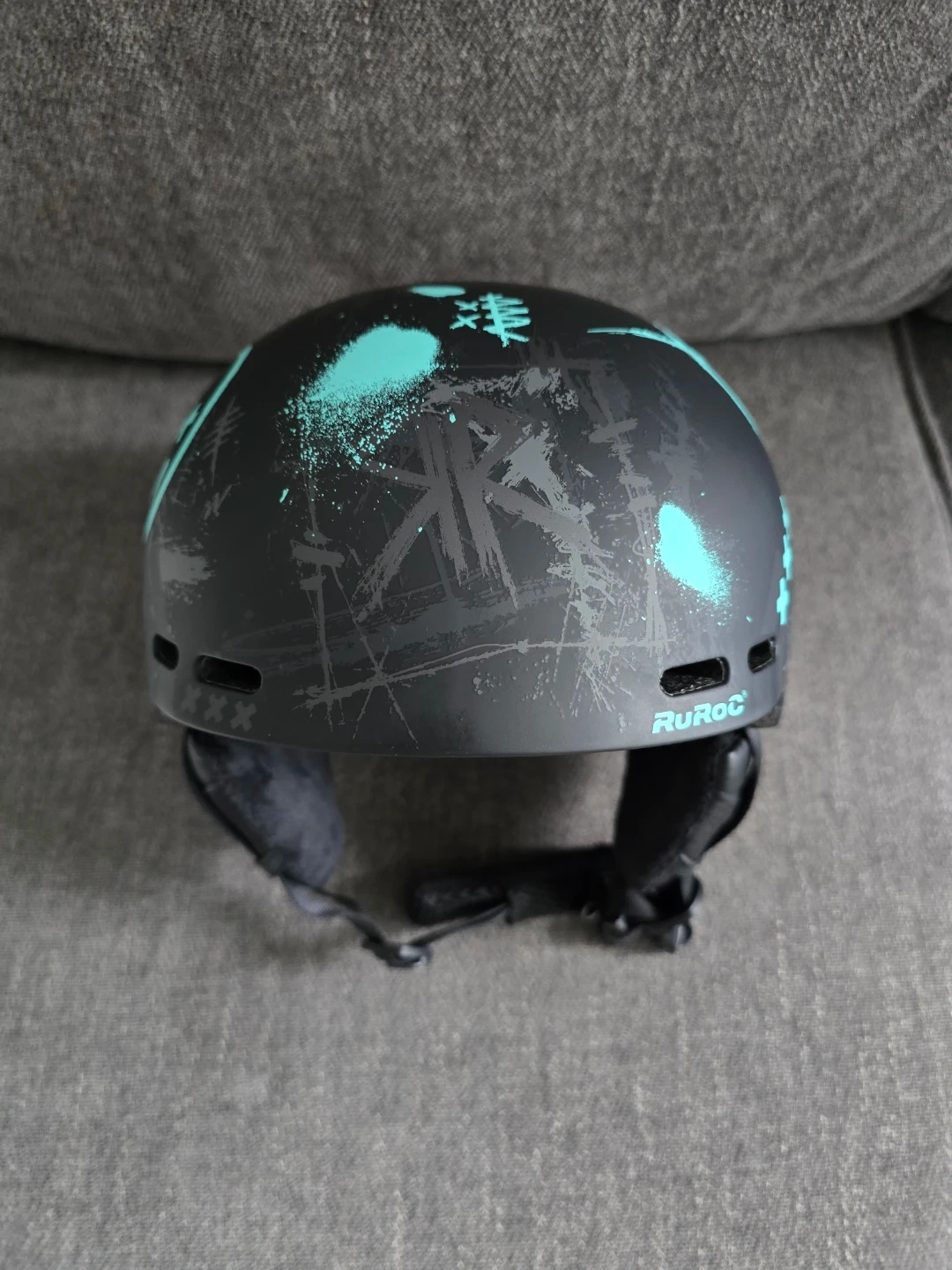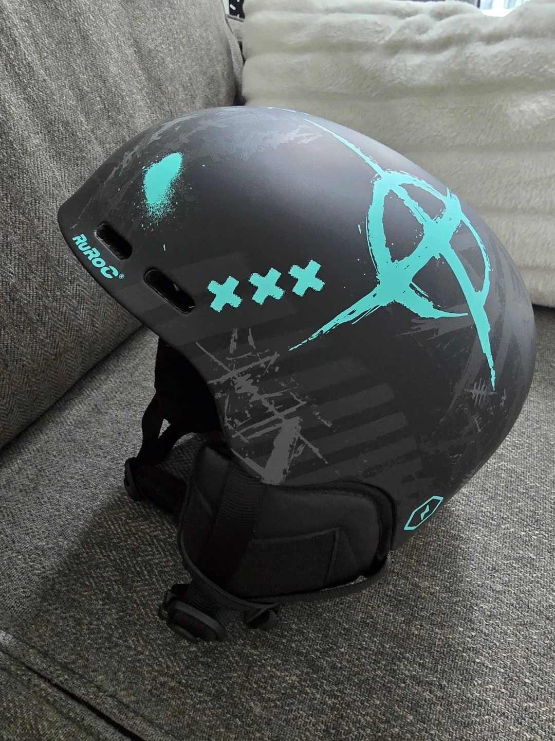 This RuRoc Renegade helmet comes in black with a cool teal graffiti design. It's built for skiing and snowboarding. It has adjustable ventilation and a dial-fit system for a comfy fit. Perfect for hitting the slopes!