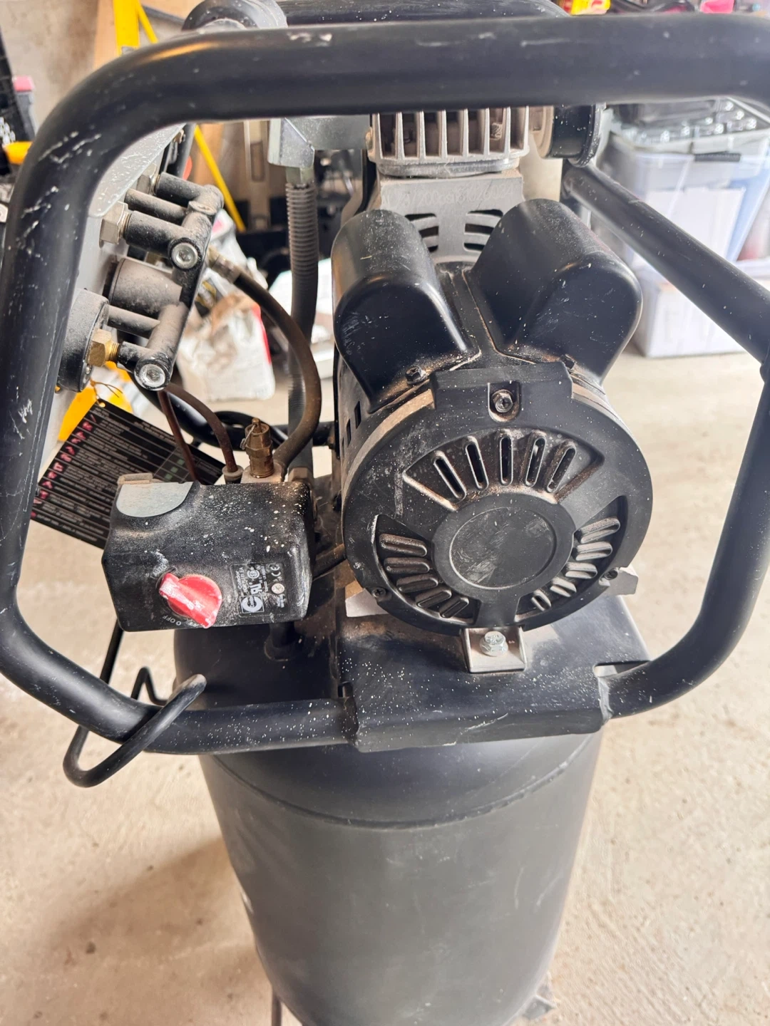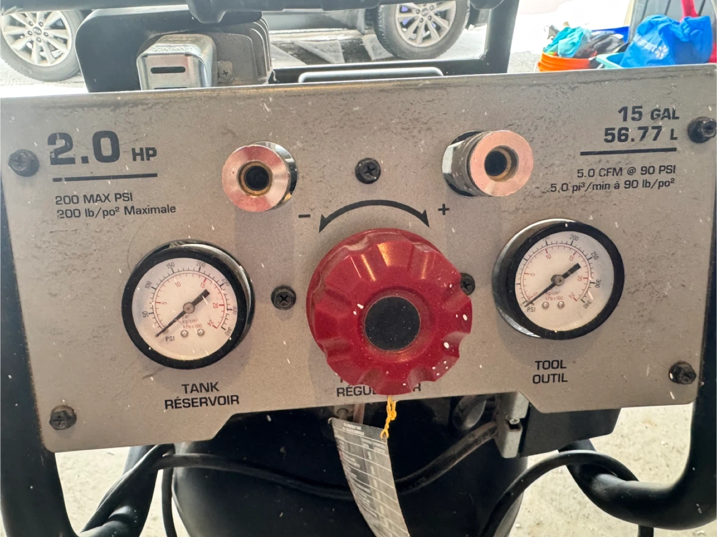 This is a Briggs & Stratton 15 gallon air compressor with 2.0 HP. It has a maximum pressure of 200 PSI and 5.0 CFM at 90 PSI. It's ideal for various workshop tasks.