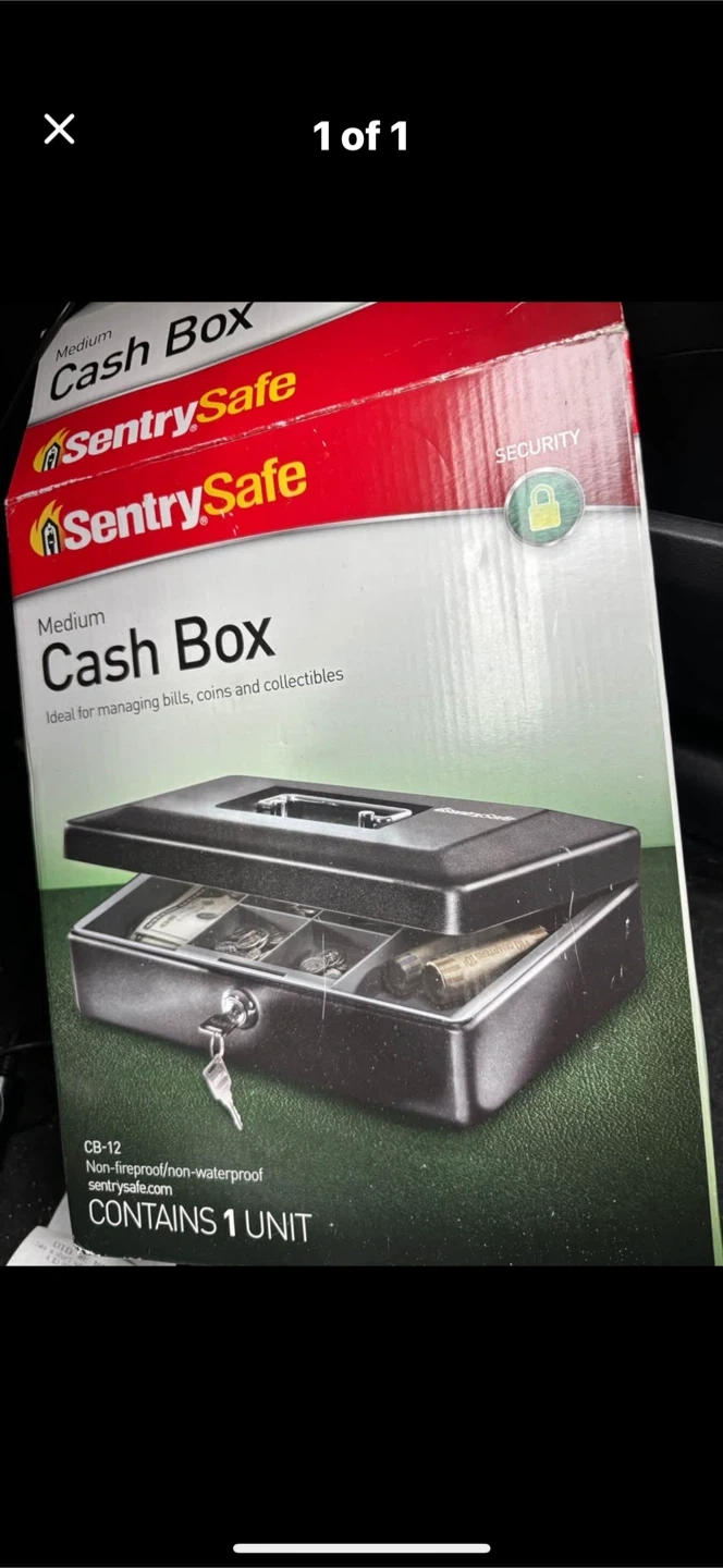 This is a SentrySafe medium cash box, model CB-12. It's ideal for managing bills, coins, and collectibles. The cash box is non-fireproof and non-waterproof. It includes a key lock for security.