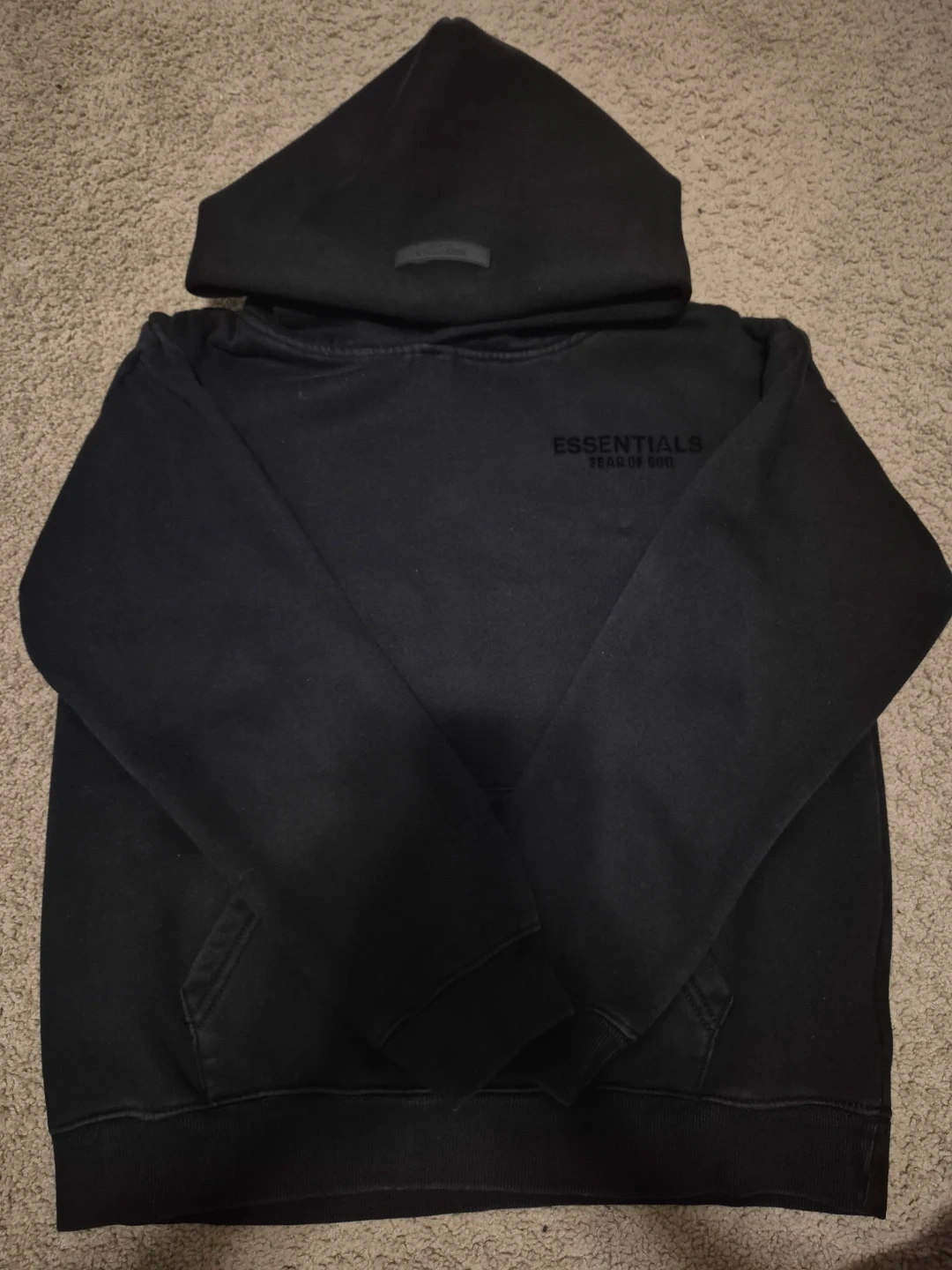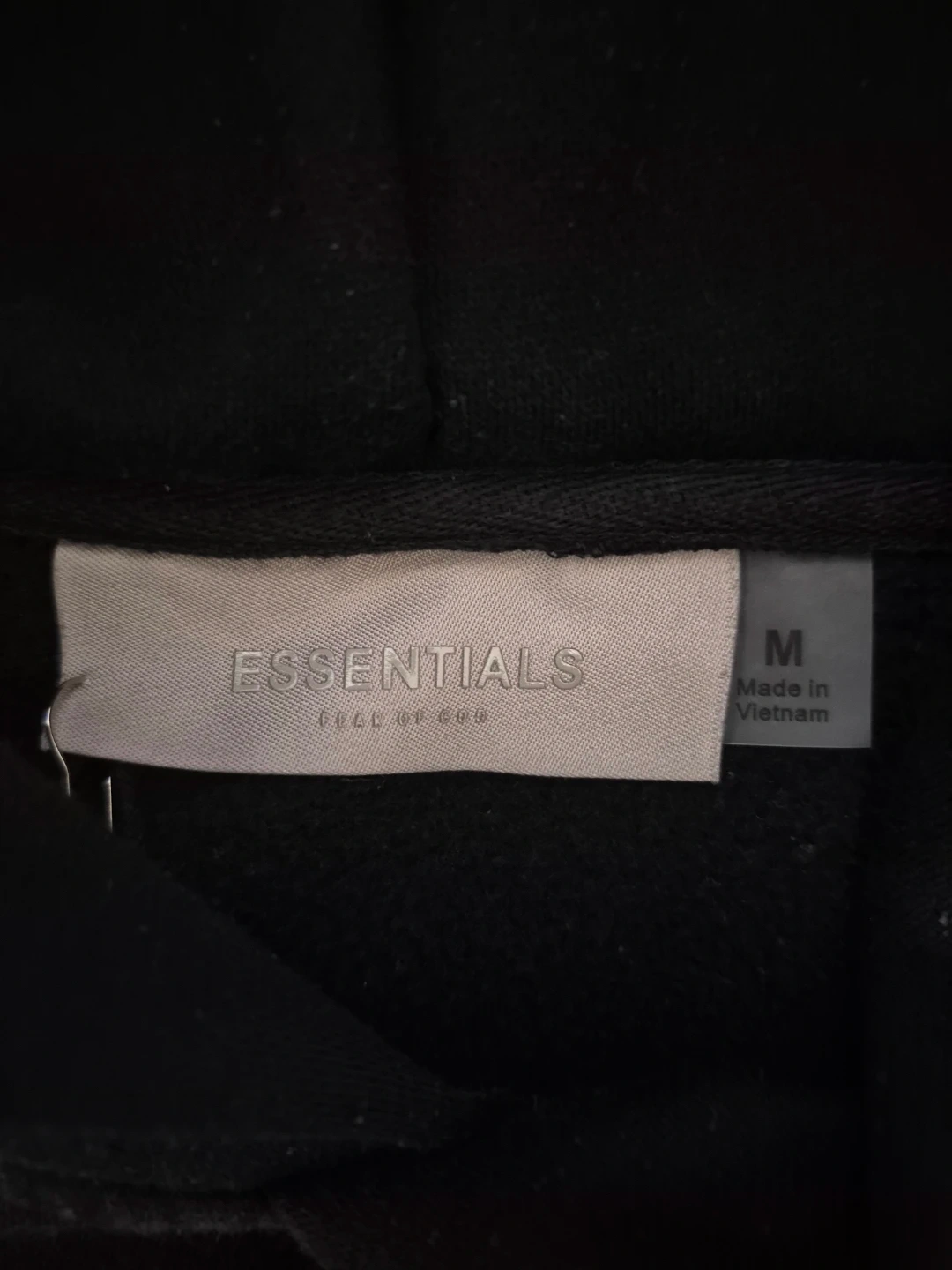 Black Essentials by Fear of God hoodie. Made in Vietnam. Size medium. It's a classic pullover style with a front kangaroo pocket and a drawstring hood. It has the Essentials logo on the chest and a larger graphic on the back.