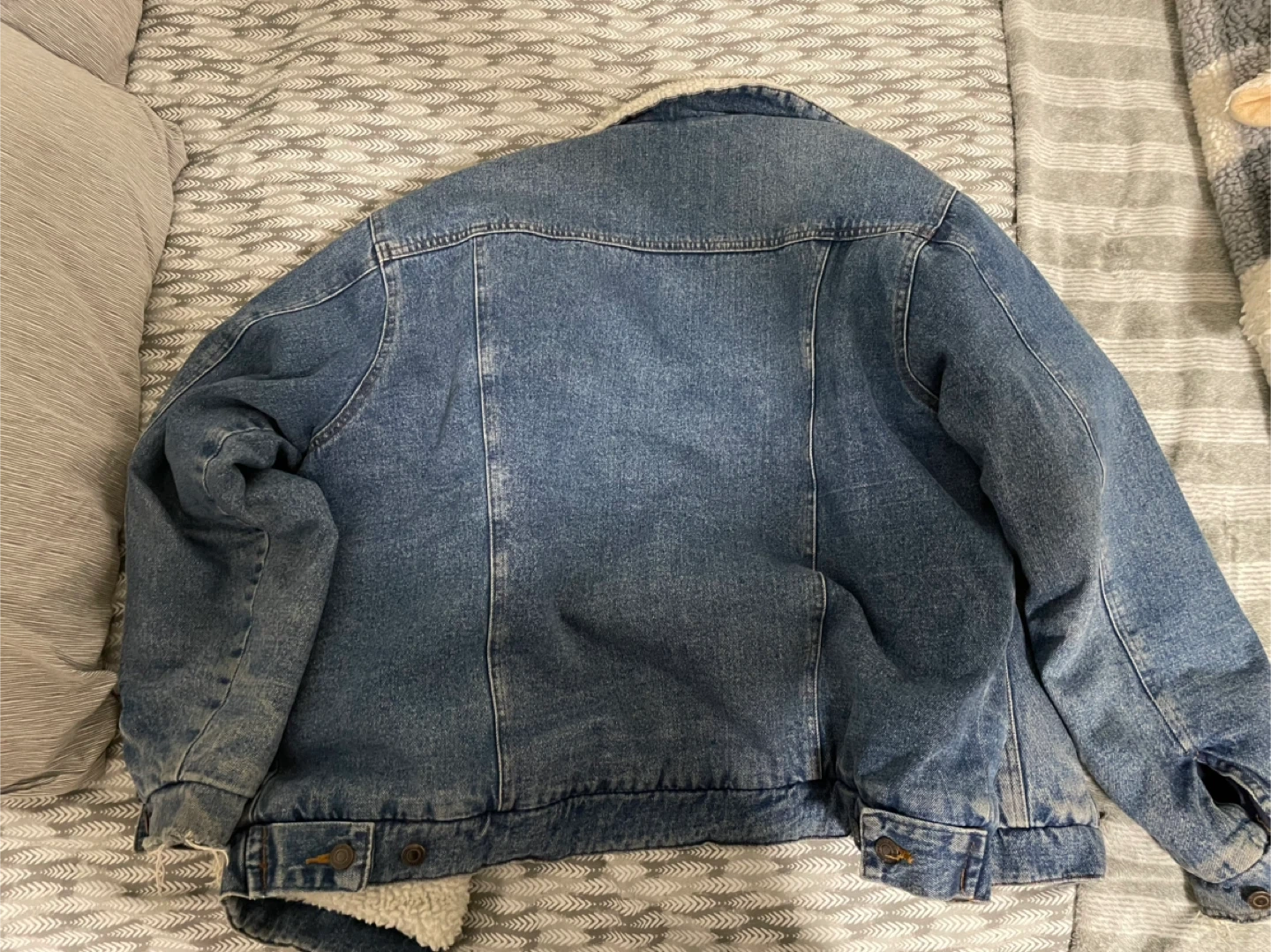 Classic Brittania denim jacket with a warm sherpa lining and collar. Features two chest pockets and two hand pockets. A great outerwear piece for cooler weather!