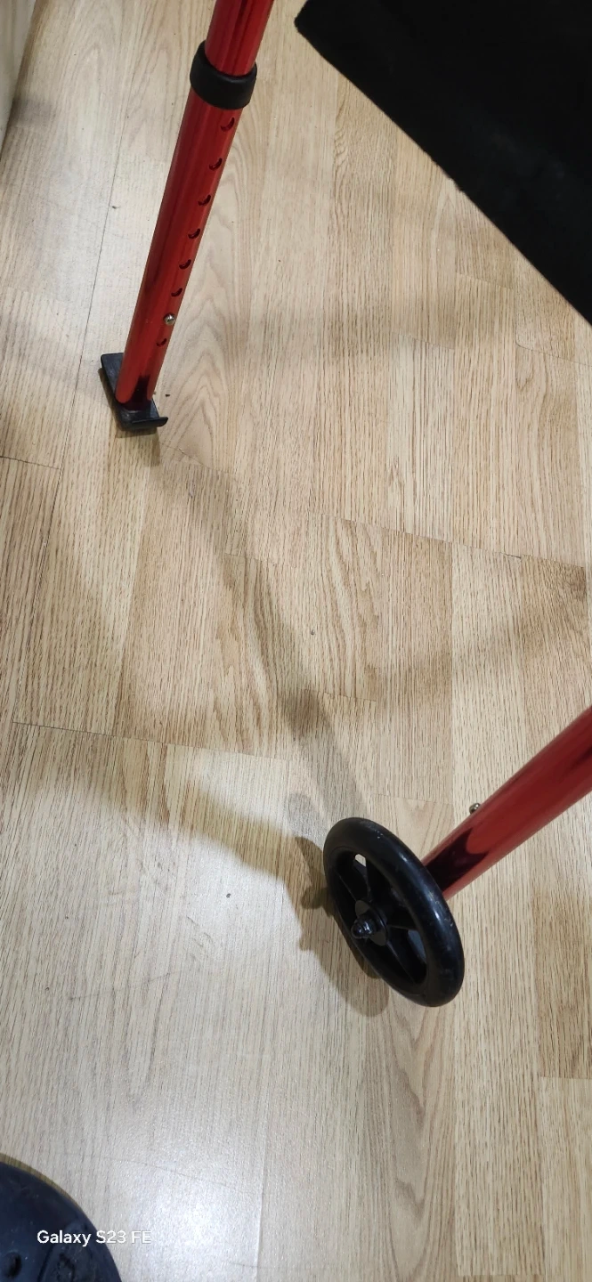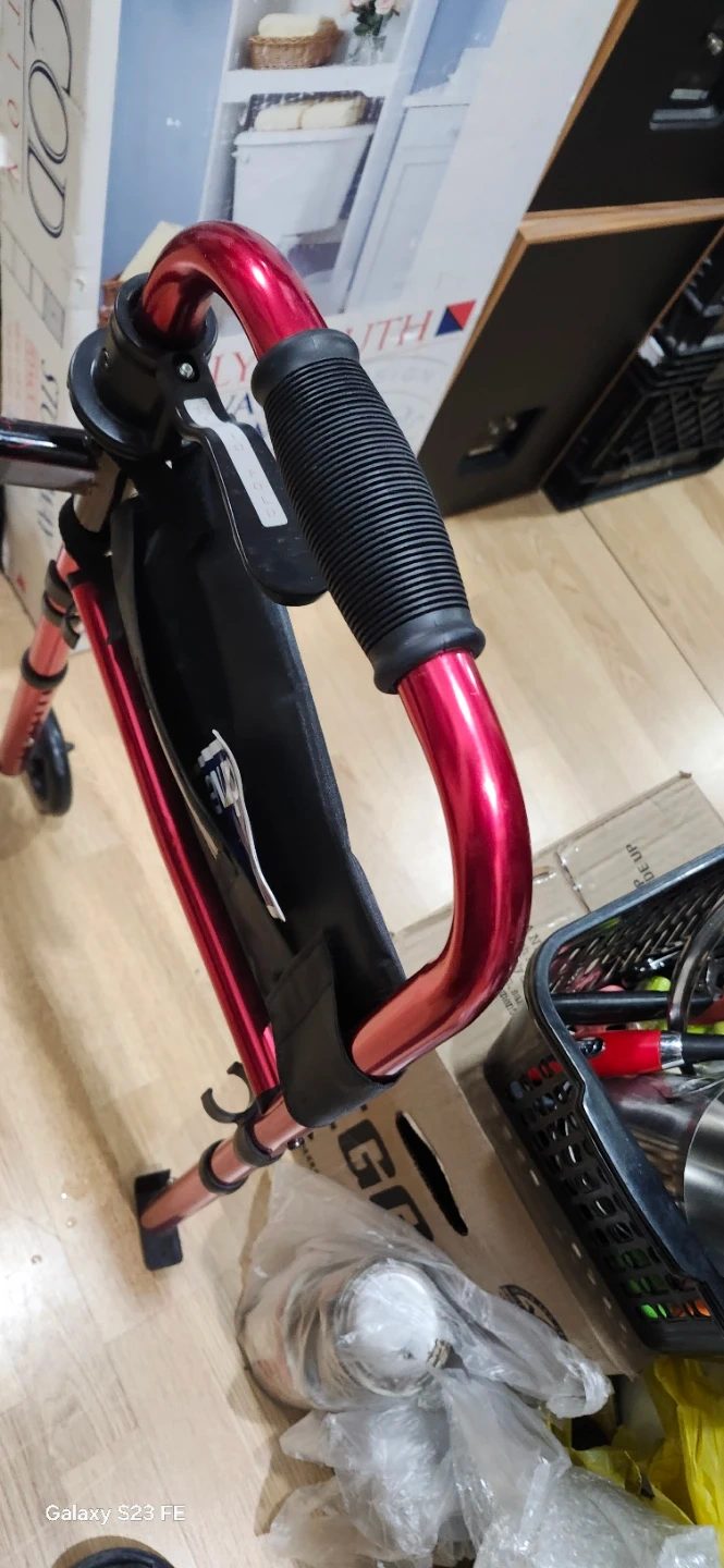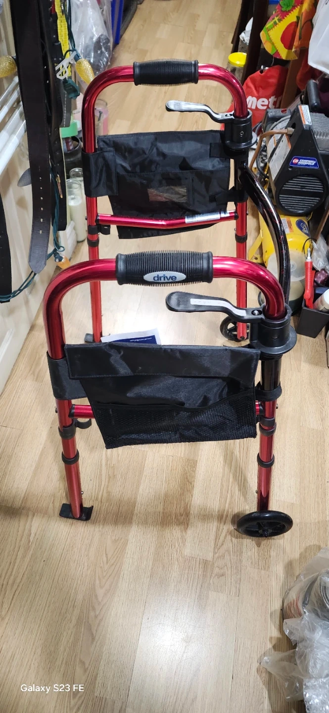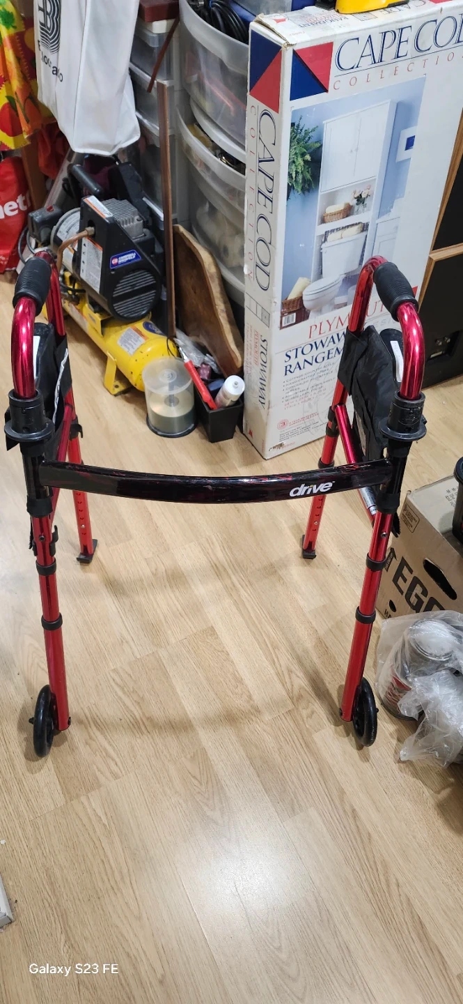 This red aluminum walker by Drive features comfortable grip handles and a convenient storage bag. It's designed for stability and ease of use. Some minor scuffs are visible on the frame. It offers support for individuals needing assistance with mobility. It's a lightweight option for everyday use. Price is firm only cash only pickup no delivery O'Connor drive outside TD Canada Trust bank door East York .