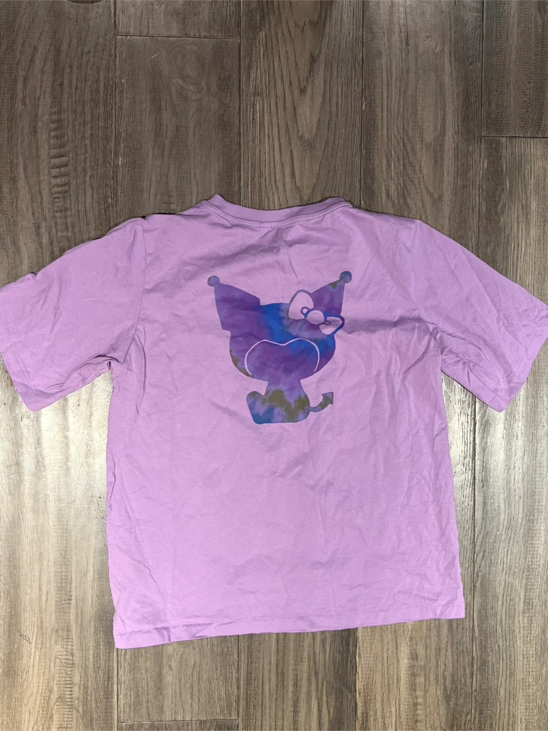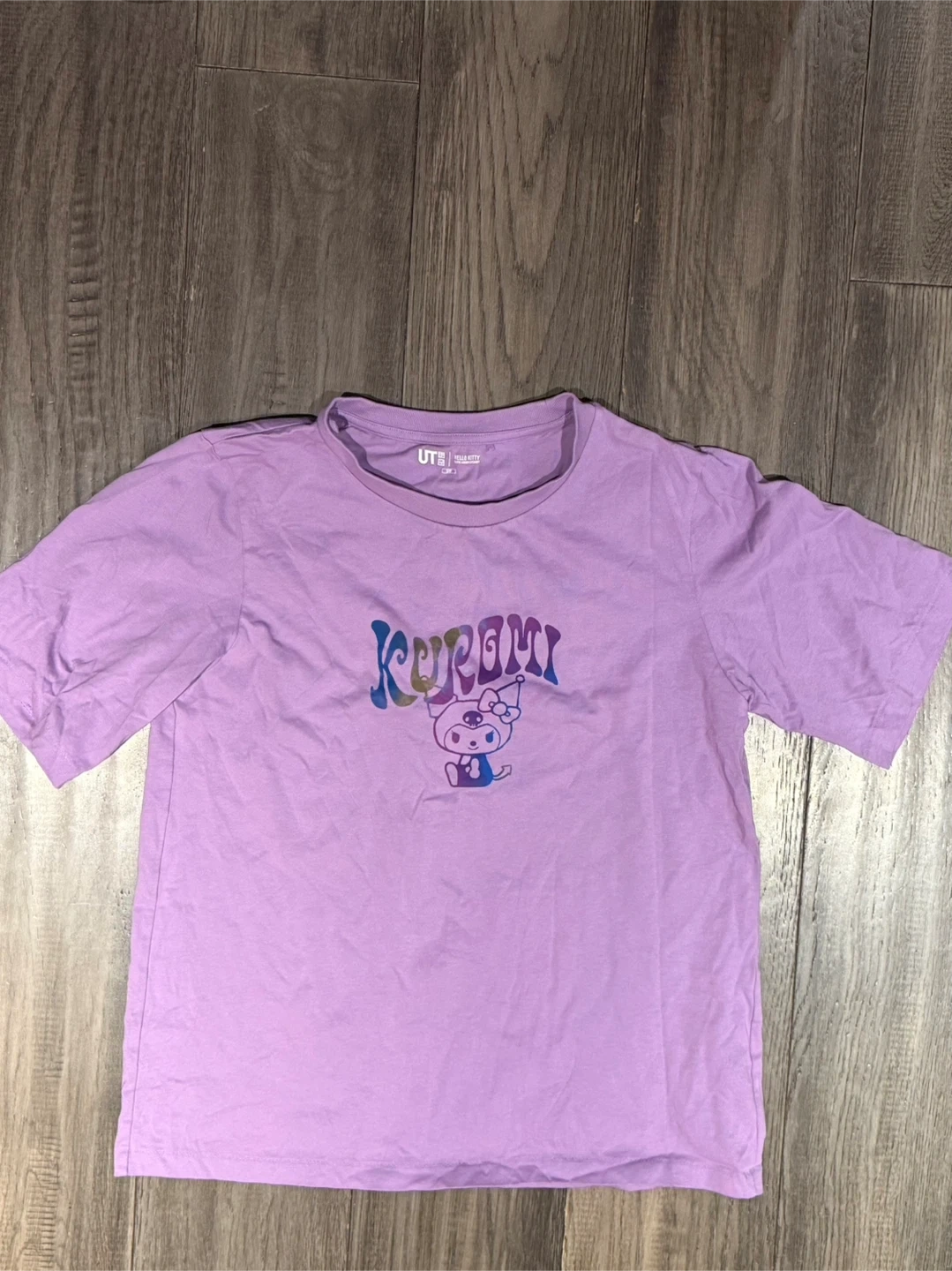 This Uniqlo UT t-shirt features a lavender colour and a fun graphic print on the front. It's made from soft cotton for comfortable wear. The back has a watercolour-style graphic of Kuromi. This shirt is great for casual outings!