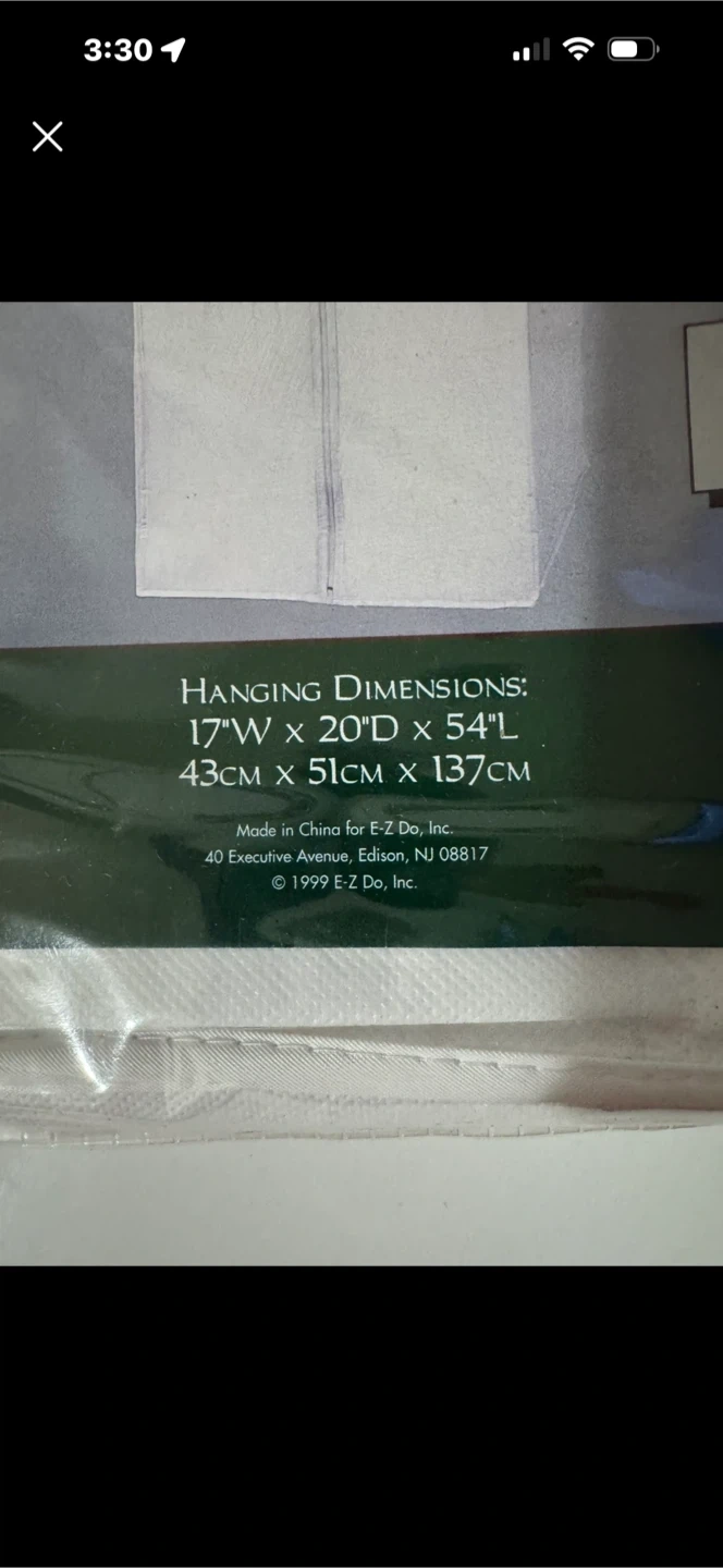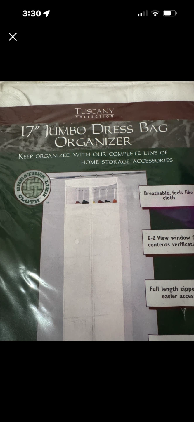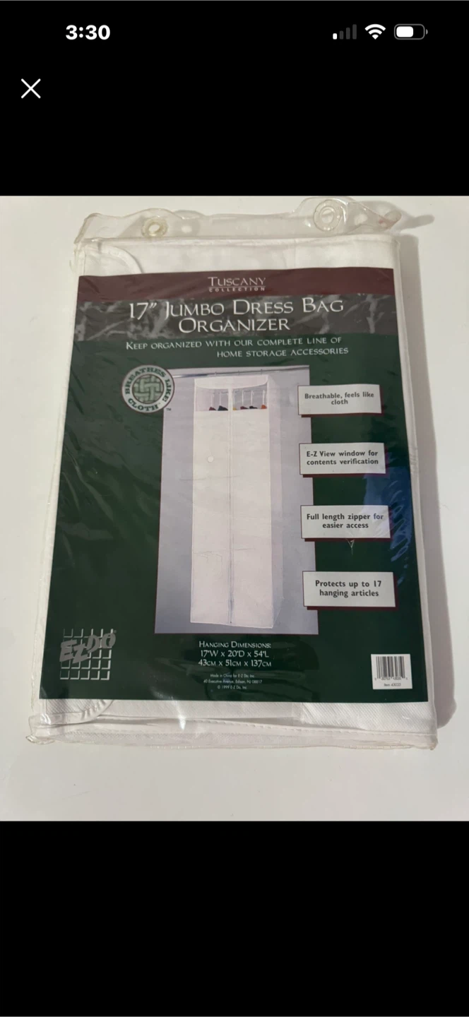 I'm selling a Tuscany Collection 17" Jumbo Dress Bag Organizer. It's designed to keep your clothes organized and protected.