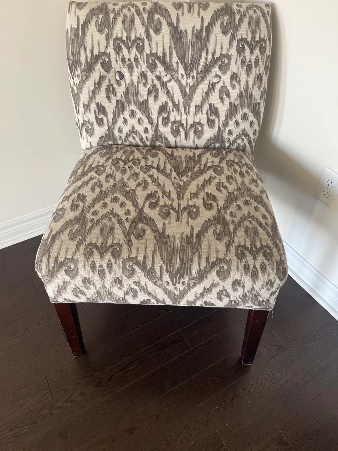 This accent chair features a unique ikat-style pattern in neutral tones. It's upholstered with fabric and has dark wooden legs. This chair's design adds a touch of elegance to any room.