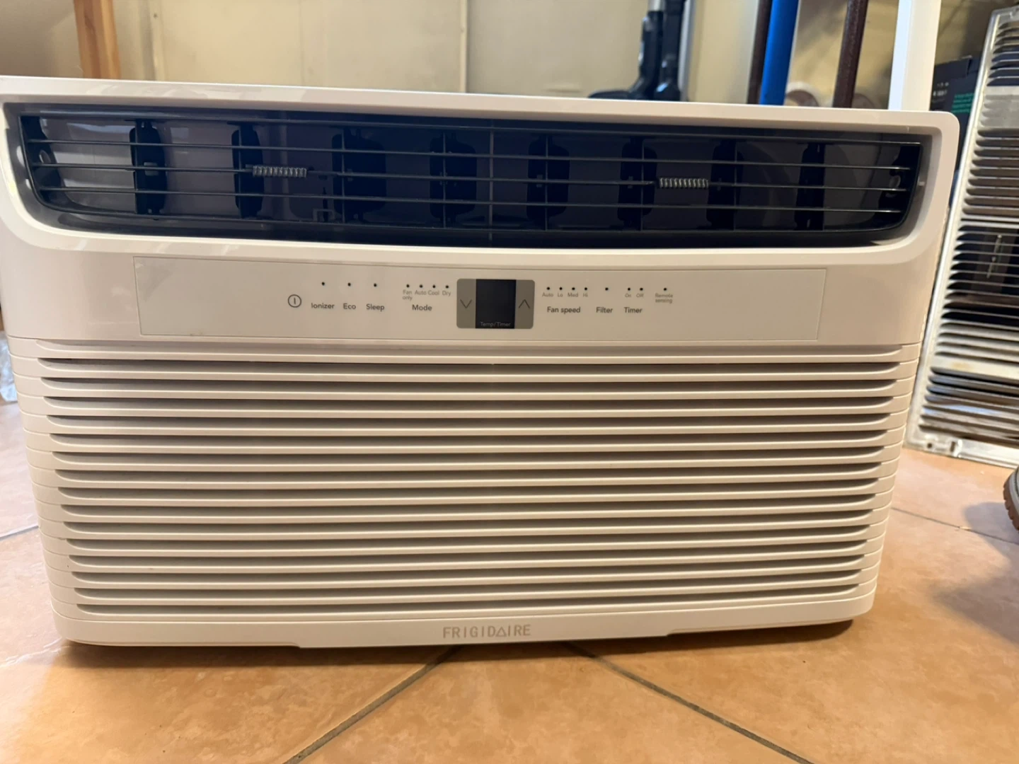 This is a Frigidaire window air conditioner. It features multiple modes including Ionizer, Eco, Sleep, and Timer. The fan speed is adjustable. This unit is great for cooling a room.