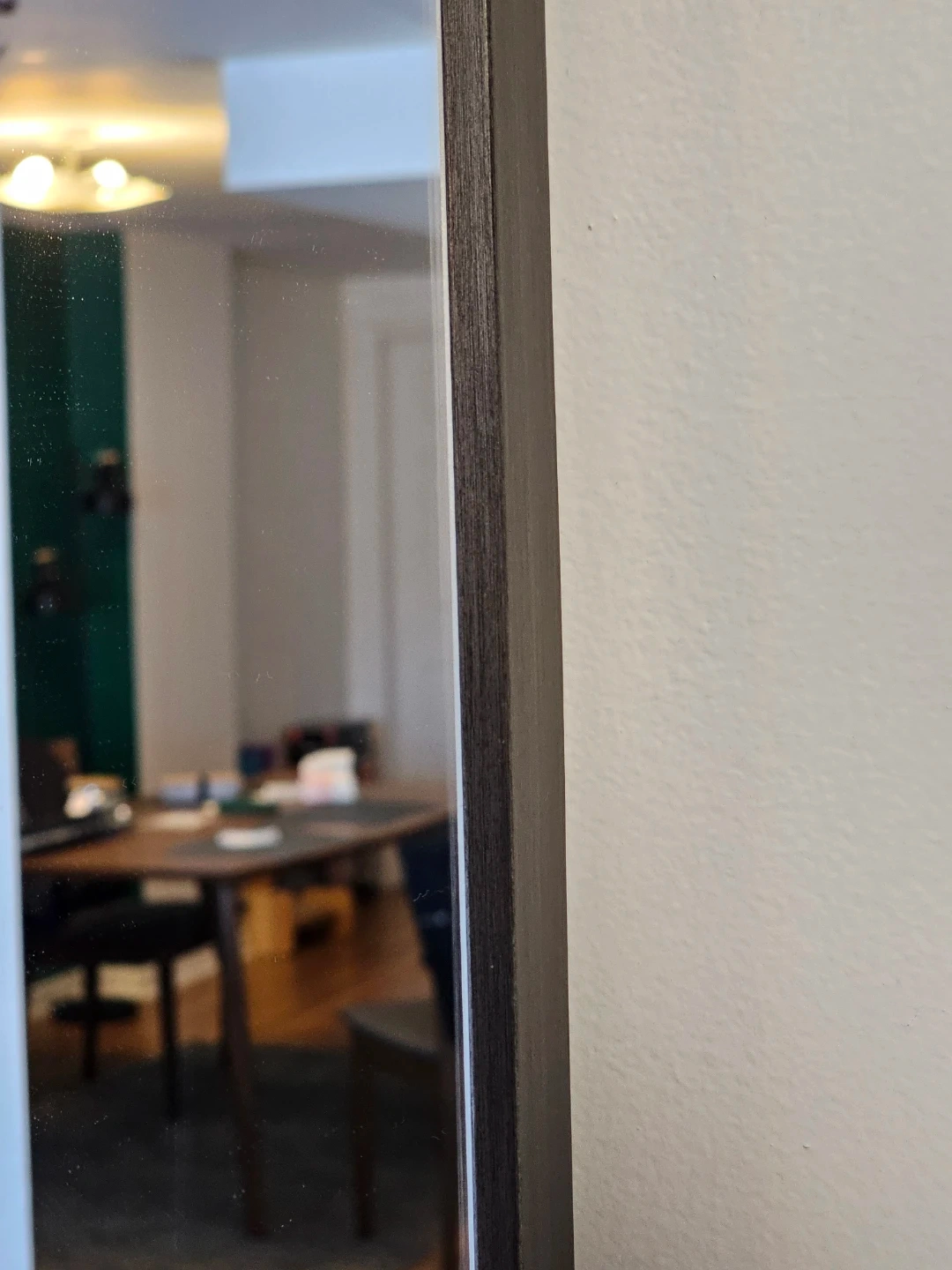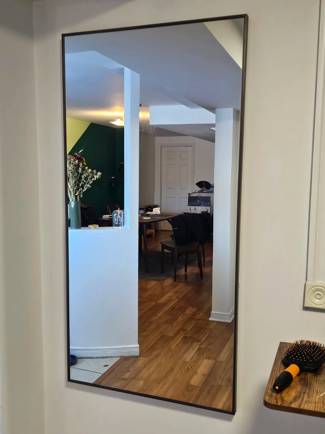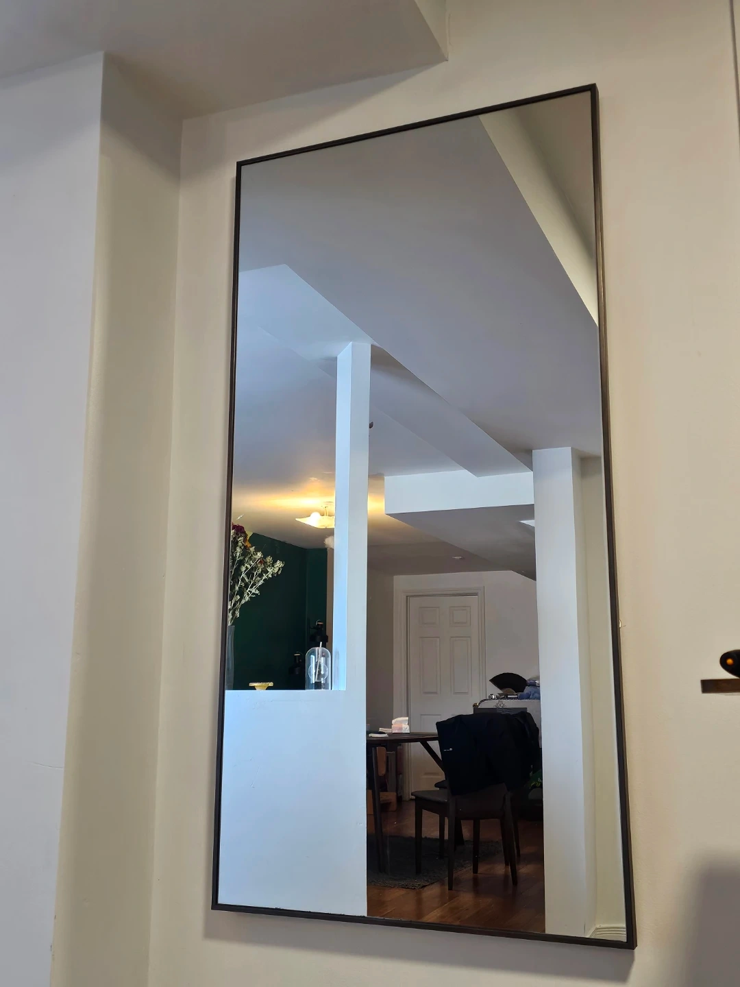 This is a large rectangular mirror perfect for any room. It features a slim, dark-coloured frame for a modern look. Its reflective surface helps to brighten and open up your space.