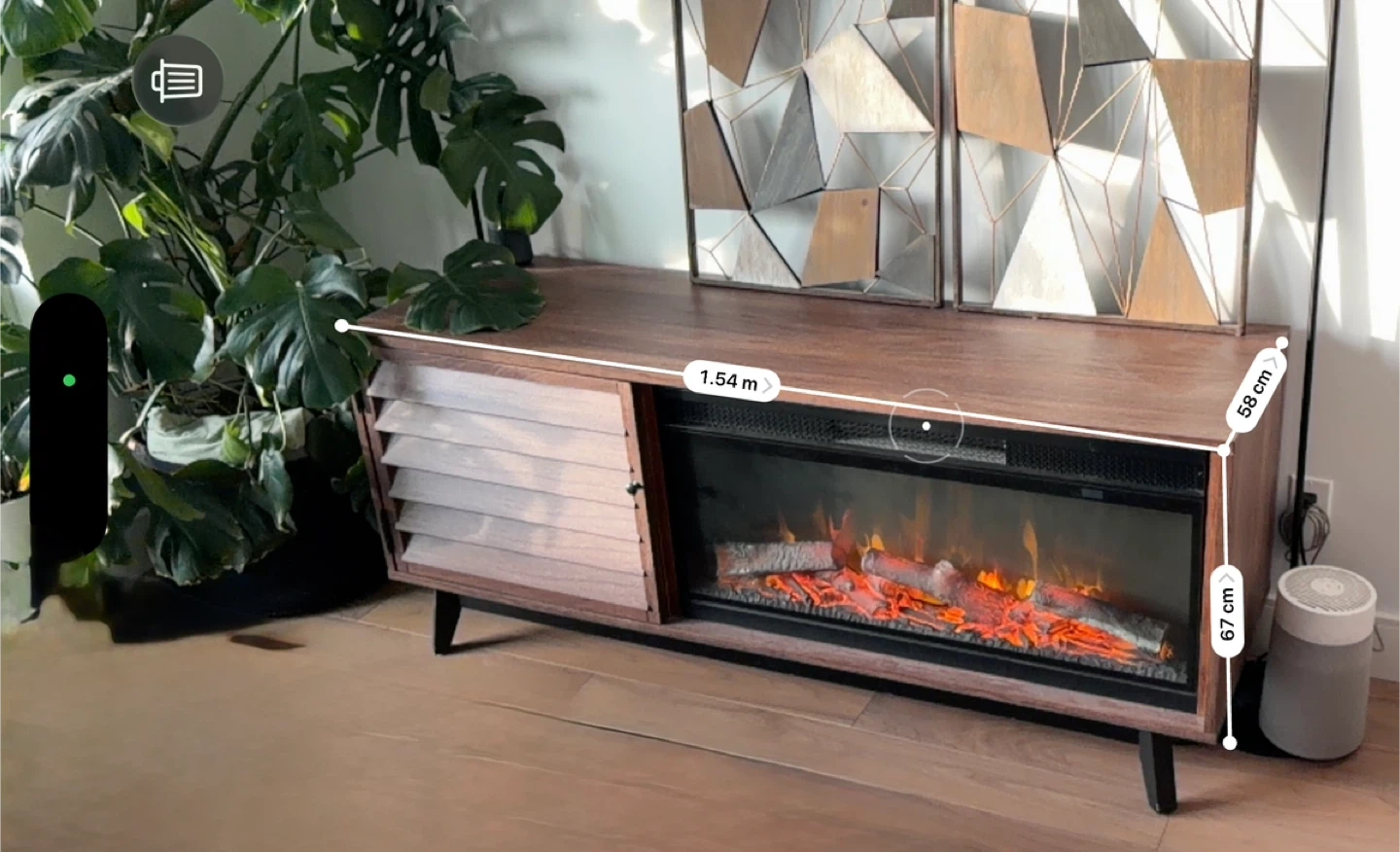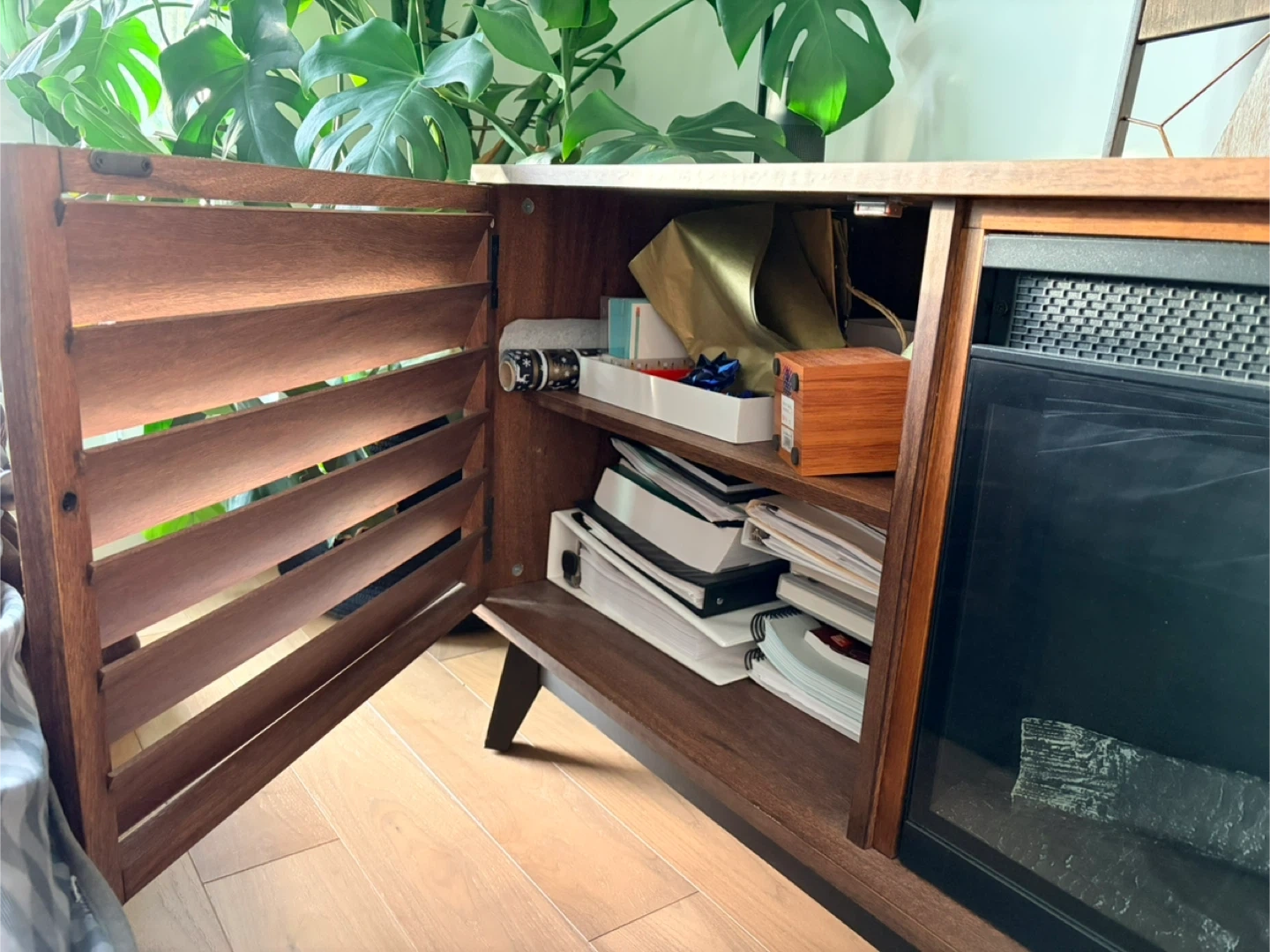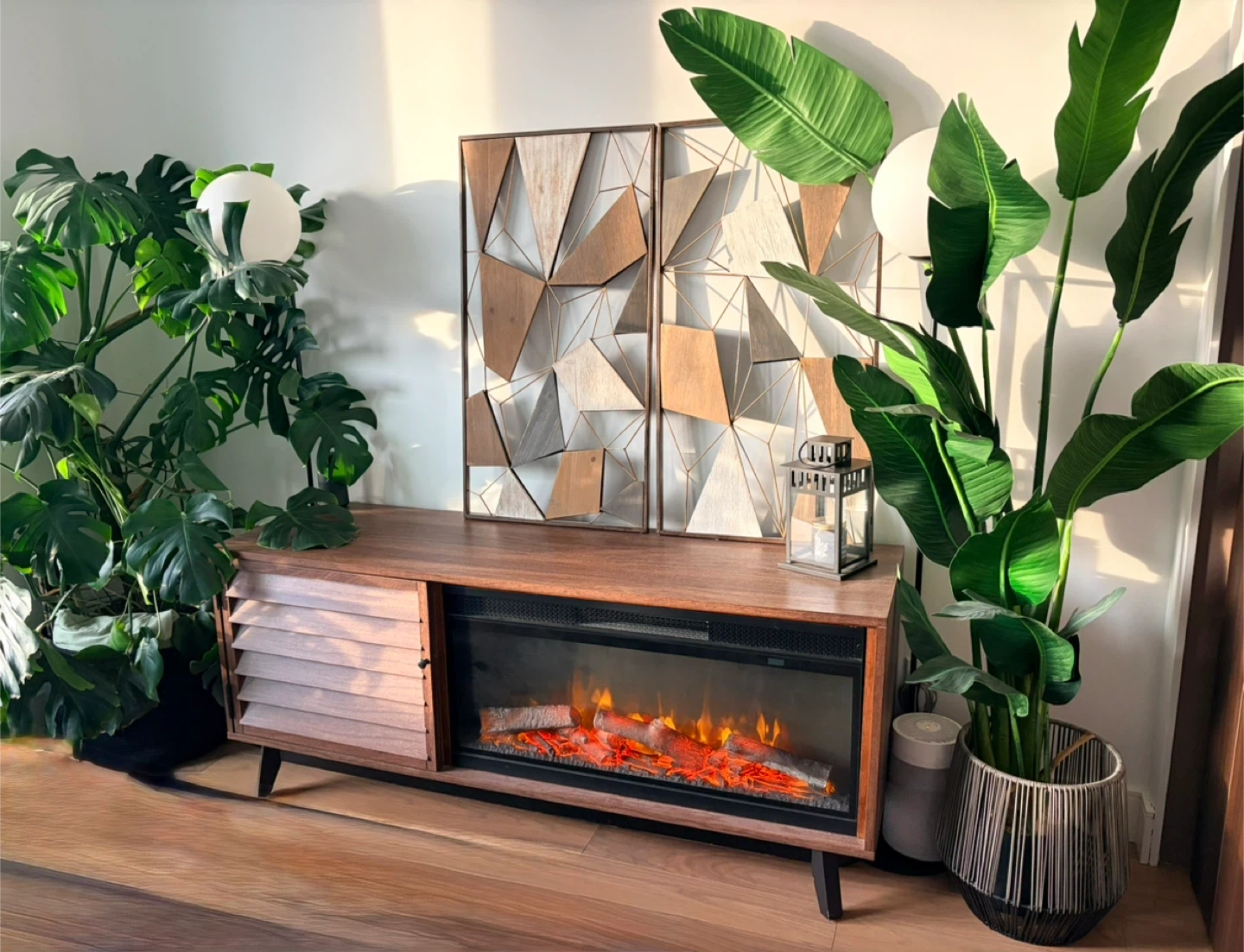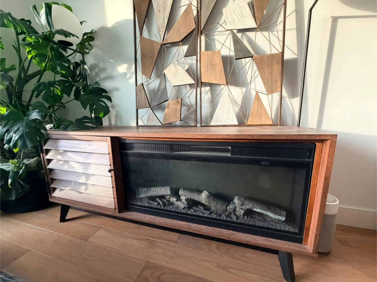A stylish walnut japandi and Mcm wood media console featuring a built-in electric fireplace. It has louvered sliding doors and ample storage space inside. Dimensions are 1.54 m wide, 67 cm high, and 58 cm deep. It's a great addition to any living space!