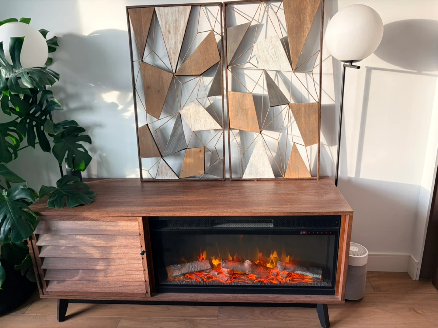 Mcm / japandi Walnut Wood Media Console with Electric Fireplace