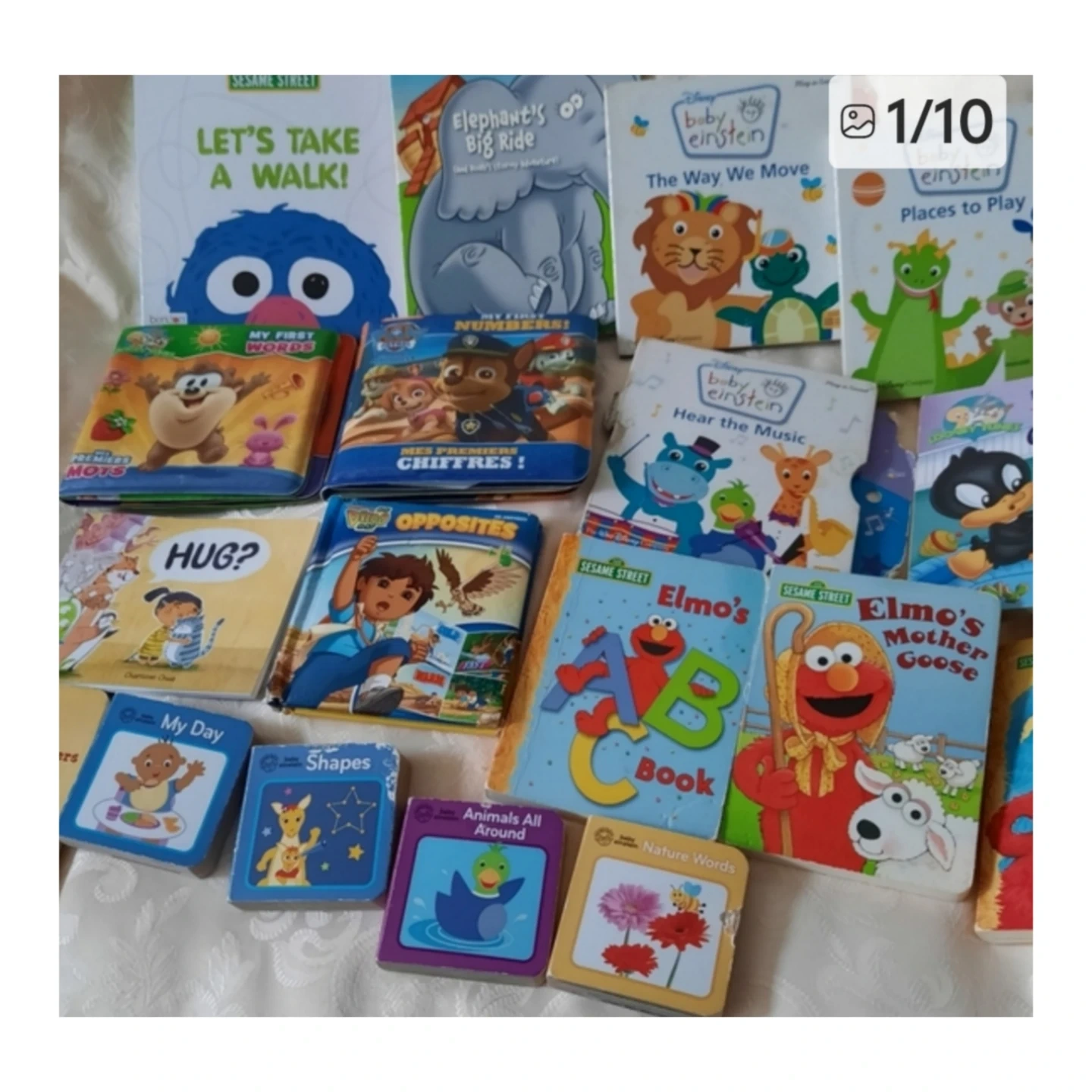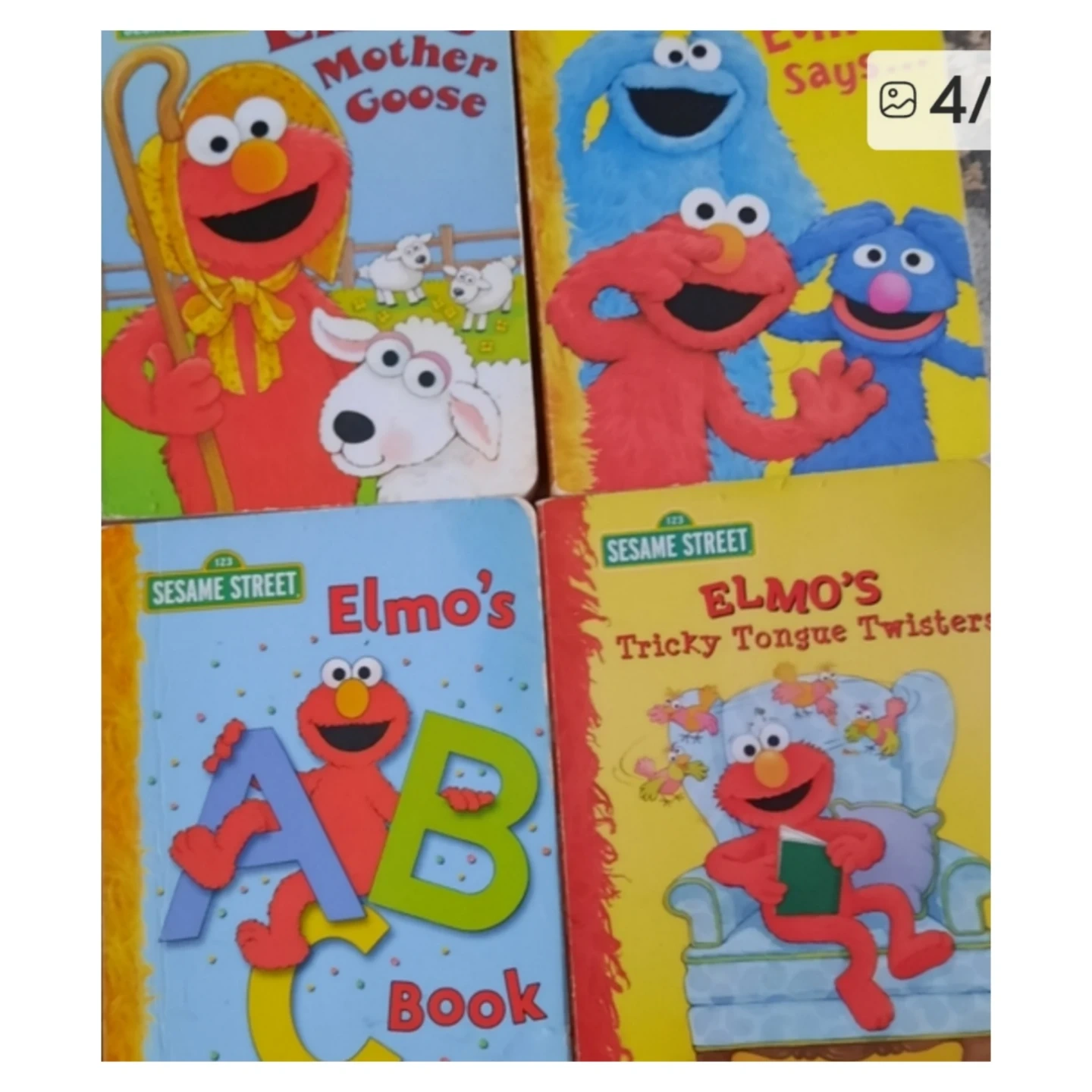 A collection of children's books featuring popular characters like Elmo and from brands like Sesame Street and Baby Einstein. Includes titles such as 'Elmo's ABC Book', 'Mother Goose', and interactive lift-the-flap books. Great for toddlers and young readers!