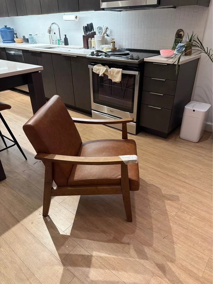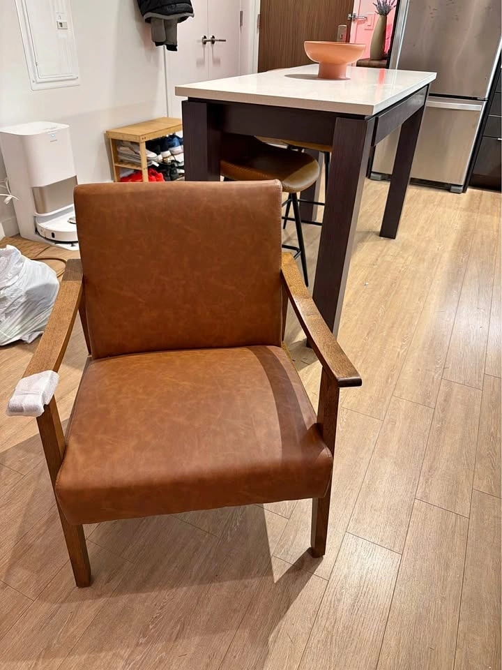 Stylish brown armchair with a nice wood frame and comfy faux leather upholstery. Great for adding a cozy spot to your living room or bedroom. Selling because I can’t fit two of these in my bedroom. Assembled but not used.