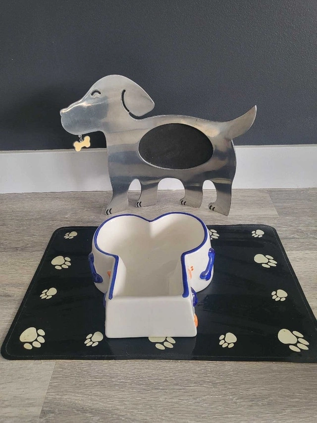 Bowl, pad, and a dog-shape photo frame.