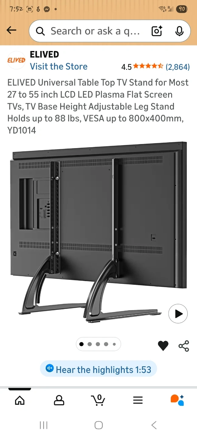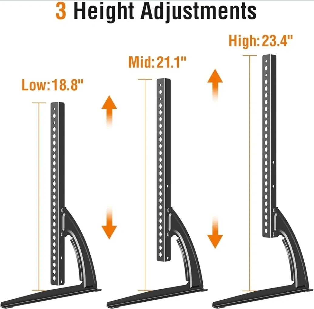 This ELIVED TV stand supports TVs from 27" to 55". It offers three height adjustments: Low 18.8", Mid 21.1", and High 23.4". It holds up to 88 lbs and has VESA compatibility up to 800x400mm. Features non-slip pads to protect surfaces.