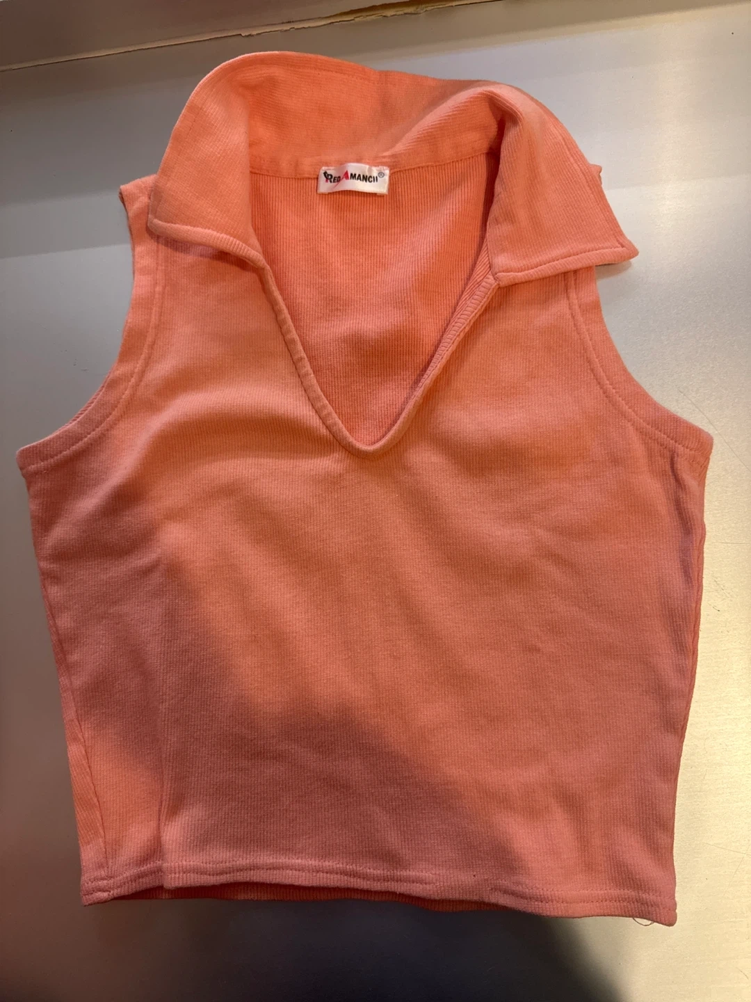 Coral ribbed sleeveless top from Red Mango. It features a collared V-neckline. Cotton blend fabric.