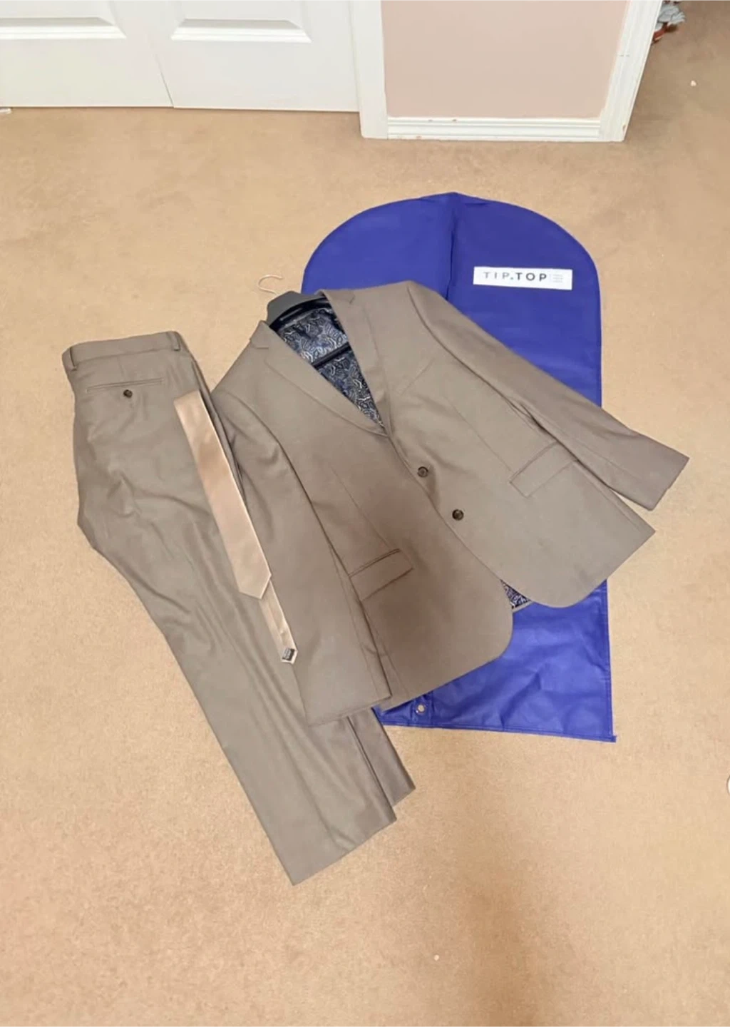 Selling a Tip Top Tailors suit in a taupe colour. It comes with the jacket, pants, and a tie. The suit is in great condition and includes a garment bag for storage
