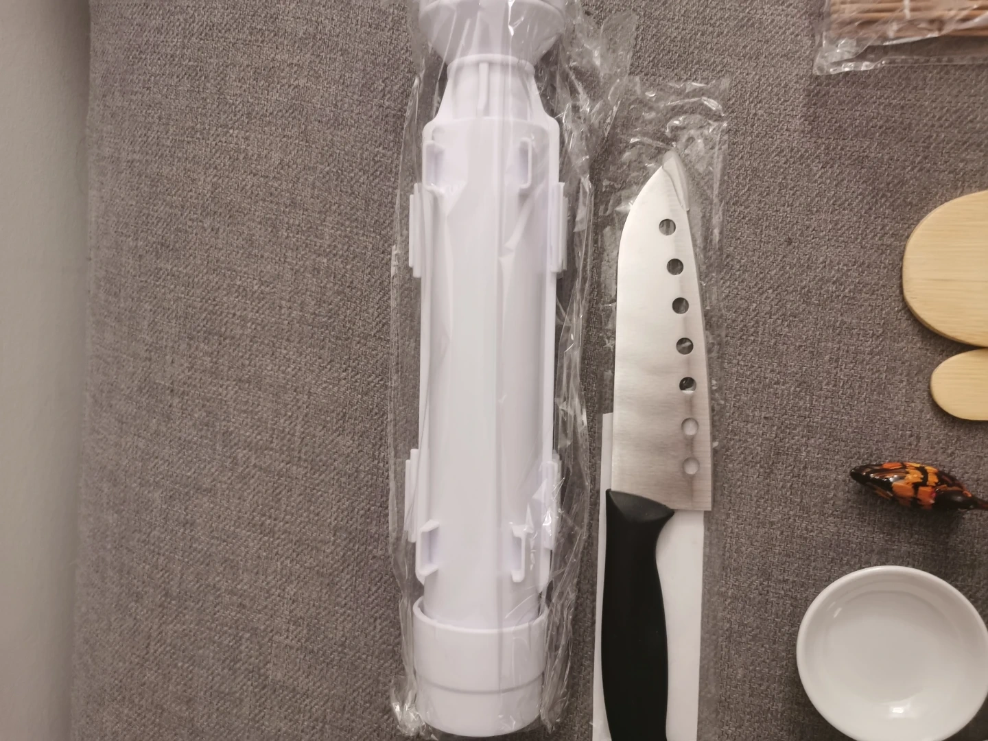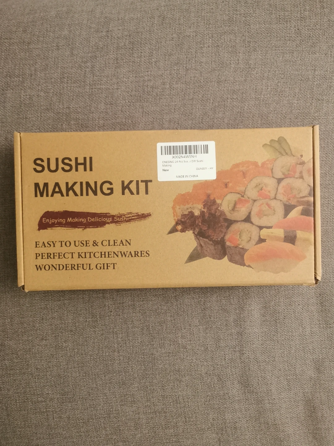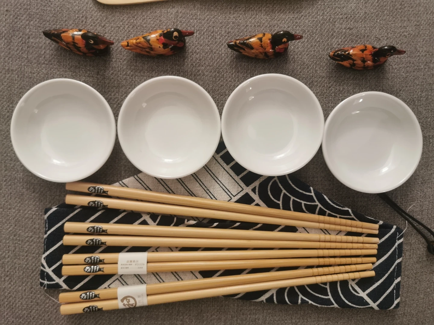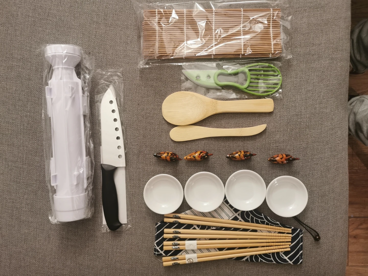 This is a sushi making kit, perfect for home chefs. It includes a rolling mat, rice paddle, spoons, sauce dishes, chopstick rests, and chopsticks. You also get a sushi rice mold and a knife to get you started.