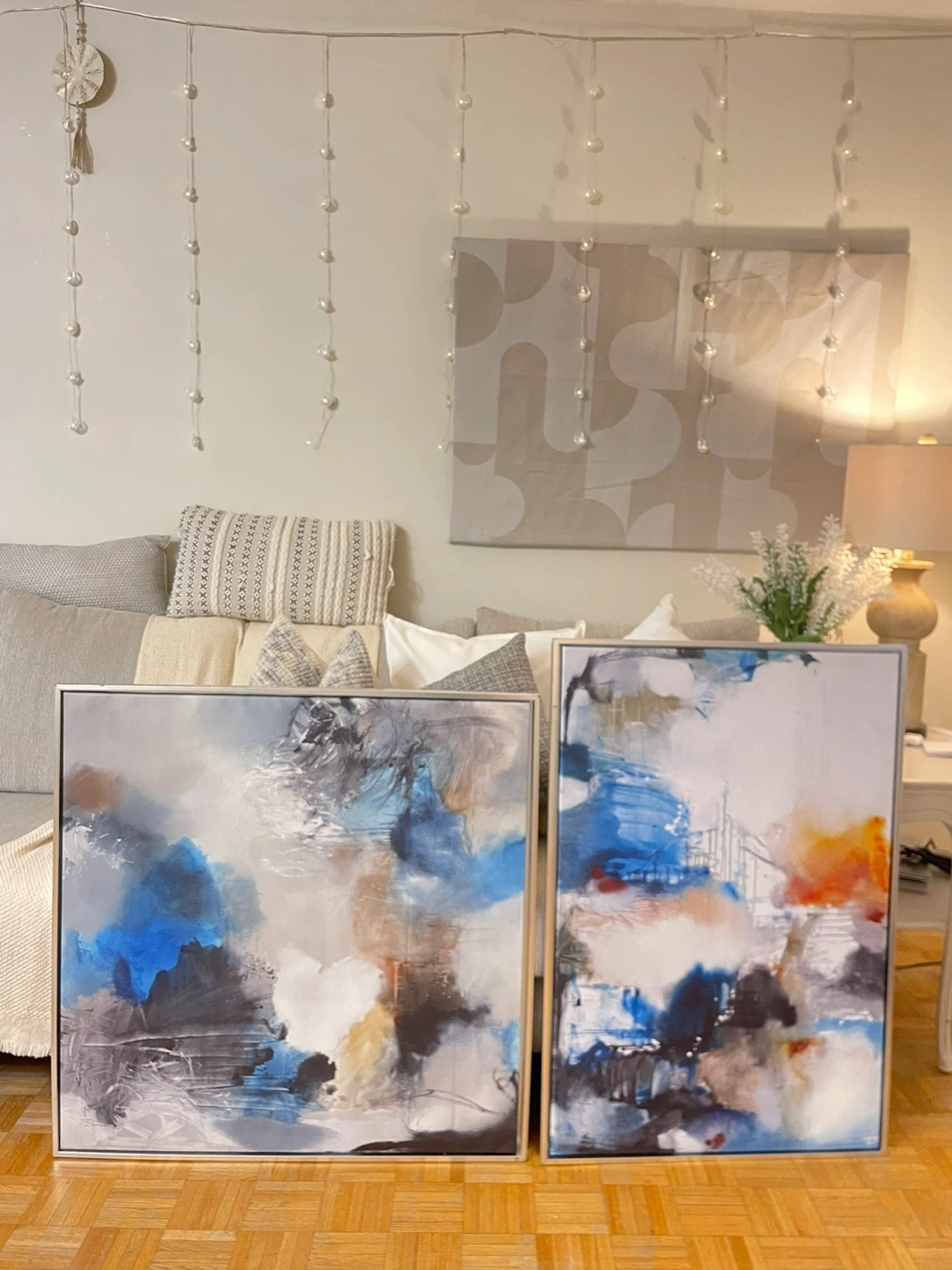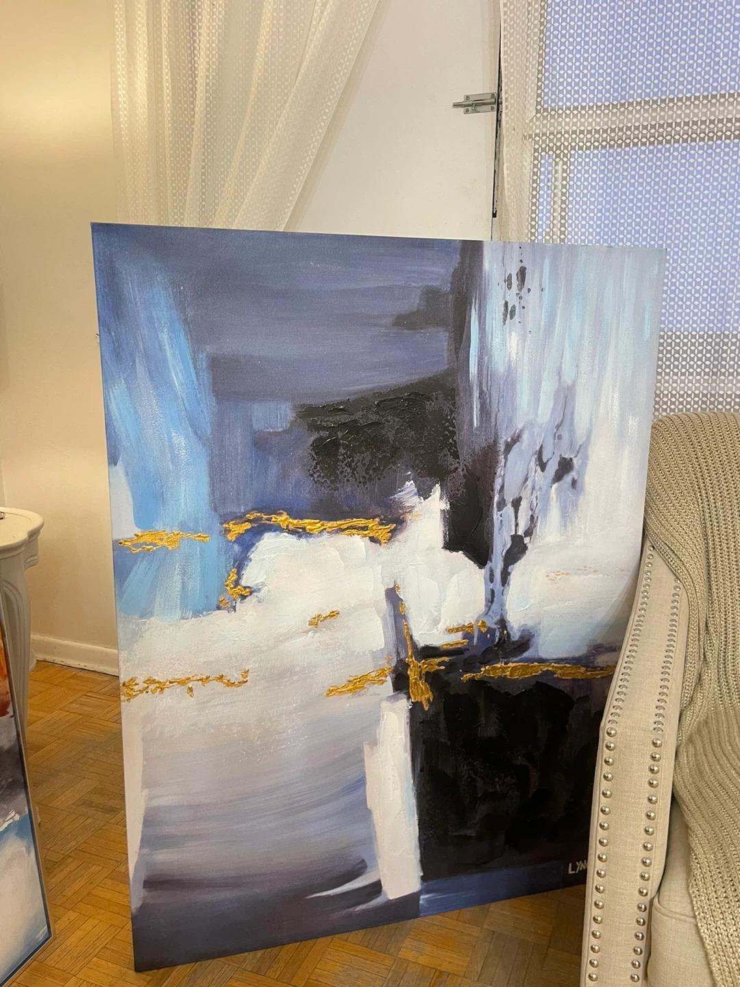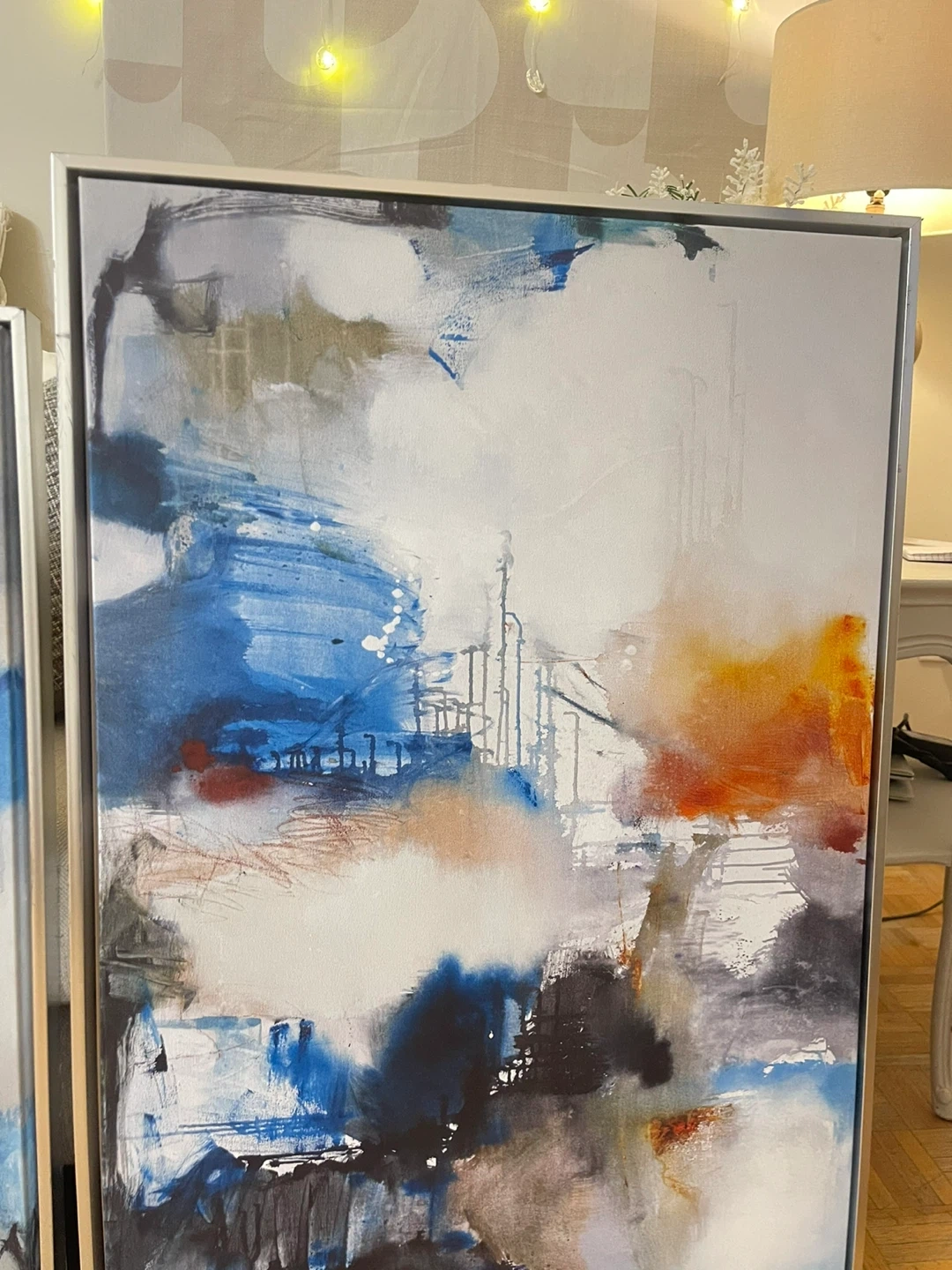 Set of three abstract canvas paintings. Features modern designs with bold colors and metallic accents. Framed and ready to hang! One of them it’s huge silver frame one of them it’s very huge