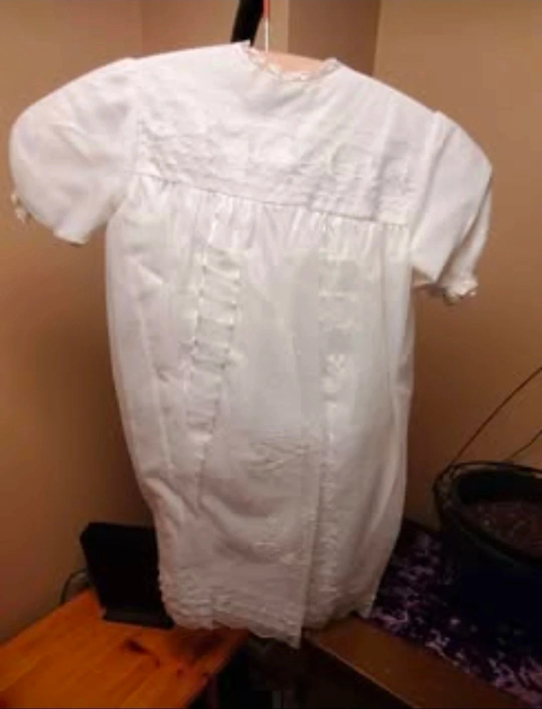 This is a sweet white christening gown and bonnet set for a baby. The gown features intricate embroidery and delicate lace trim. It comes with a matching bonnet, also trimmed with ruffles and lace.