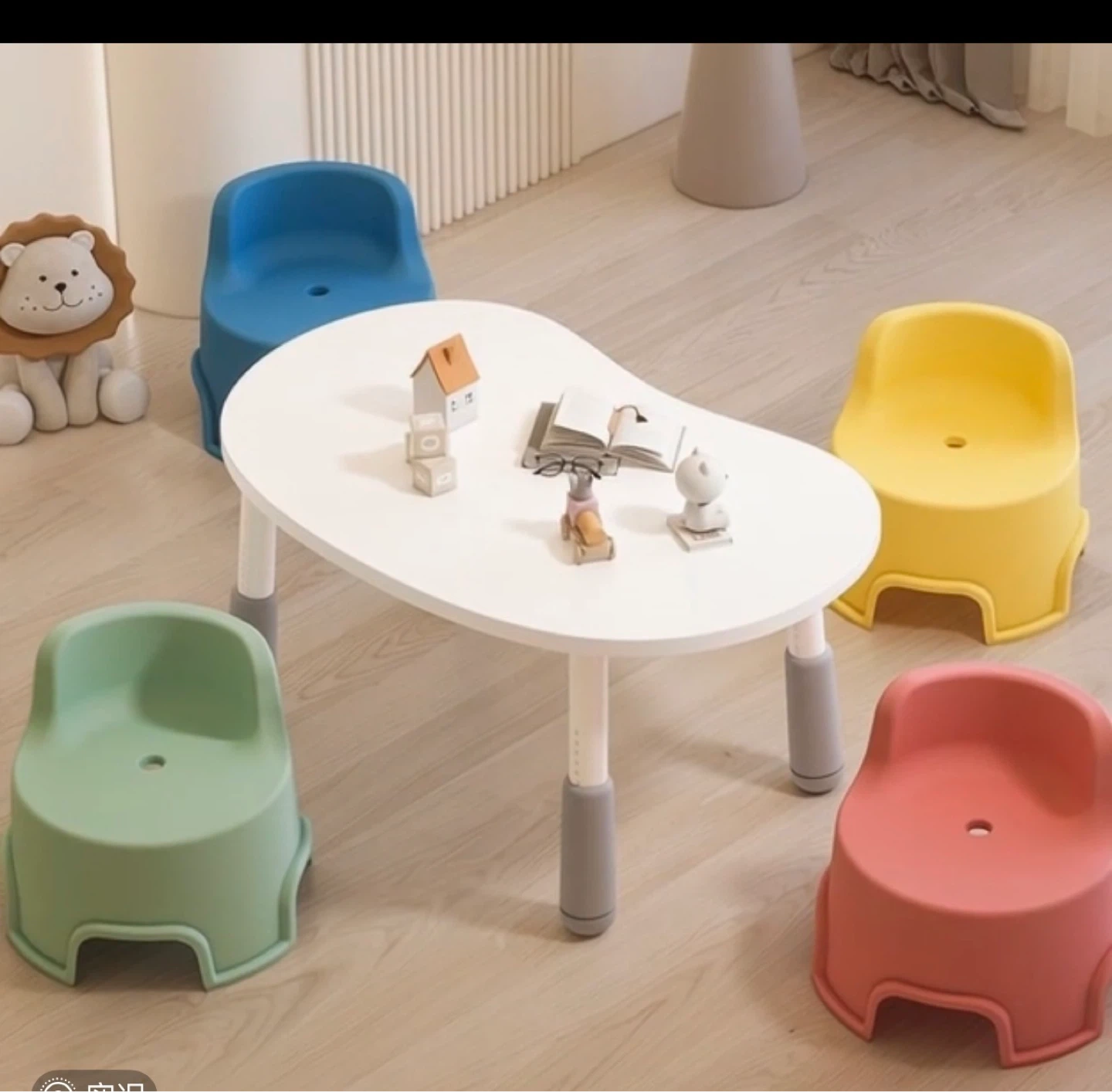 This kids' table and chair set features an adjustable height for growing children. The table legs can be adjusted from 37cm to 46cm. It's suitable for various ages and helps prevent poor posture. Comes with four chairs in assorted colours: pink, blue, yellow, and green.