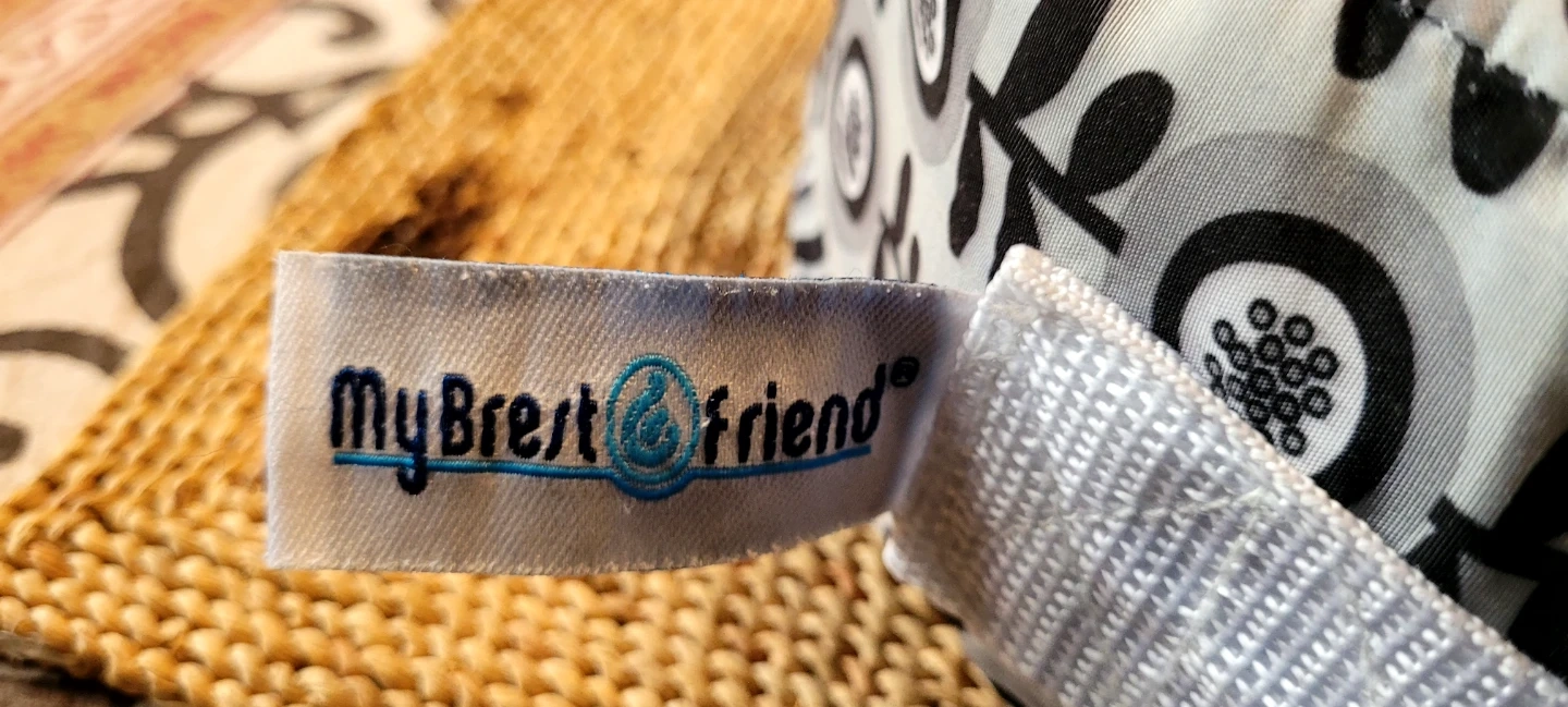 This is a My Brest Friend nursing pillow. It has a unique wrap-around design for comfortable feeding. The cover features a black and white floral pattern.