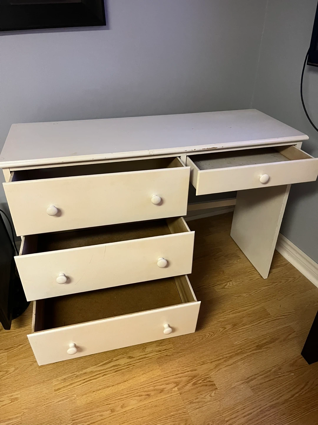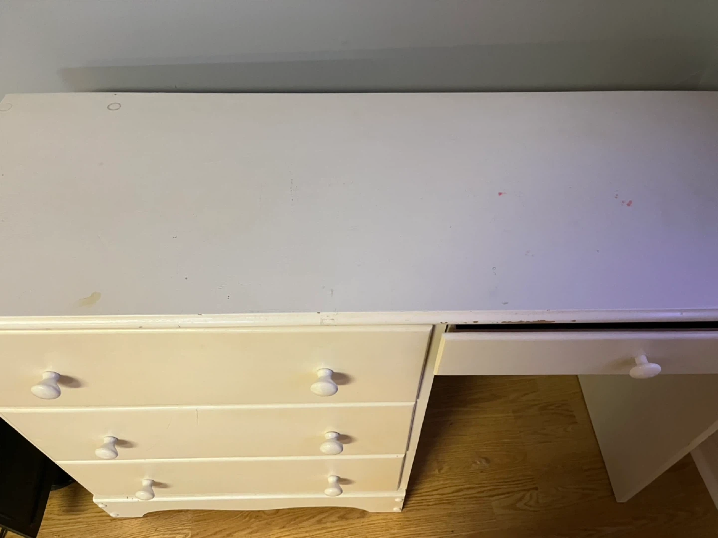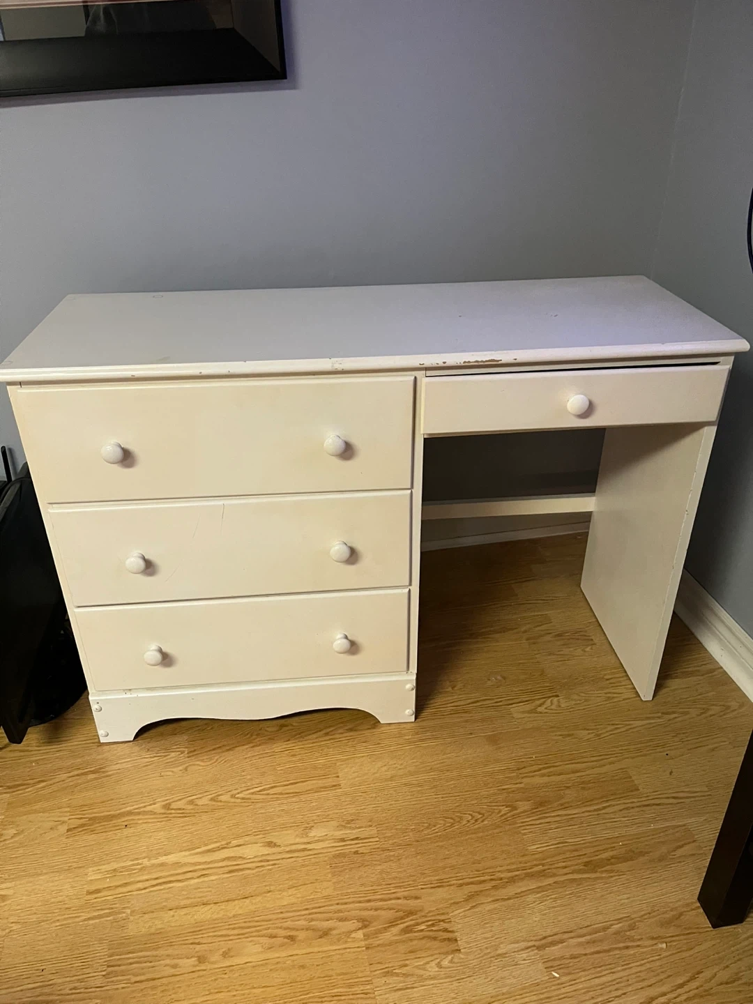 1980s kids white wooden desk, used for many years but still in solid condition. Needs new paint as has scratches and paint chips but would work great right now for any child or as any paint project!