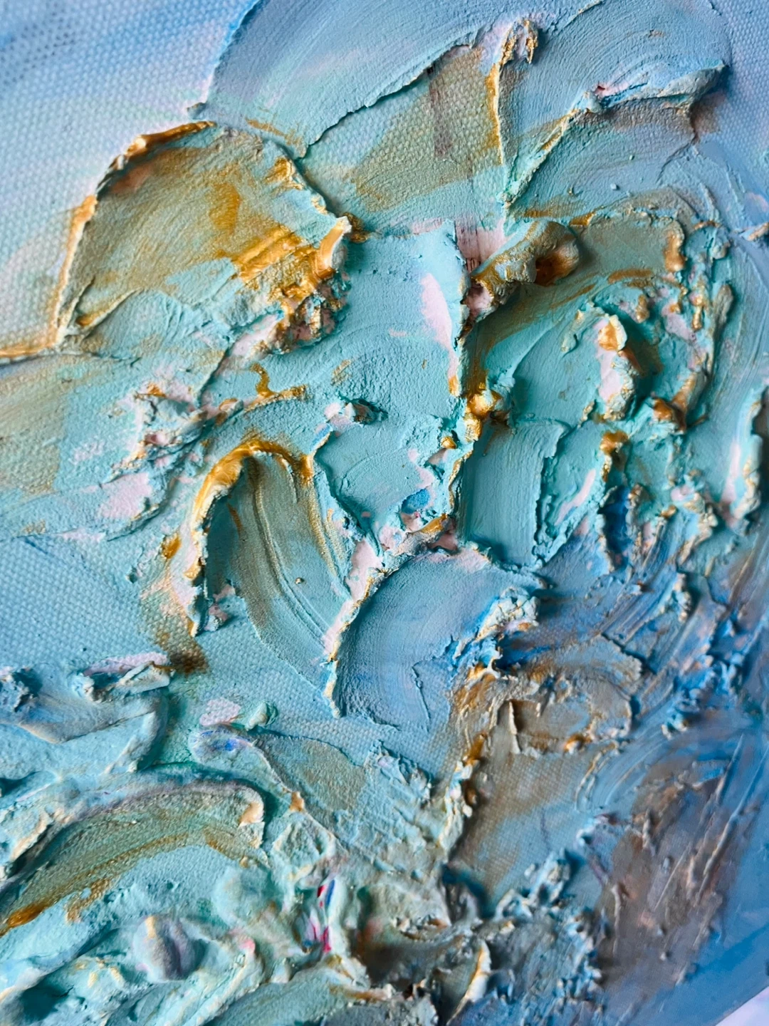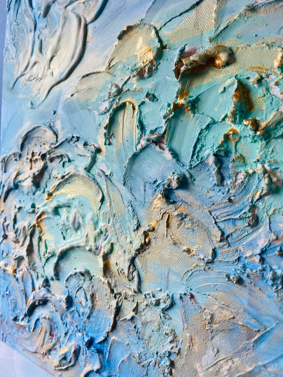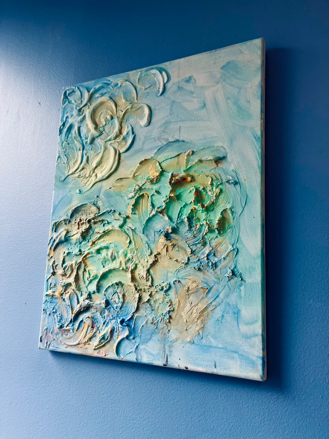 Textured abstract art piece with pastel blue, teal, and gold accents. Heavy impasto technique used for a rich, dimensional effect. Canvas measures approximately 12x16 inches.