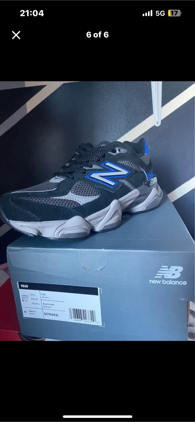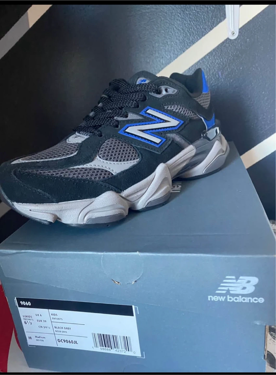 Selling a pair of New Balance 9060 sneakers in black and grey for kids! The size is 6.5 (US Kids). Comes with the original box