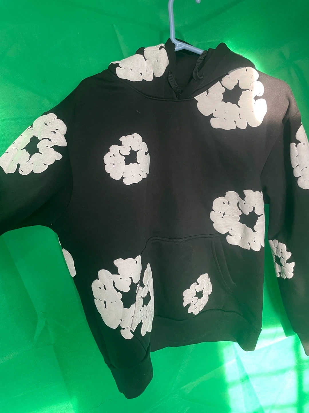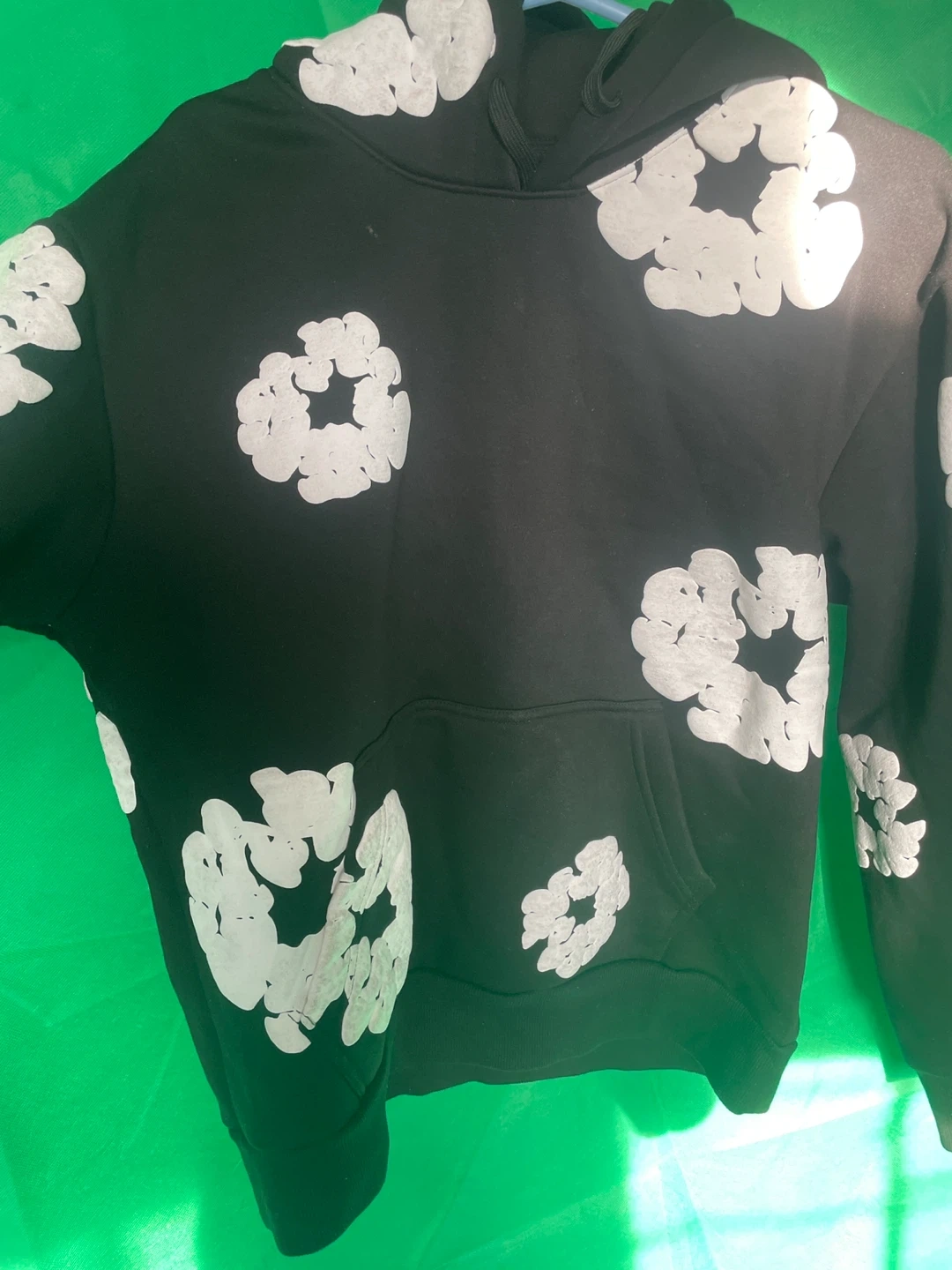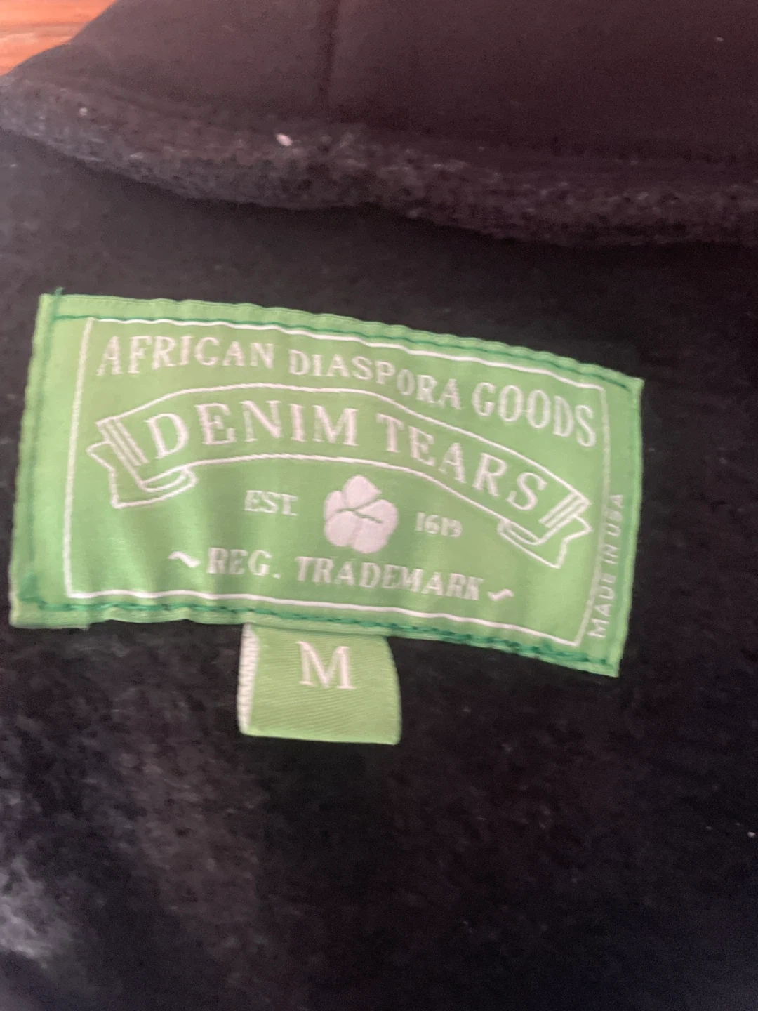 Denim Tears African Diaspora Goods hoodie in black. Features a repeating white floral graphic print. Size medium.