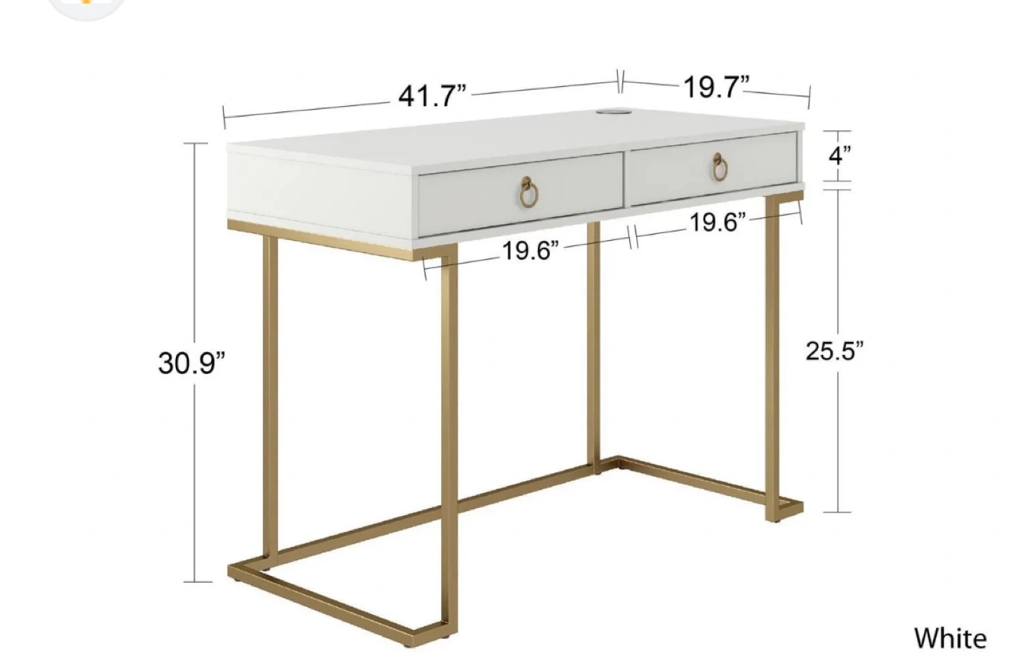Brand New White and gold desk with two drawers and gold ring pulls. It has gold metal legs. Dimensions are 41.7" W x 19.7" D x 30.9" H. Features a built-in wireless charging pad. Comes with built in wireless charger.